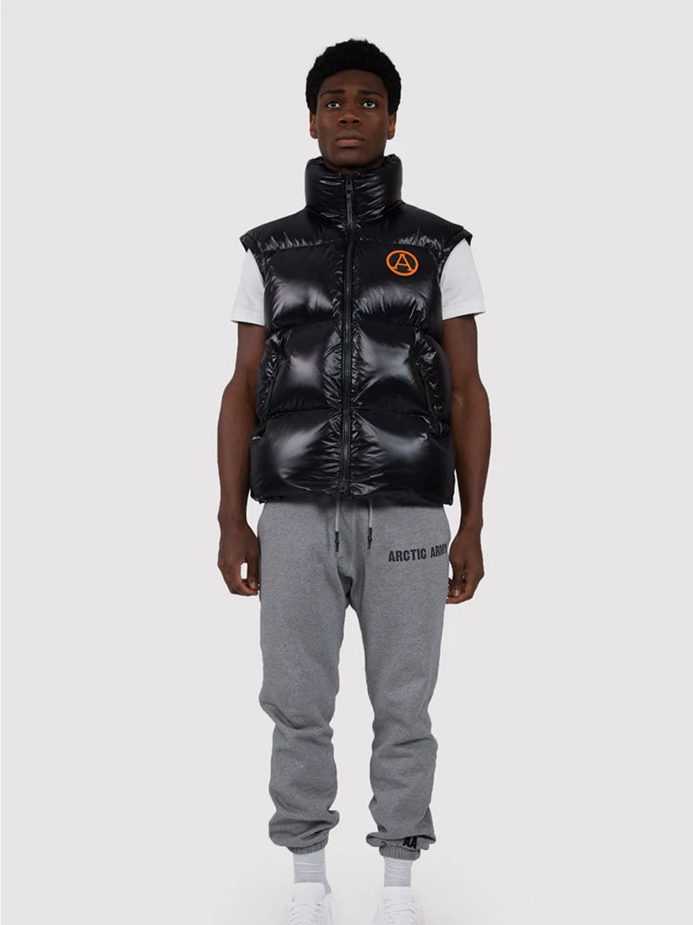The evolution continues with the new Arctic Army gilet. Constructed from feather-light, smooth and glossy nylon ciré and injected with 'Responsible Down Standard' (RDS) high-volume down fill. Exterior zip secure pockets are lined in fleece for ultimate comfort. Engineered for a layered look, the men's gilet is accented with the Arctic Army soldier beetle badge.
