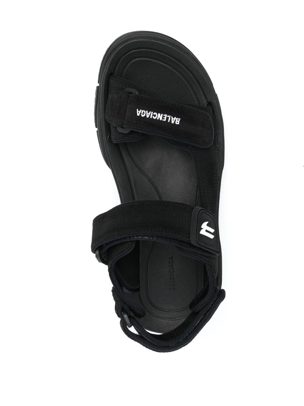 Tourist logo touch-strap sandals from BALENCIAGA featuring black, embroidered logo, logo print to the side, front touch-strap fastening, open toe, moulded footbed, elasticated slingback strap, rear touch-strap fastening and rubber sole.