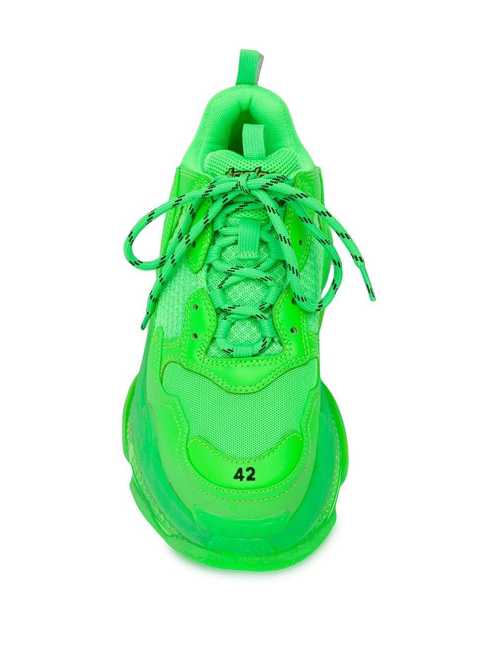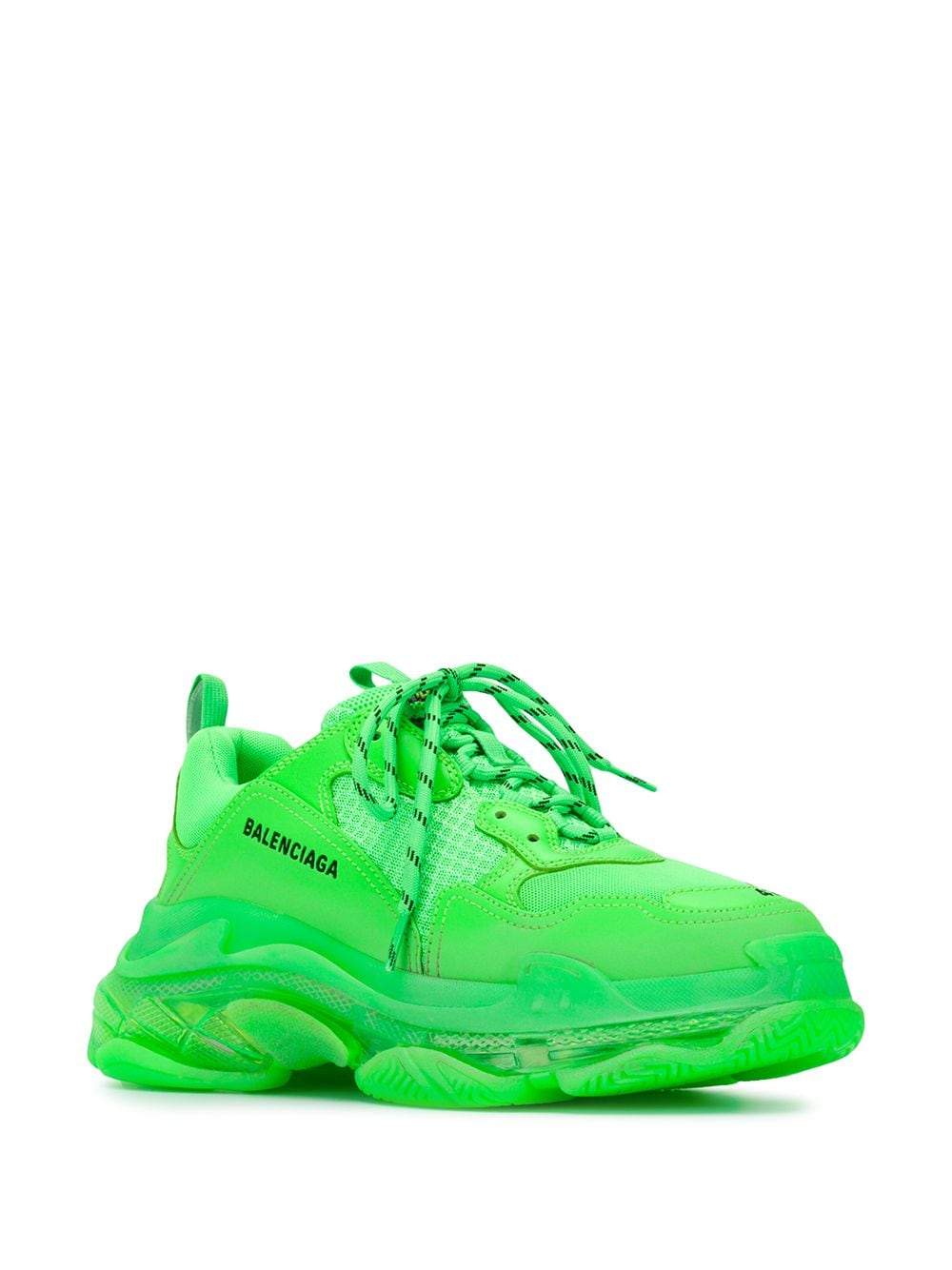 It is no surprise that anything Balenciaga conjures up rises to cult status. This season, expect more iconic handbags, contemporary footwear with a retro feel and logo-sprawled surfaces. Case in point: the iconic Triple S sneakers in neon green. Elegant and rebellious in equal parts. Featuring a round toe, a lace-up front fastening, a logo to the outside, an embossed logo, Complex 3-layered clear sole, biologic laces recalling hiking boots’ laces and washed effect.