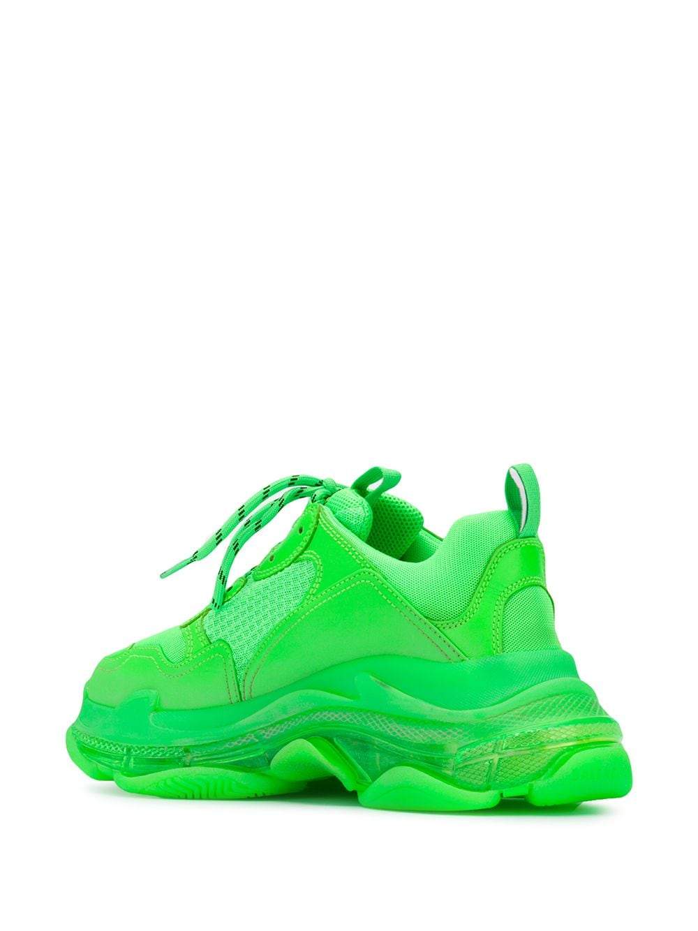 Regular price Dhs. 3,007.00 AEDIt is no surprise that anything Balenciaga conjures up rises to cult status. This season, expect more iconic handbags, contemporary footwear with a retro feel and logo-sprawled surfaces. Case in point: the iconic Triple S sneakers in neon green. Elegant and rebellious in equal parts. Featuring a round toe, a lace-up front fastening, a logo to the outside, an embossed logo, Complex 3-layered clear sole, biologic laces recalling hiking boots’ laces and washed effect.