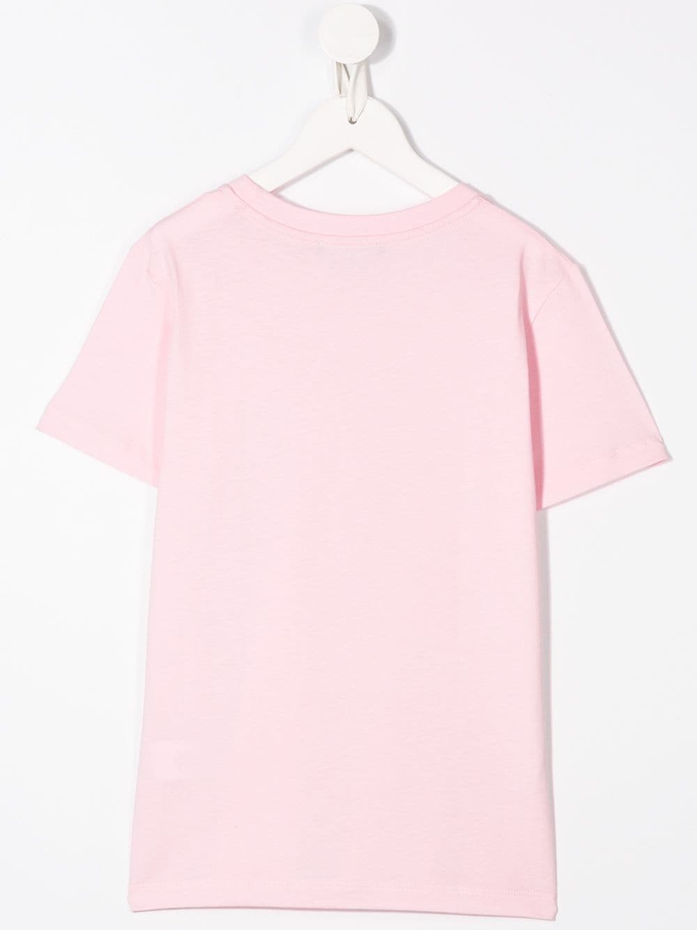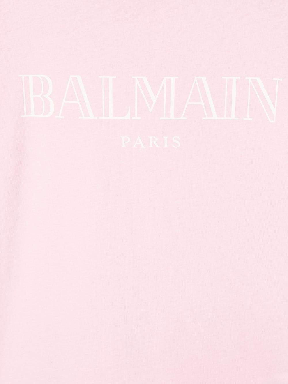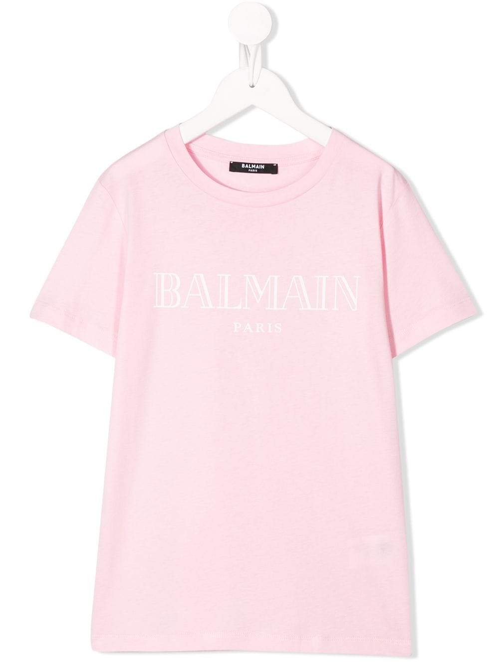 Light pink cotton logo printed T-shirt from Balmain Kids featuring a crew neck with welt finishing, short sleeves and a straight hem.