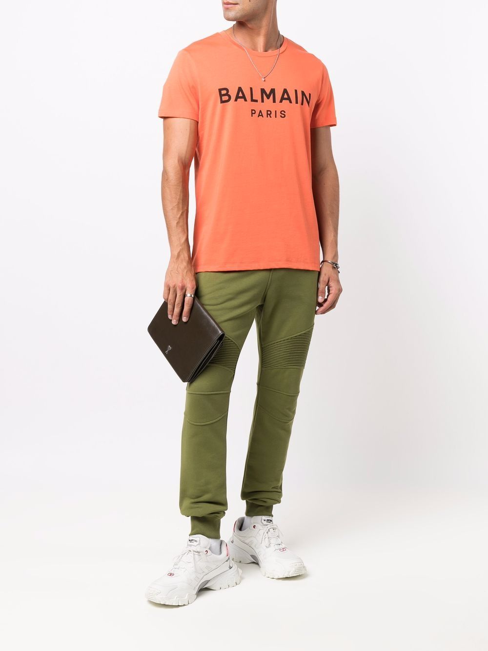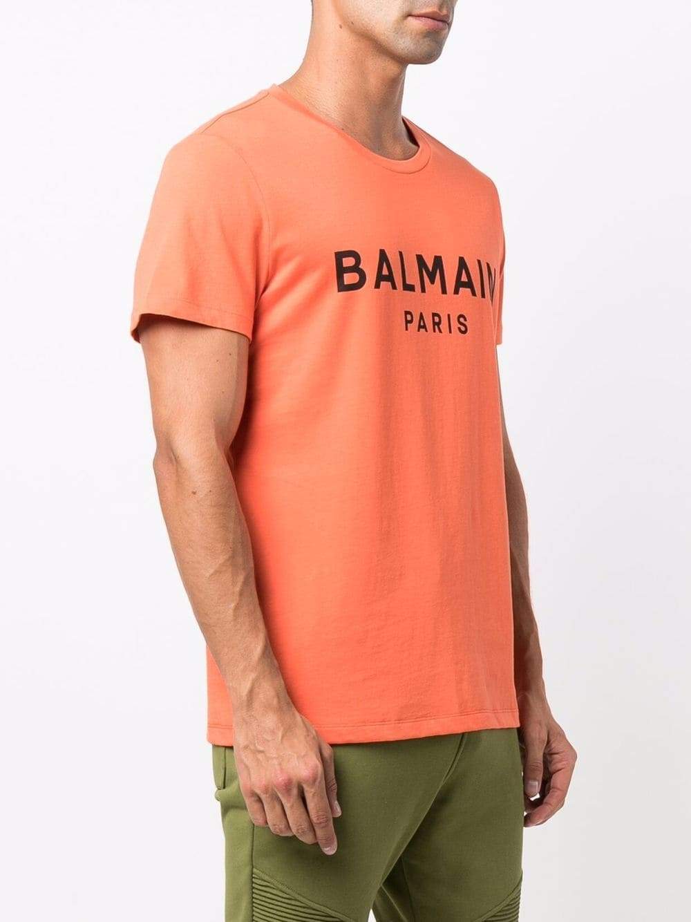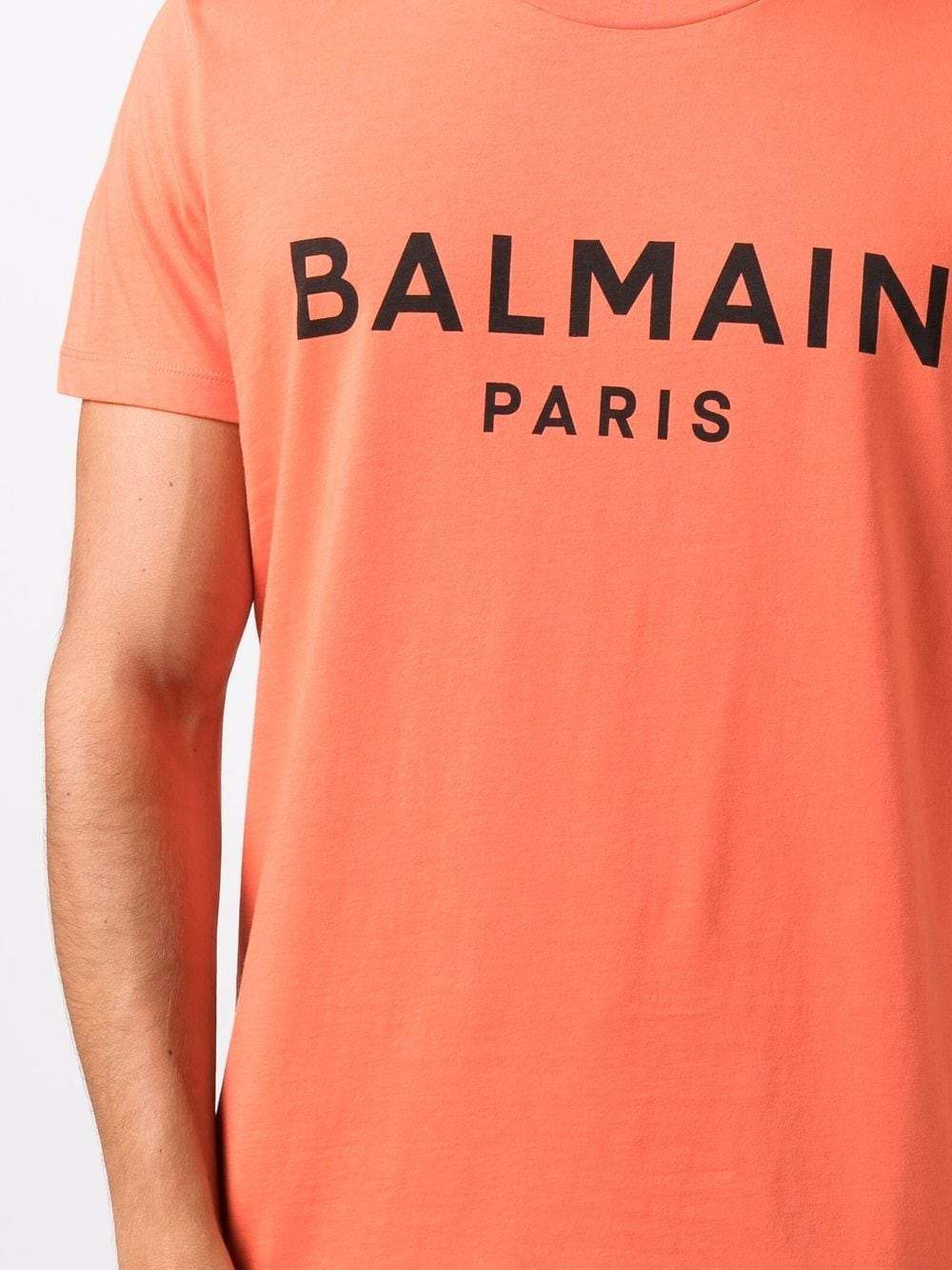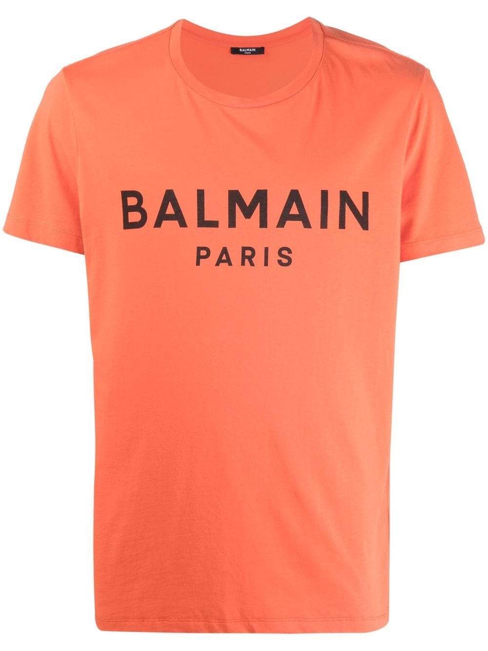 Orange cotton logo-print short-sleeve T-shirt from Balmain featuring logo print to the front, round neck, short sleeves and straight hem.