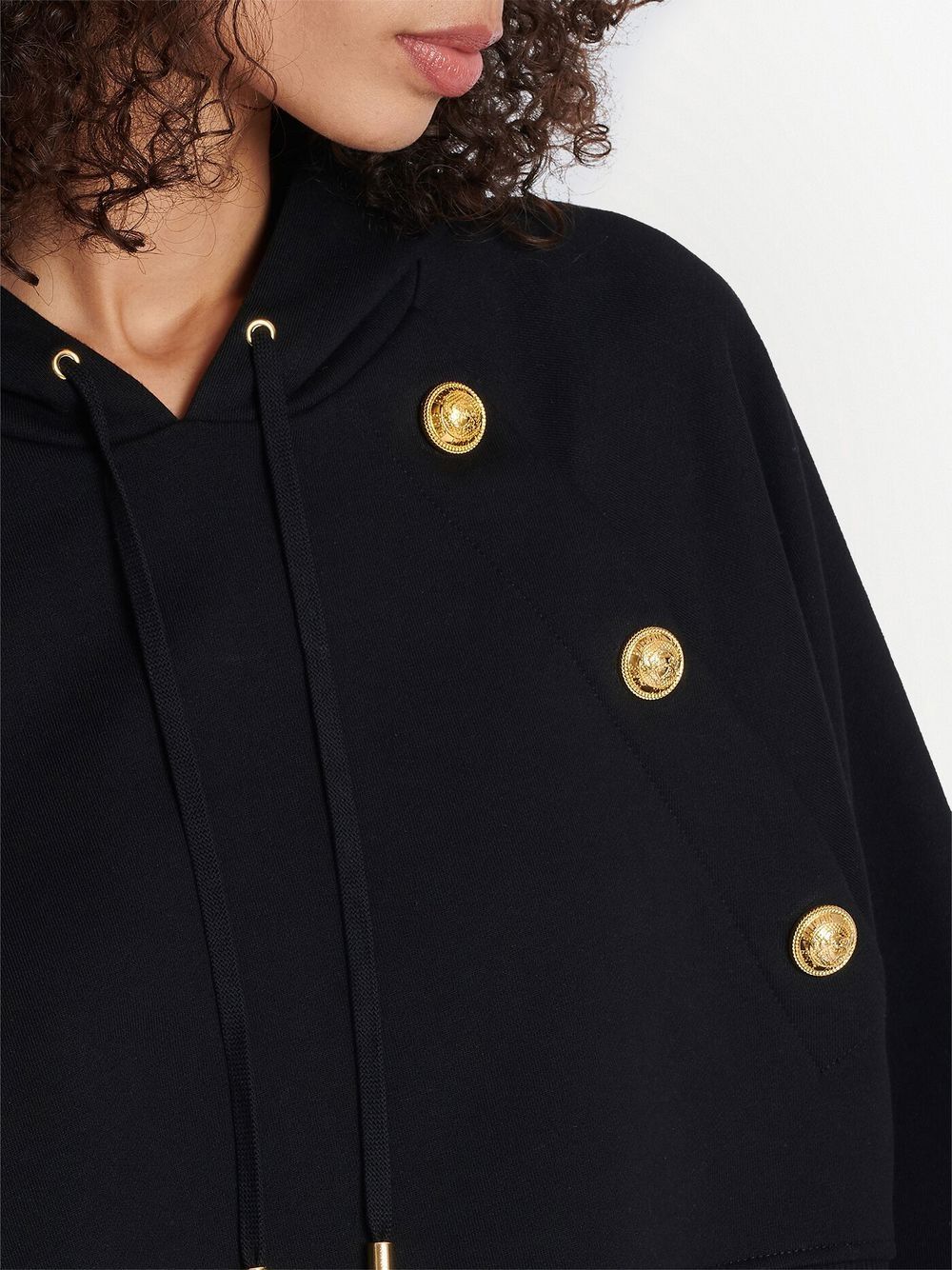 decorative-buttons organic-cotton hoodie from Balmain featuring black, organic cotton, jersey fleece, decorative button detailing, drawstring hood, long sleeves and cropped. Conscious: This item is made from at least 50% organic materials.