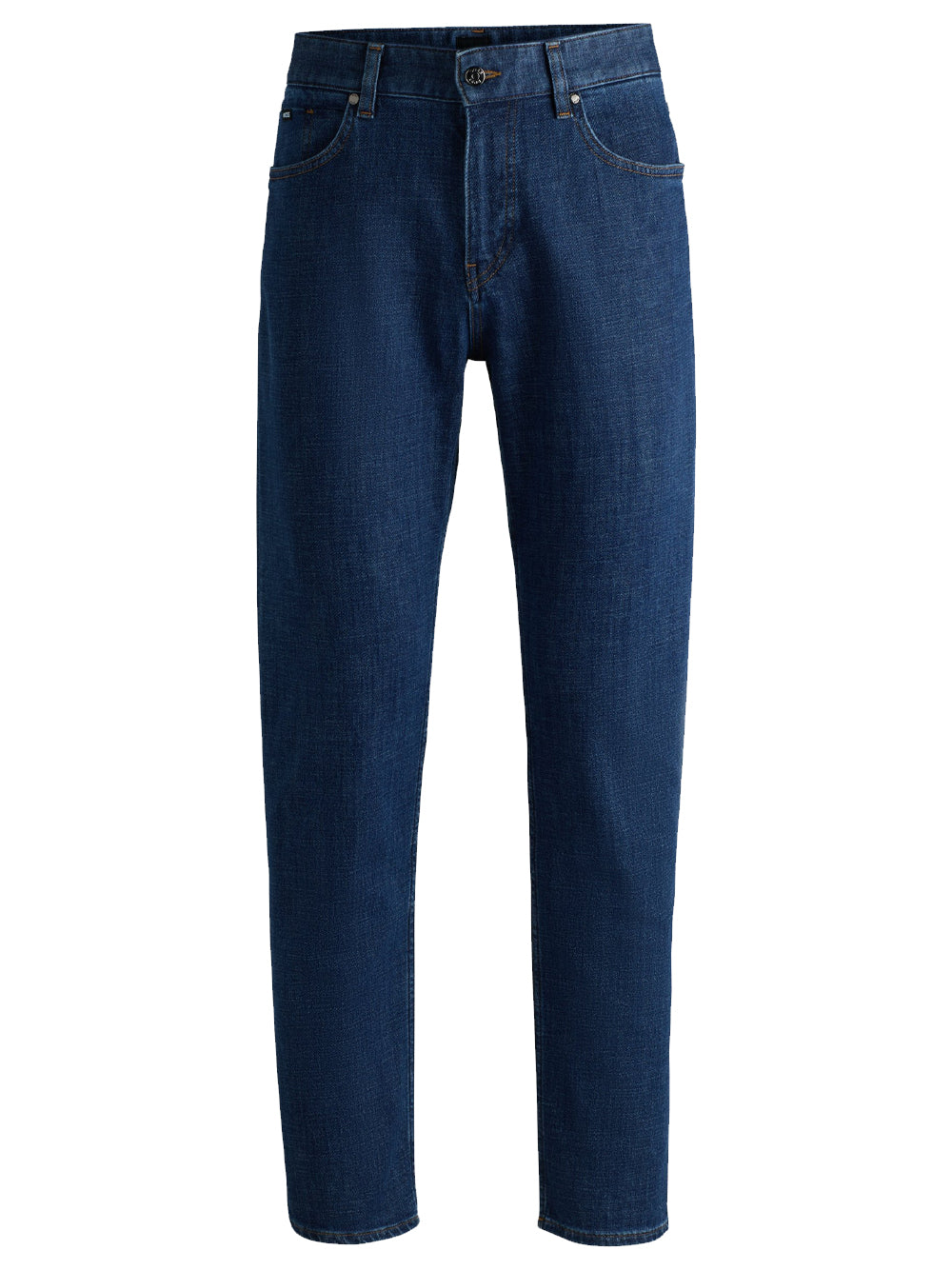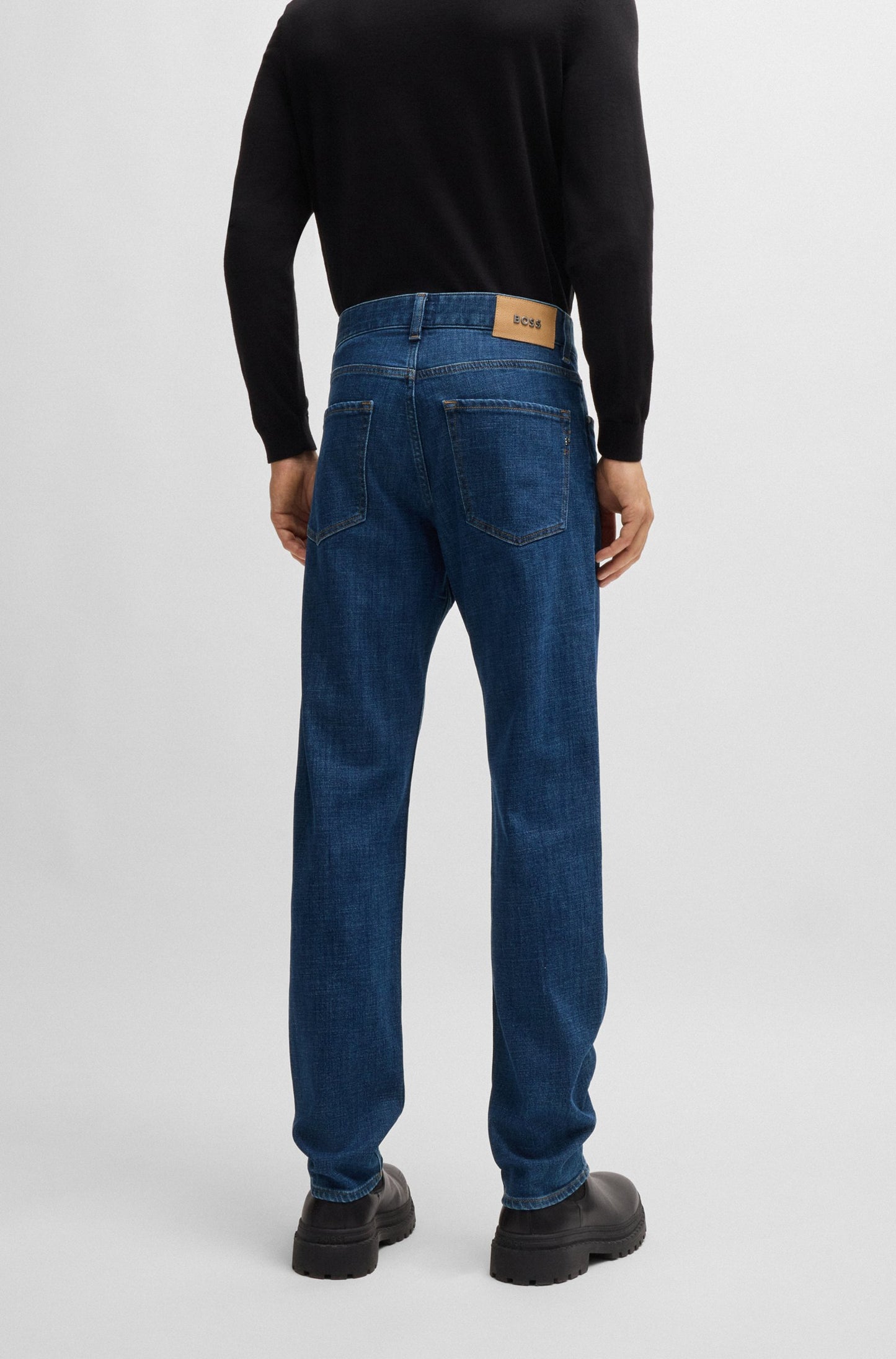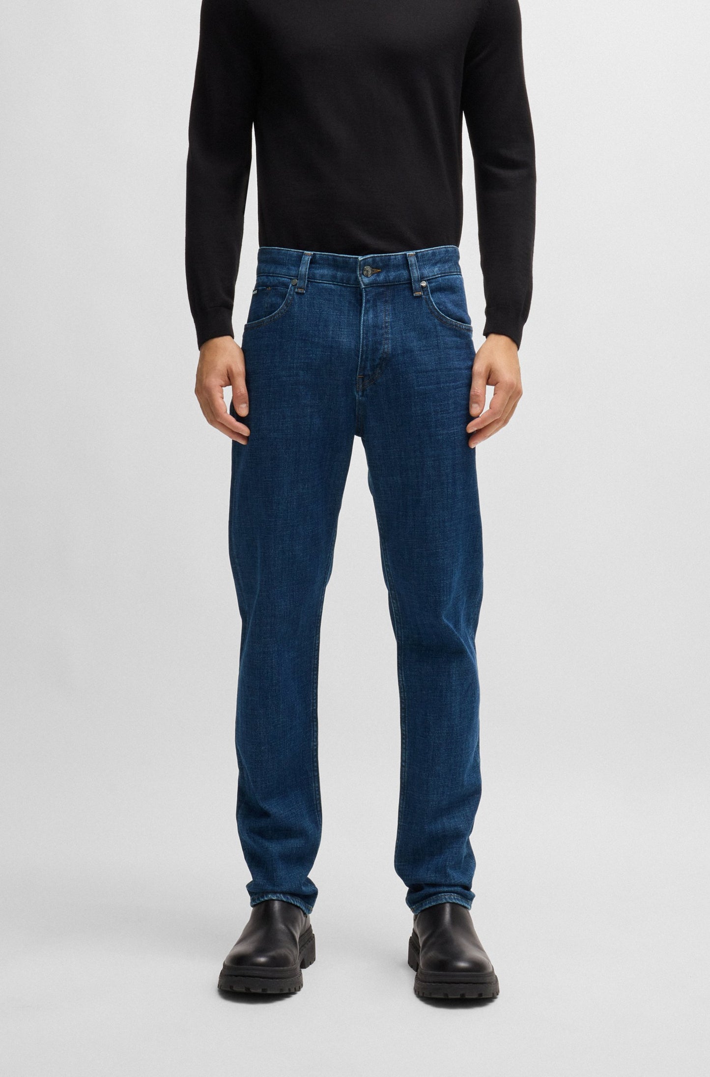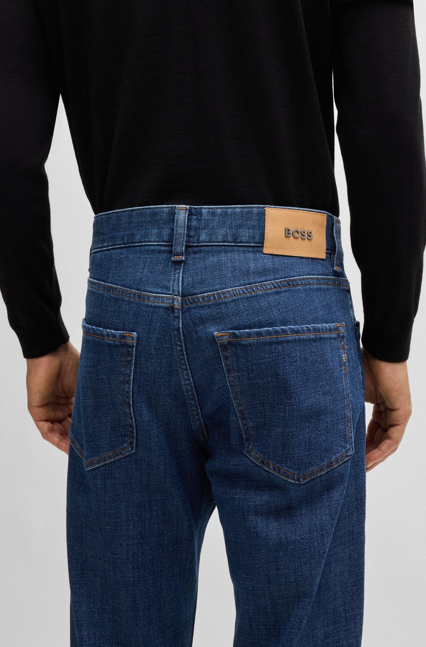 Straight-fit jeans with a tapered leg by BOSS Menswear. This regular-rise pair is crafted in blue denim with stretch for comfort. This product’s raw material is derived from regenerative agriculture: an approach focused on preservation and restoration that aims to increase biodiversity, preserve water quality and improve soil health while absorbing CO2. Regenerative agriculture also promotes animal welfare and fair working conditions for farmers.