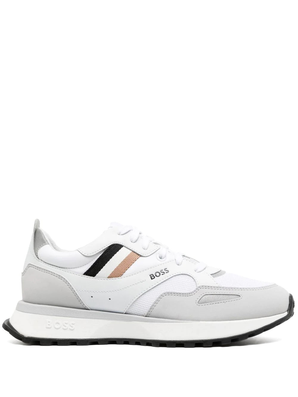 Jonah low-top panelled sneakers from BOSS featuring ivory white, black, beige, calf leather, branded heel counter, panelled design, almond toe, front lace-up fastening and flat rubber sole.