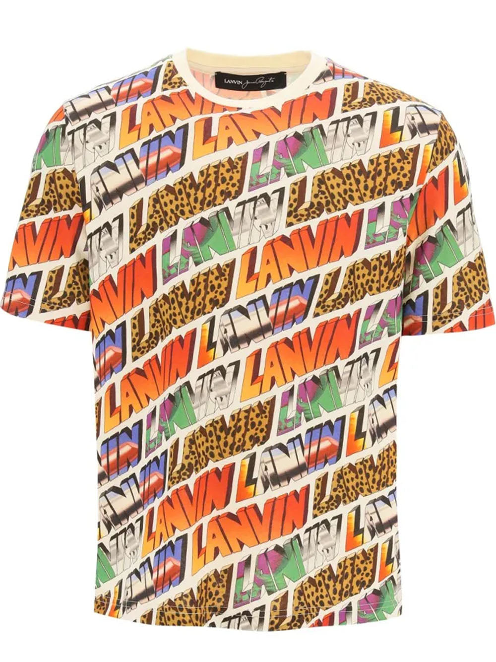 short-sleeved t-shirt with all-over multicolor logo print, mixed with Rosenquist's "Ultra Tech" and "Through a Glass Ceiling" works.