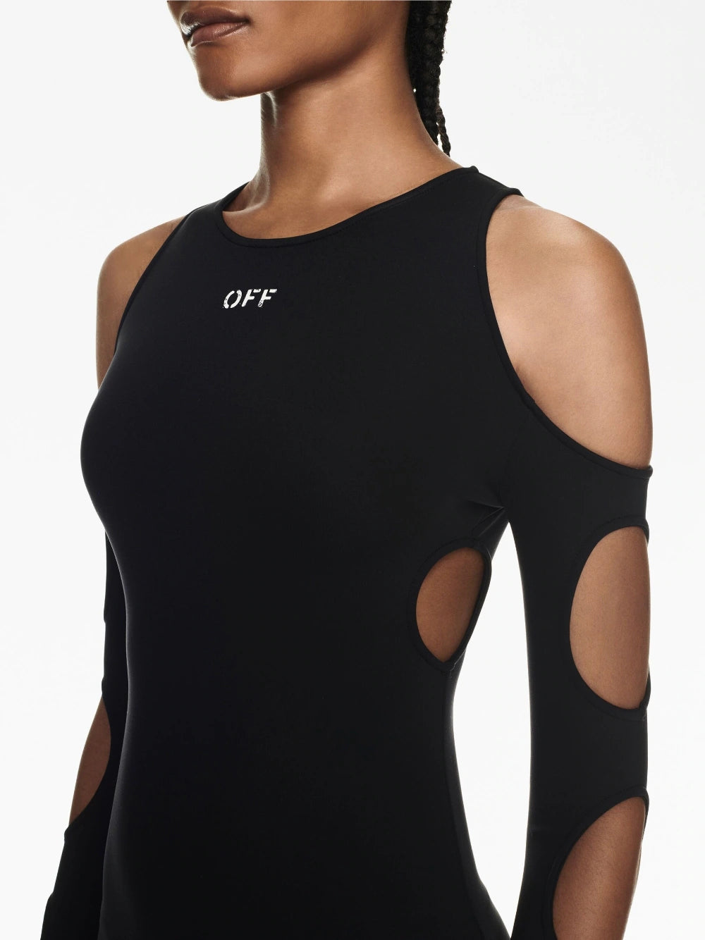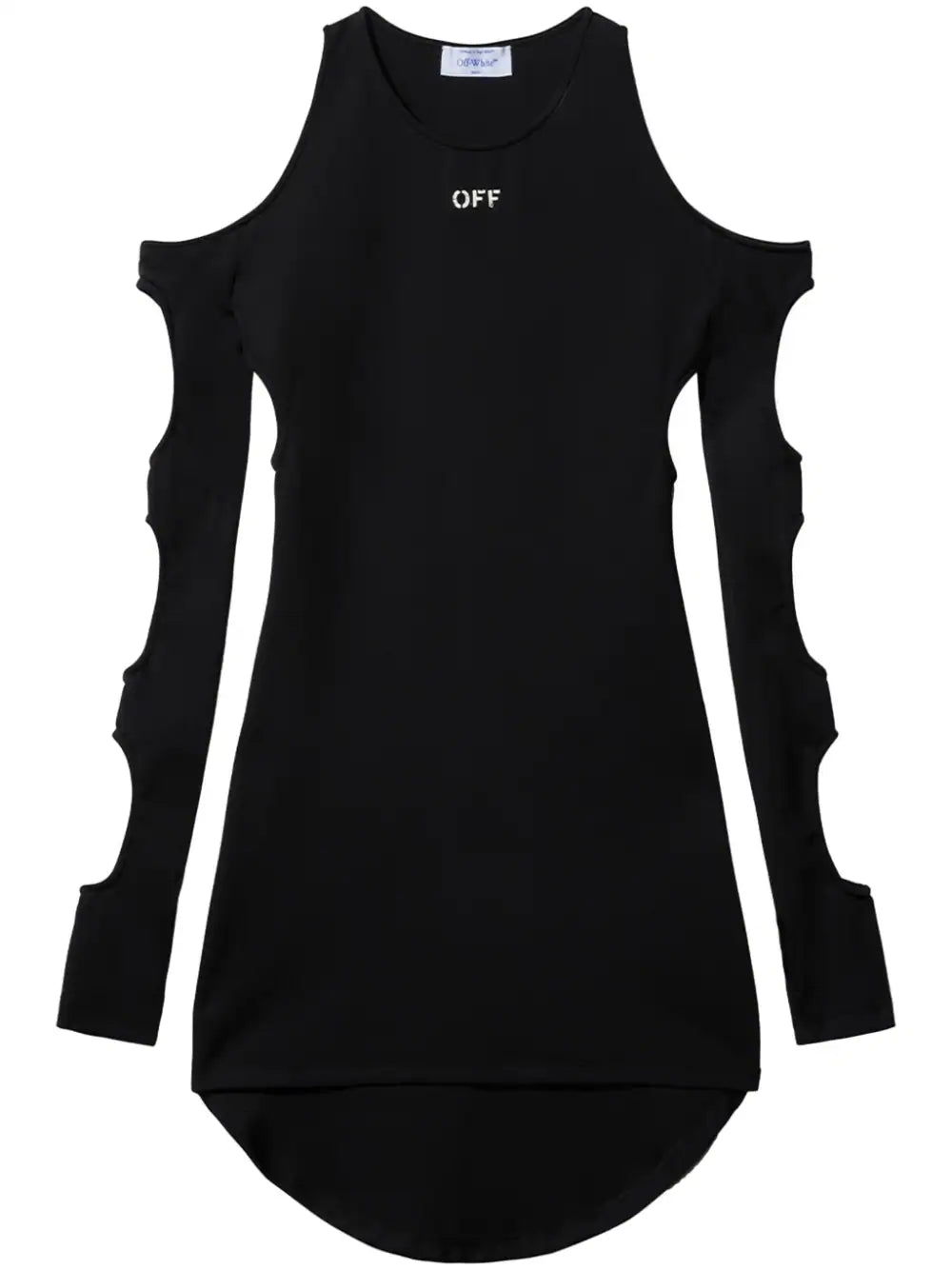 cut-out long-sleeved dress from OFF-WHITE featuring black, stretch-design, cut-out detailing, logo print to the front, round neck, long sleeves, curved hem and above-knee length.