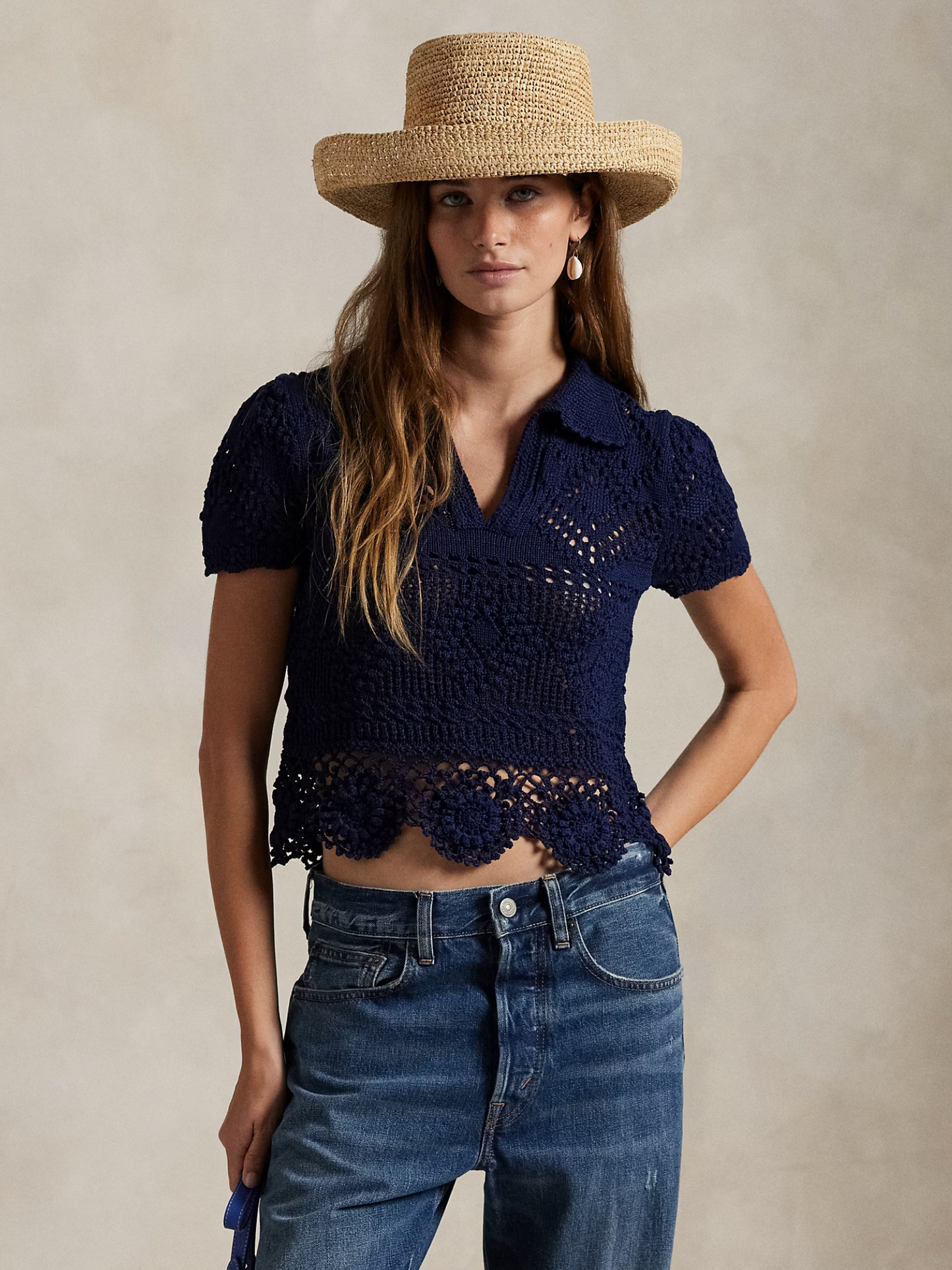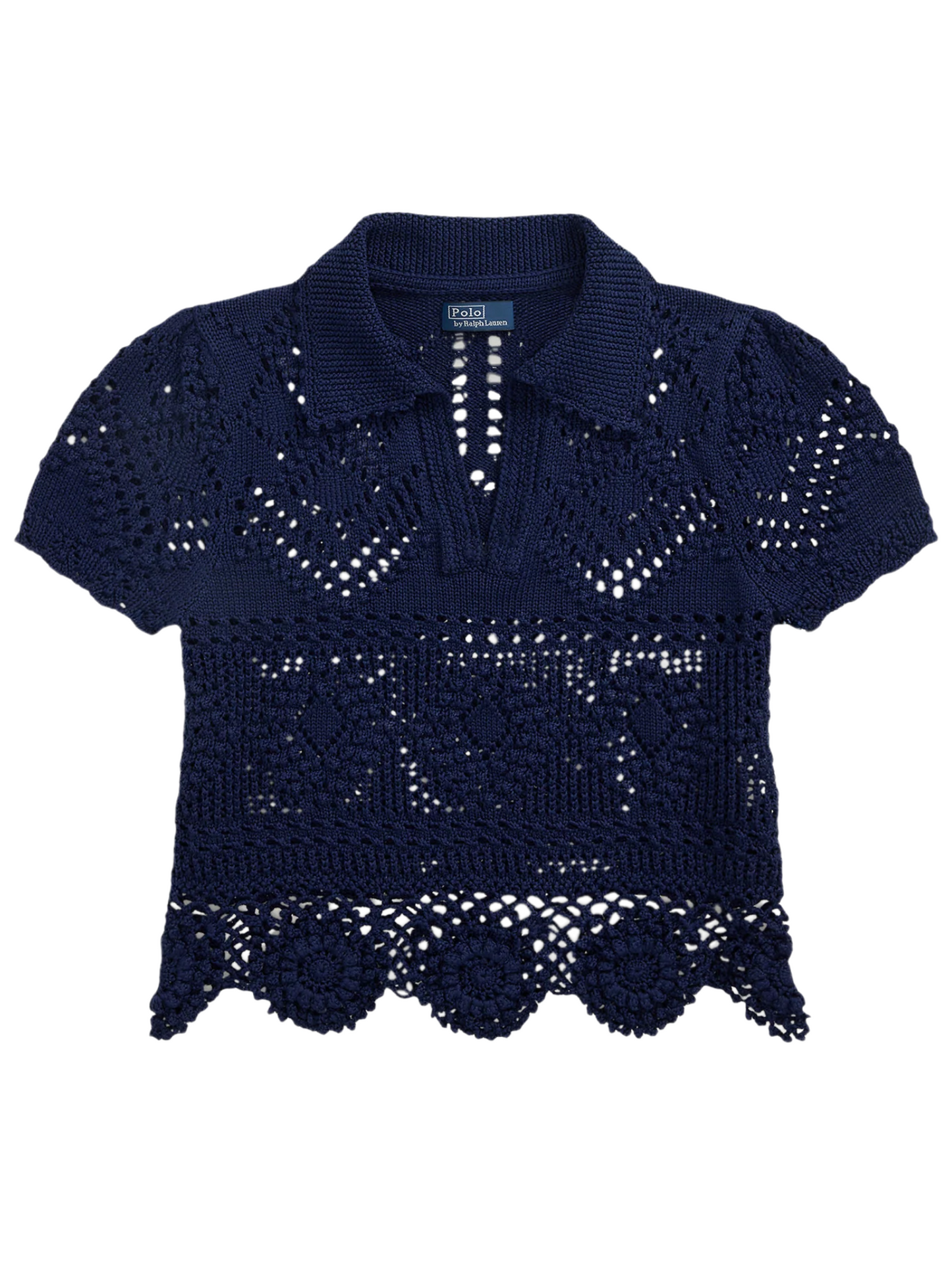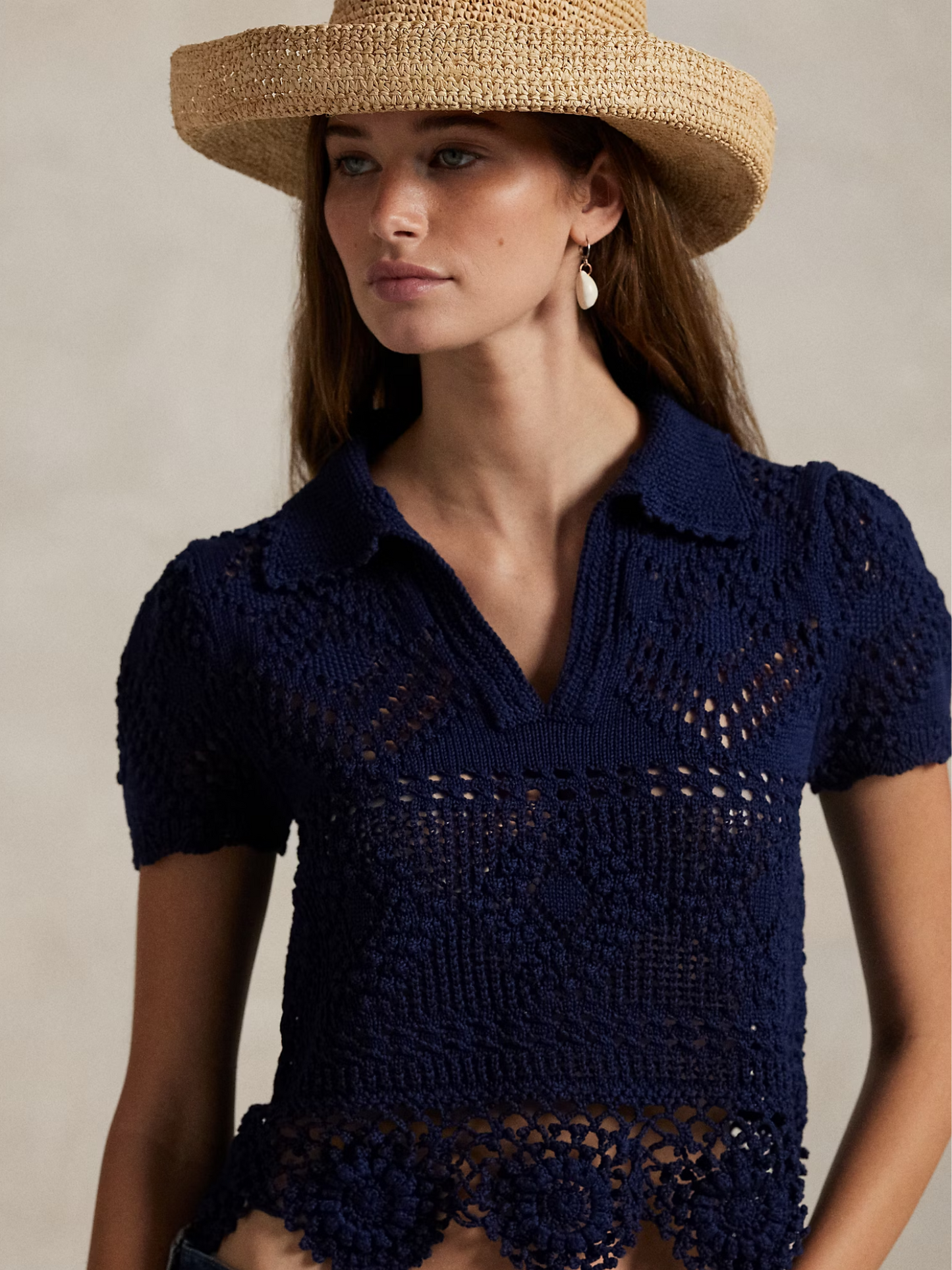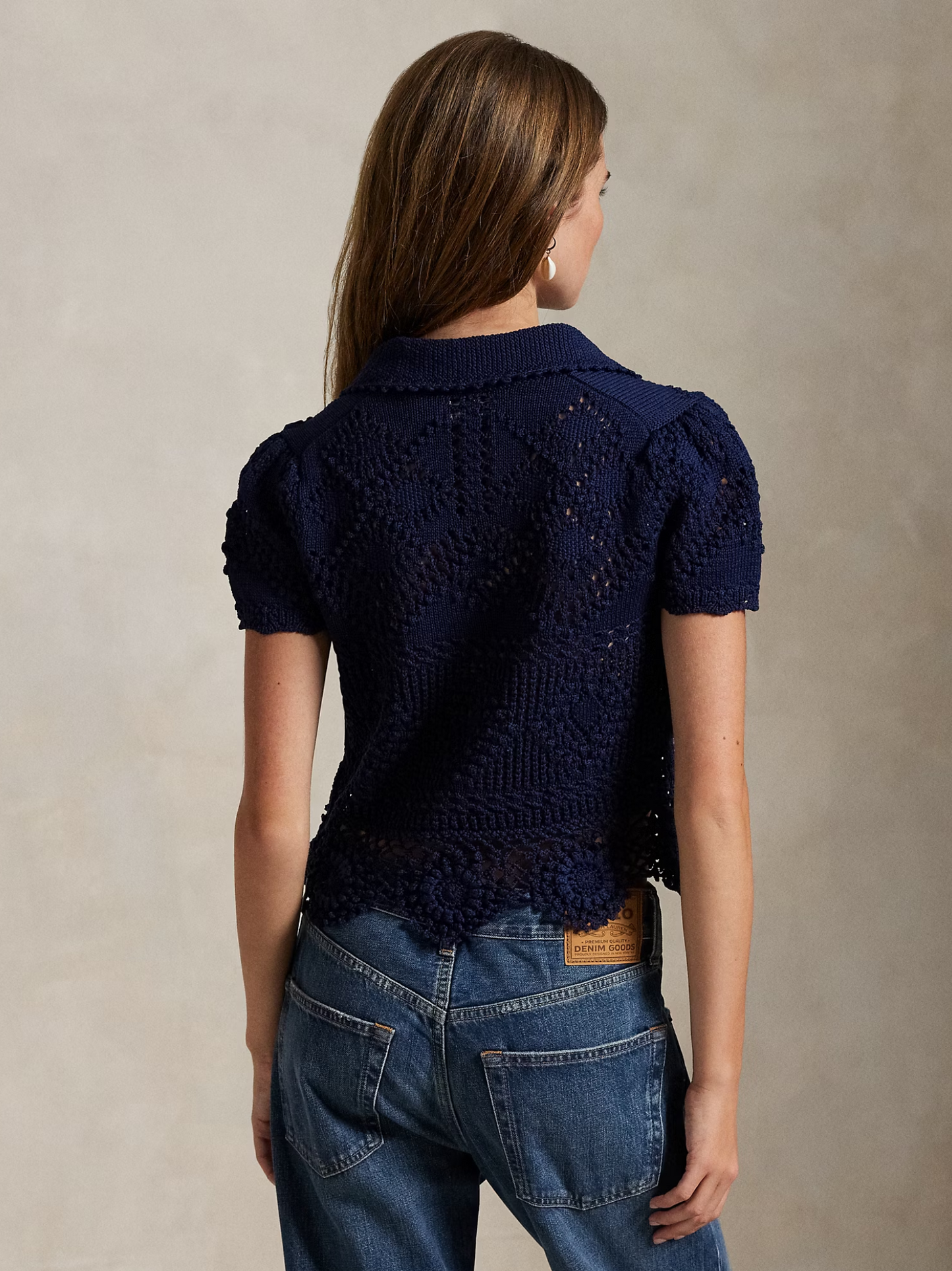 RALPH LAUREN WOMEN Pointelle Cotton Polo Shirt Navy