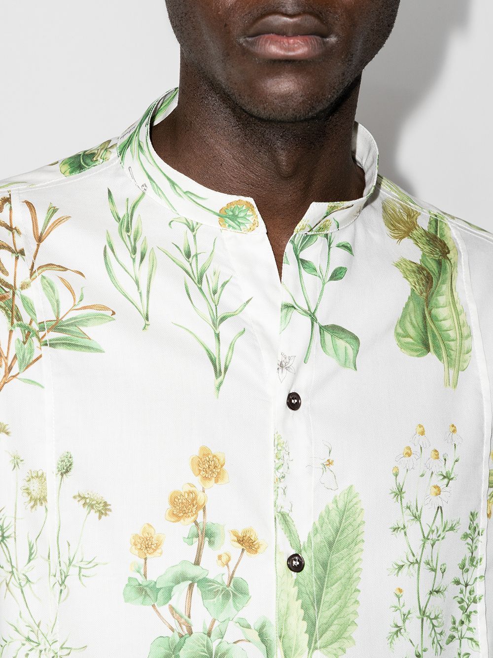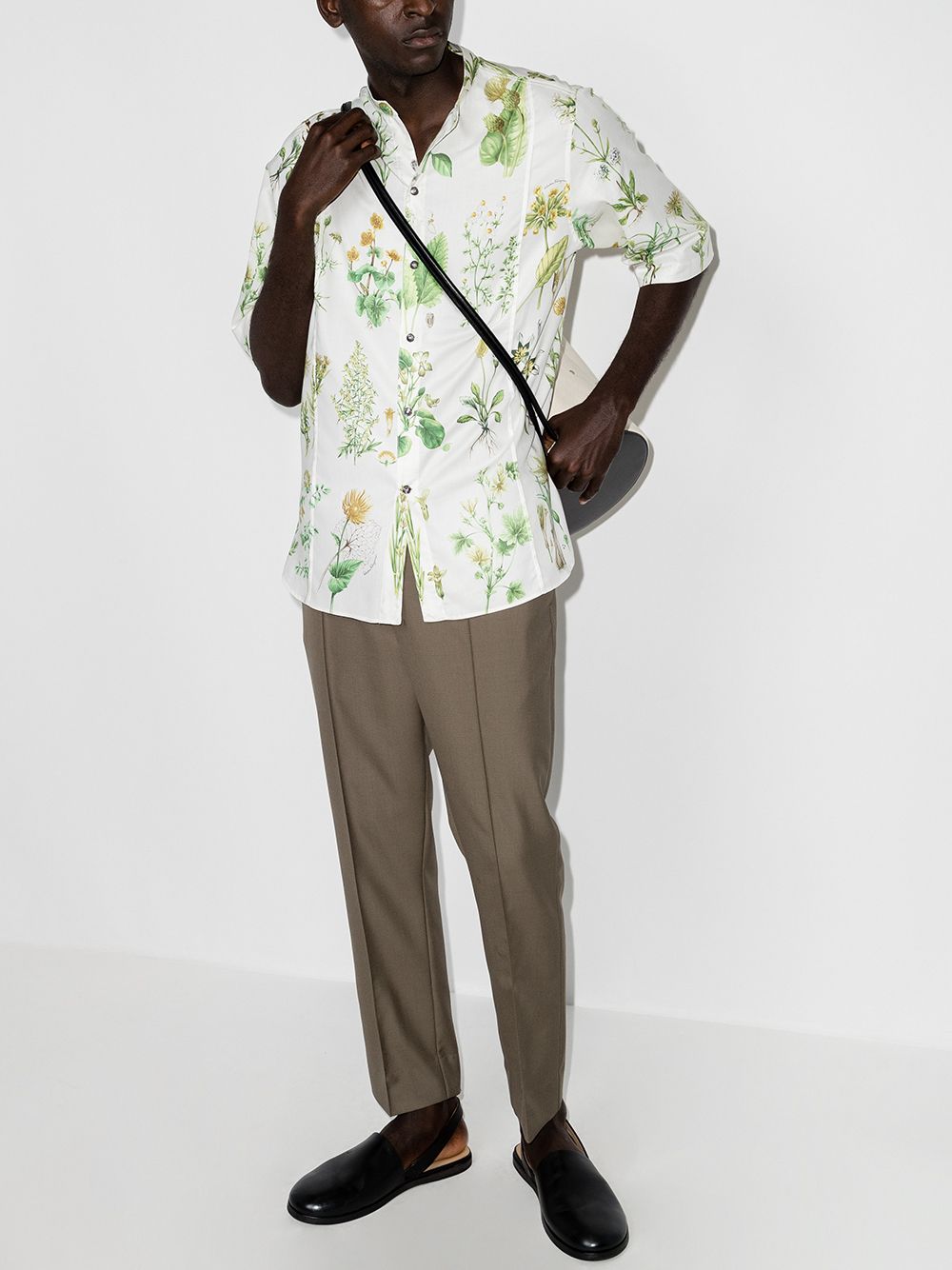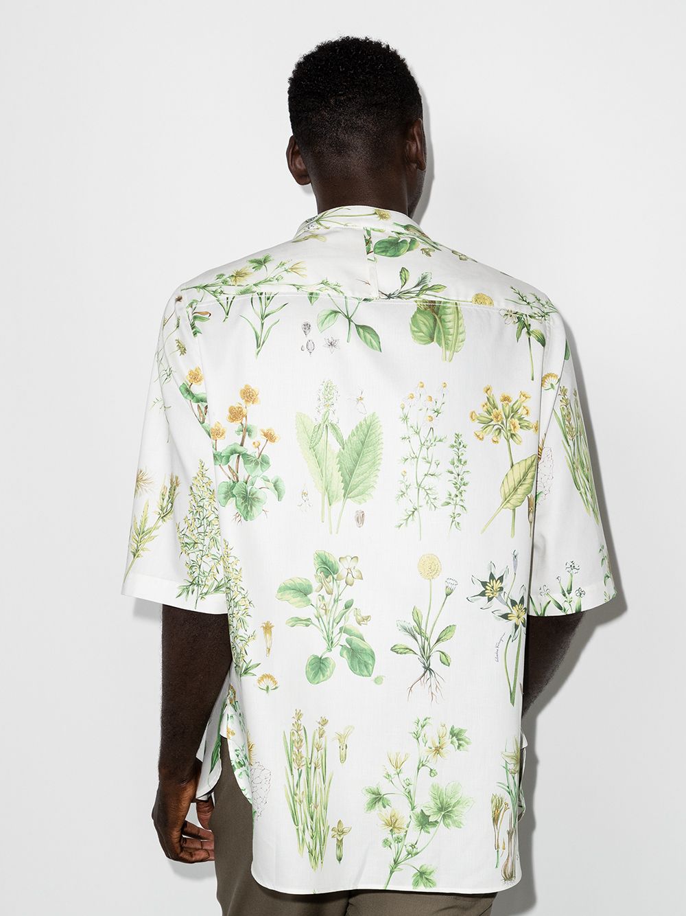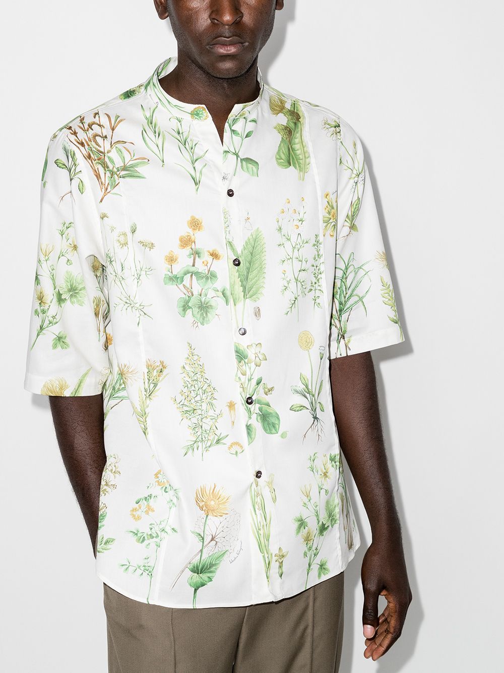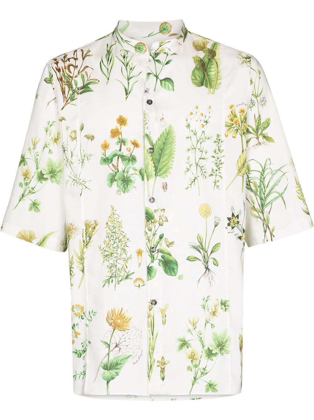 For its SS21 collection, Salvatore Ferragamo reinvents the white shirt. Crafted in Italy from cotton, this short-sleeve piece's classic silhouette is elevated by an all-over floral print in shades of green and yellow.