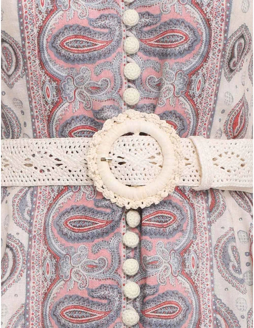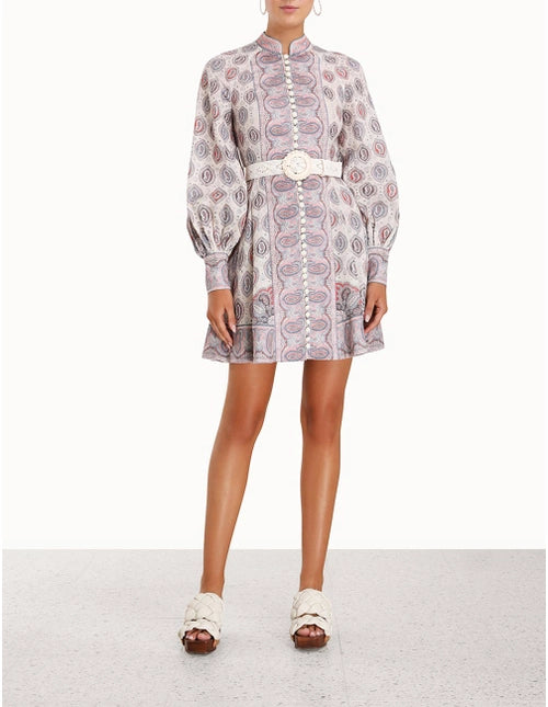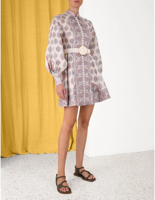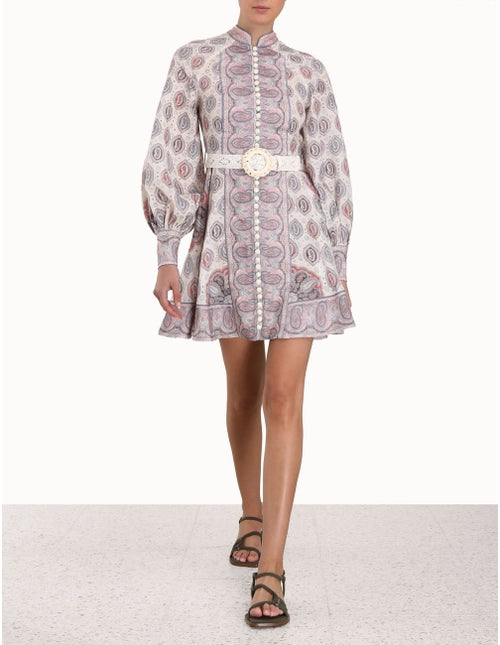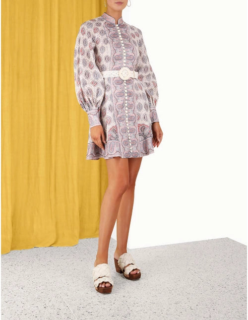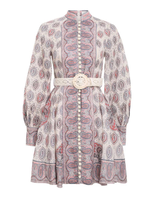 Regular price Dhs. 1,929.00 AEDthe vitali button up mini dress in ivory paisley from our resort swim 2023 collection. a linen mini dress featuring a mandarin collar, blouson sleeves and buttons down the centre front, finished with a belt and a line skirt.