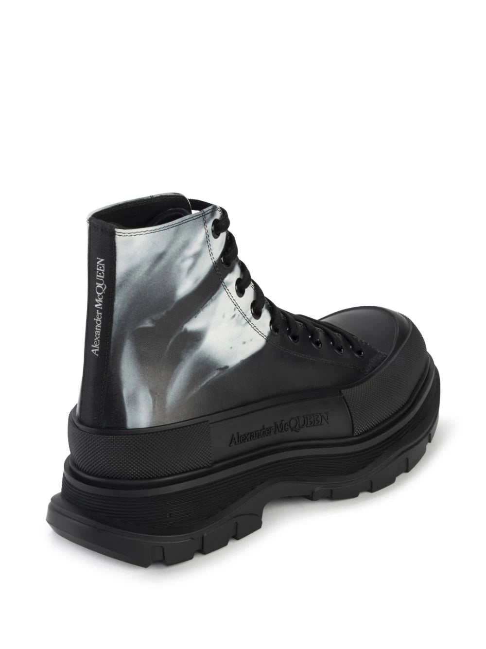 تتميز هذه النسخة من حذاء الكاحل Tread Slick الشهير من ألكسندر ماكوين بطباعة زهرة الأوركيد باللونين الأبيض والأسود، وهي من أبرز زخارف مجموعة خريف وشتاء 2023.