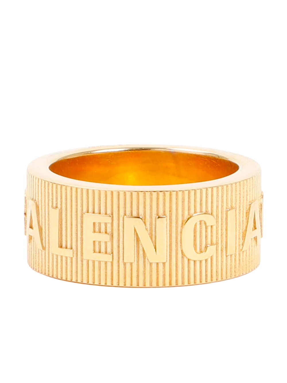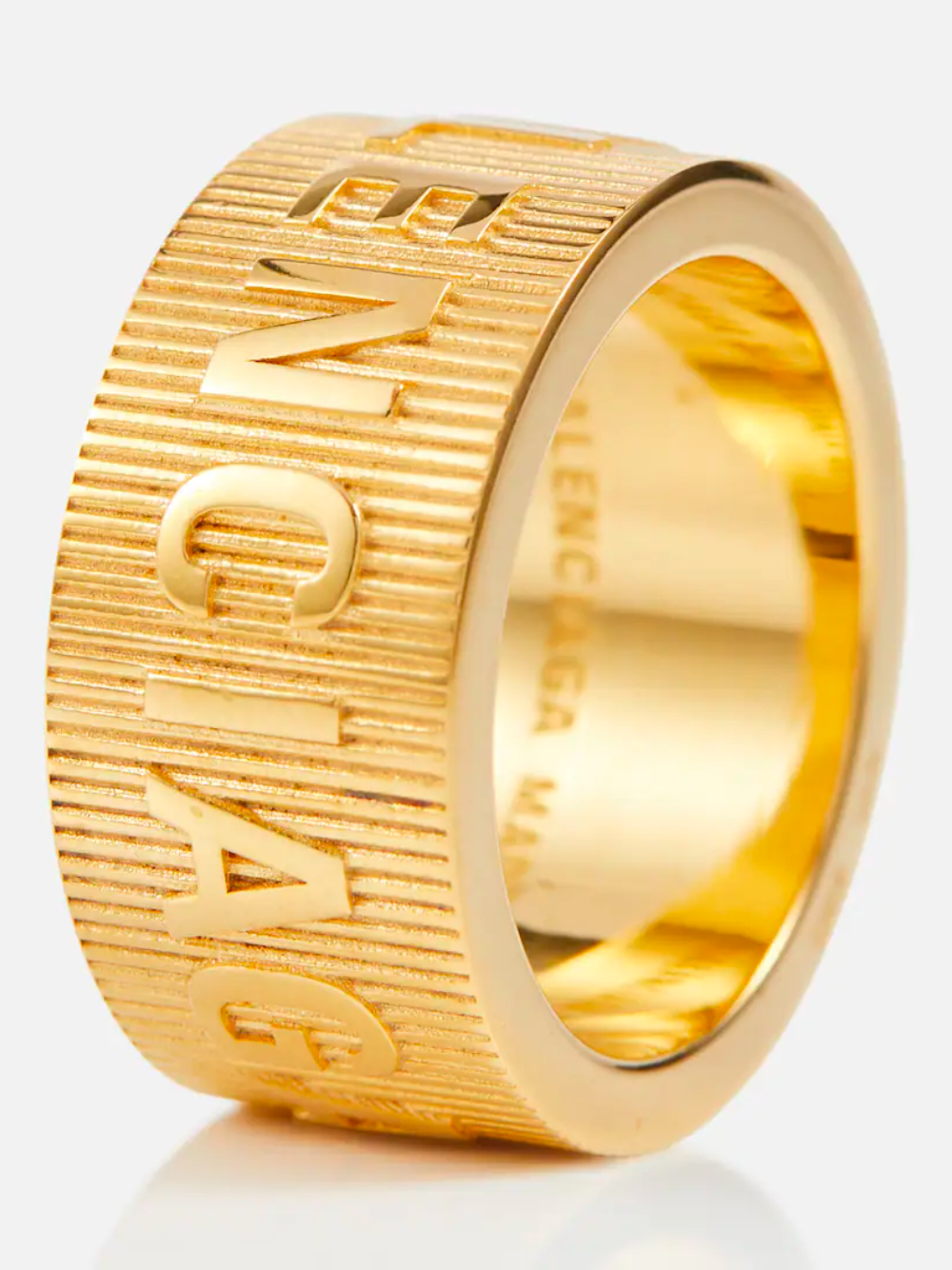 خاتم بالنسياغا مصنوع من الفضة الإسترلينية باللون الذهبي مع سطح محفور وشعار محفور.