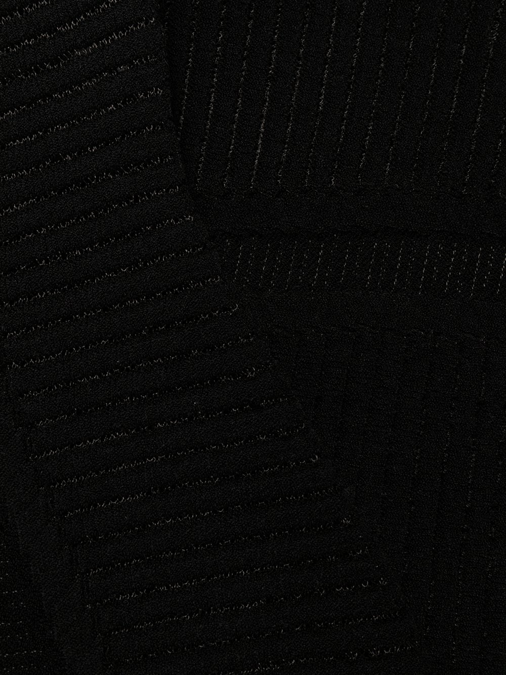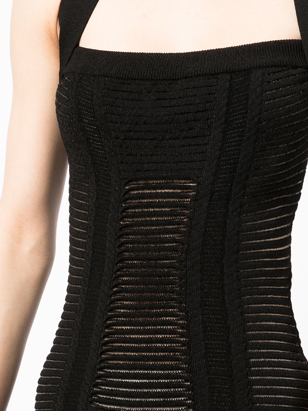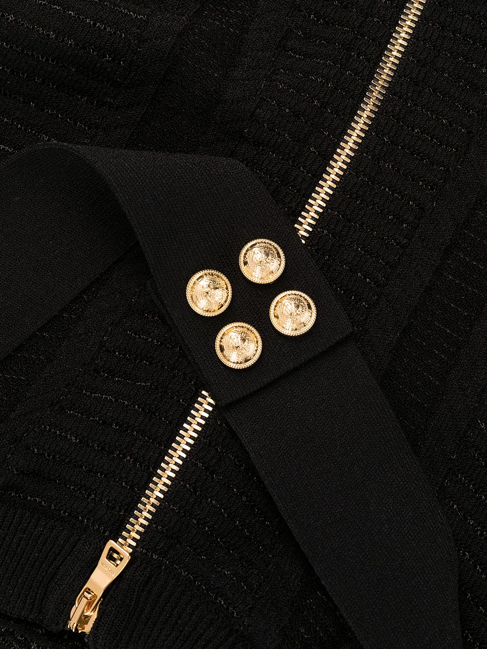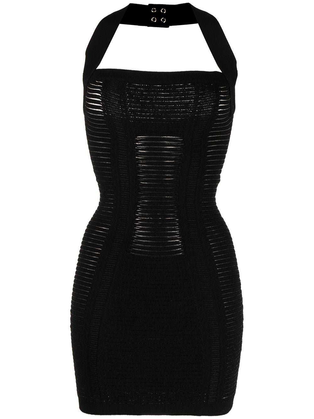 يُجسّد هذا الفستان جماليات بالمان الواثقة، بتصميمه الضيق حول الرقبة وظهره المفتوح. متوفر باللون الأسود الكلاسيكي، ومصمم بألواح مضلعة لمزيد من حرية الحركة.