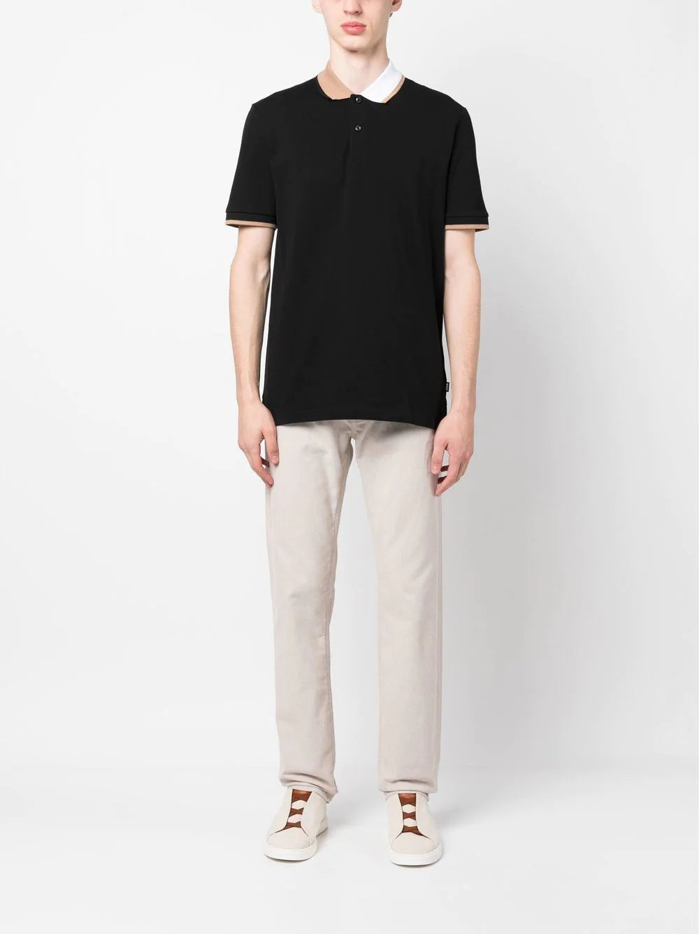 قميص بولو بياقة ثنائية اللون من BOSS يتميز باللون الأسود/الأبيض والبيج والقطن، مع أزرار أمامية قصيرة، وياقة بولو، وياقة متباينة، وأكمام قصيرة، وحافة متباينة وحاشية مستقيمة.