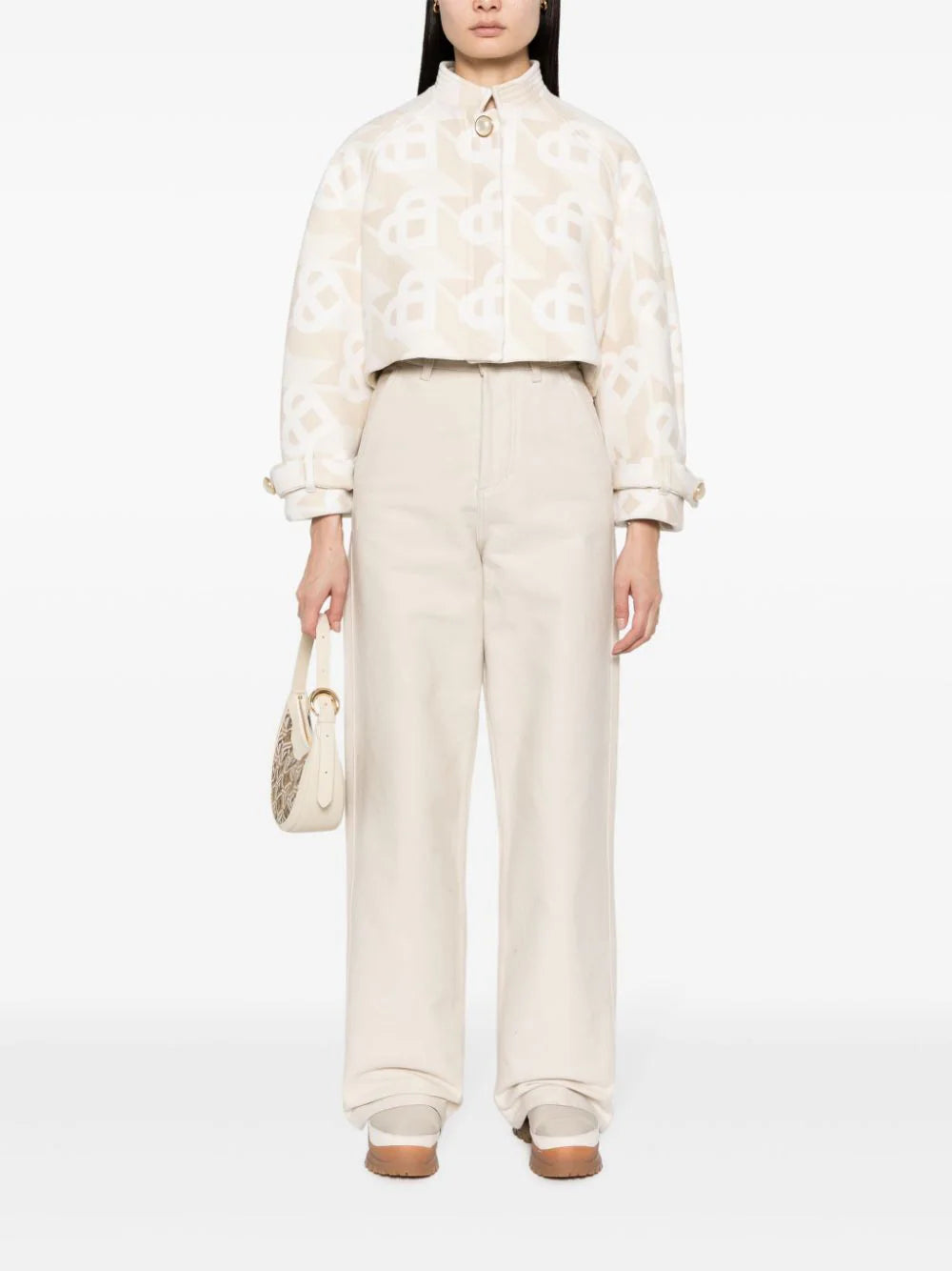صُنعت هذه السترة من كازابلانكا في البرتغال بتصميم قصير، وتتميز بنقش شعار أبيض أحادي اللون يتباين مع الخلفية الكريمية. تتميز برقبة شبه عالية مضلعة وحاشية طويلة.