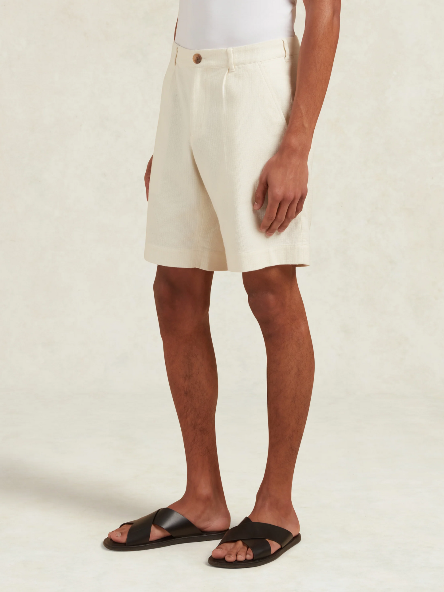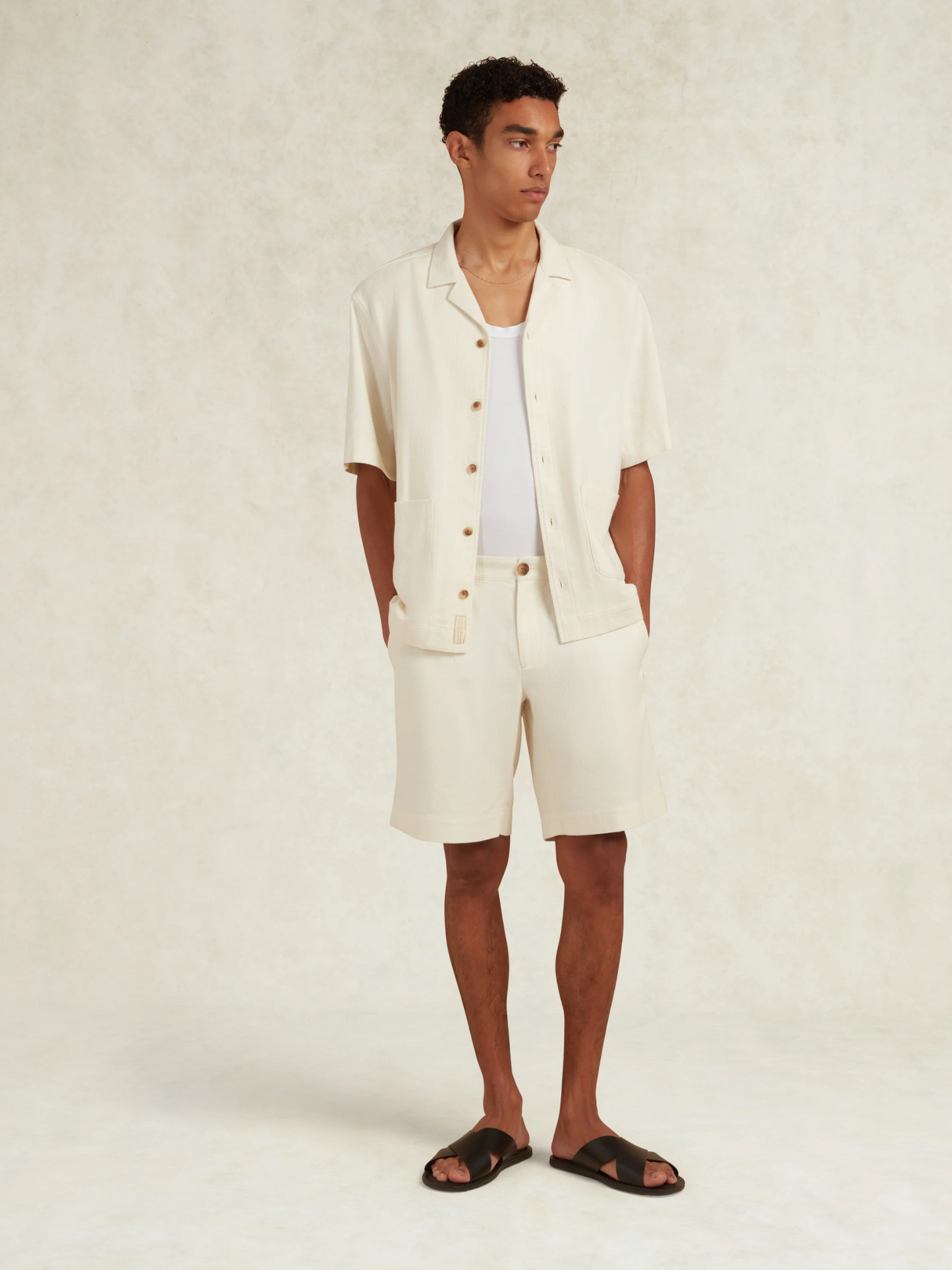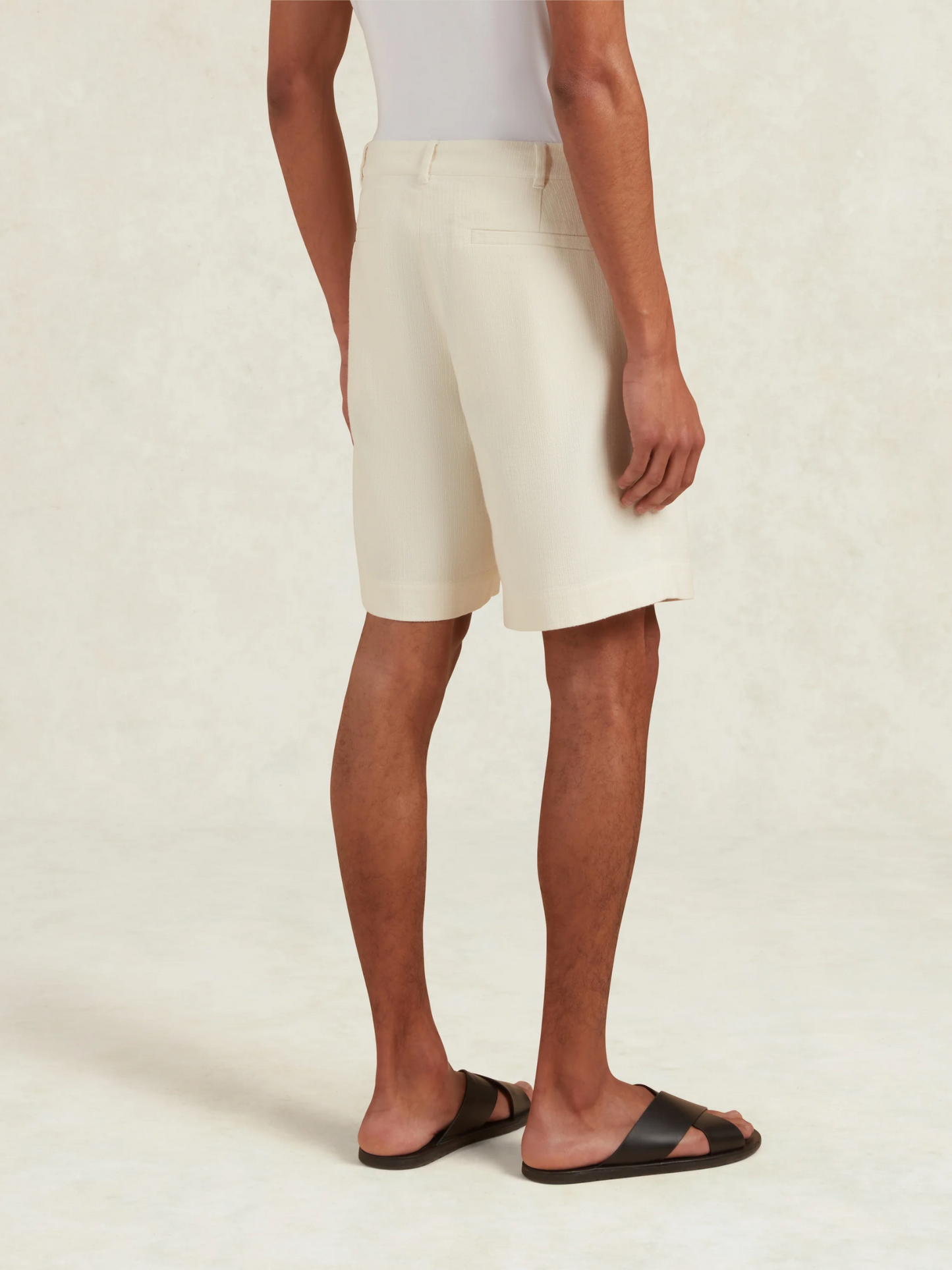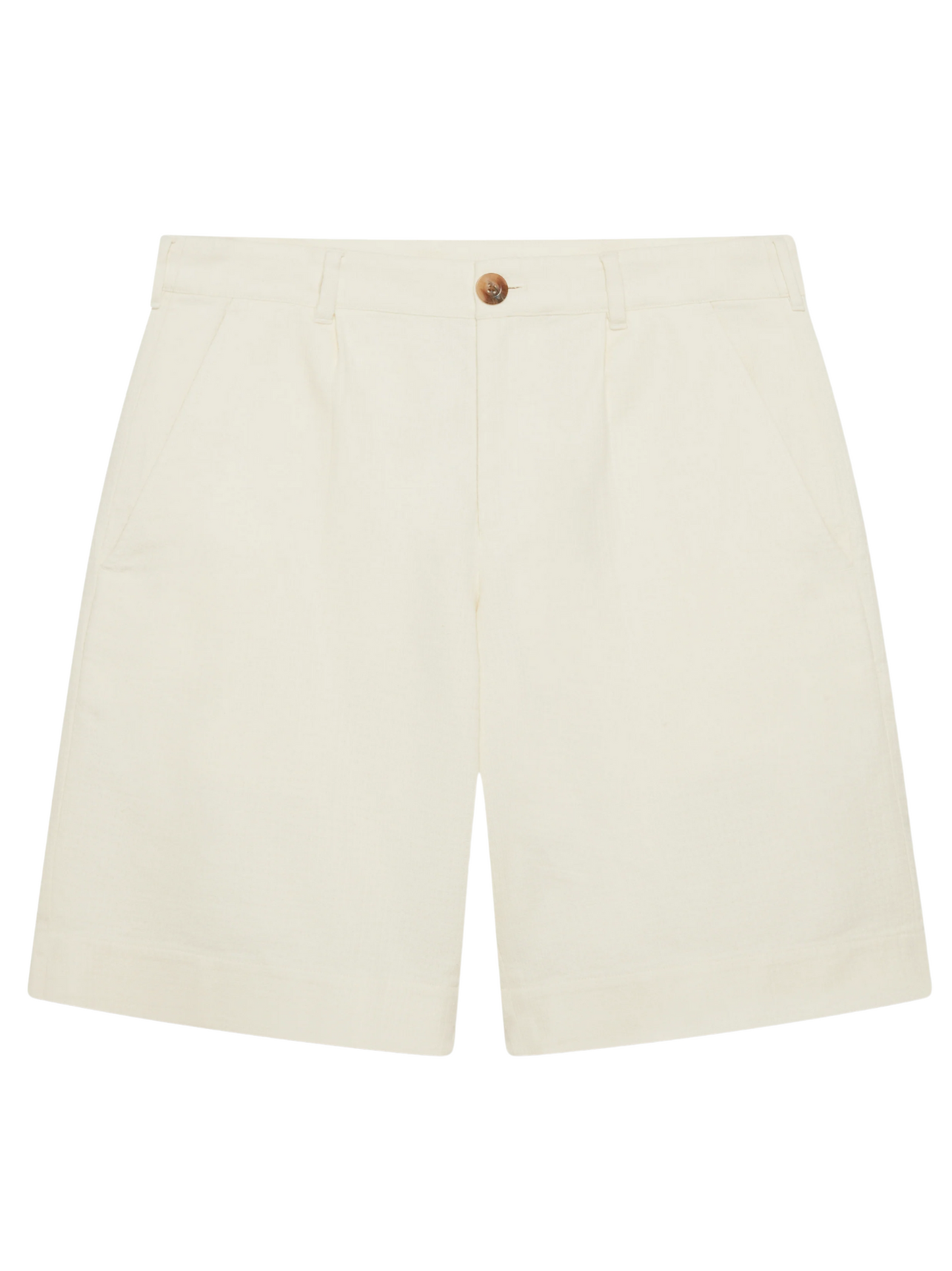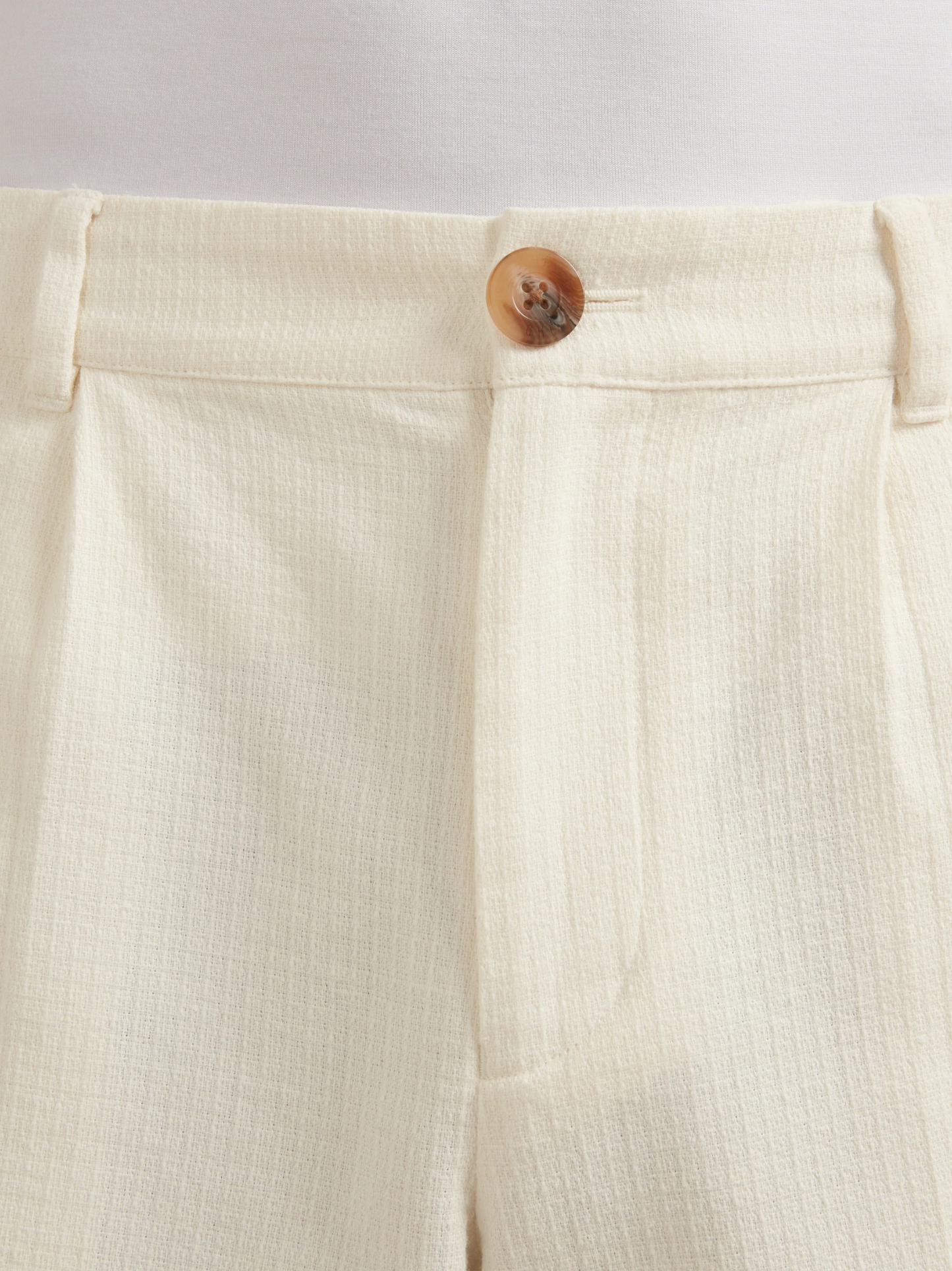 شورت مُفصّل، مصنوع من مزيج من القطن والكتان، بلون عاجي خلاب. نسّقيه مع قميص فيناليس لإطلالة صيفية مثالية، أو احتفظي به ضمن خياراتك لإطلالة أنيقة.