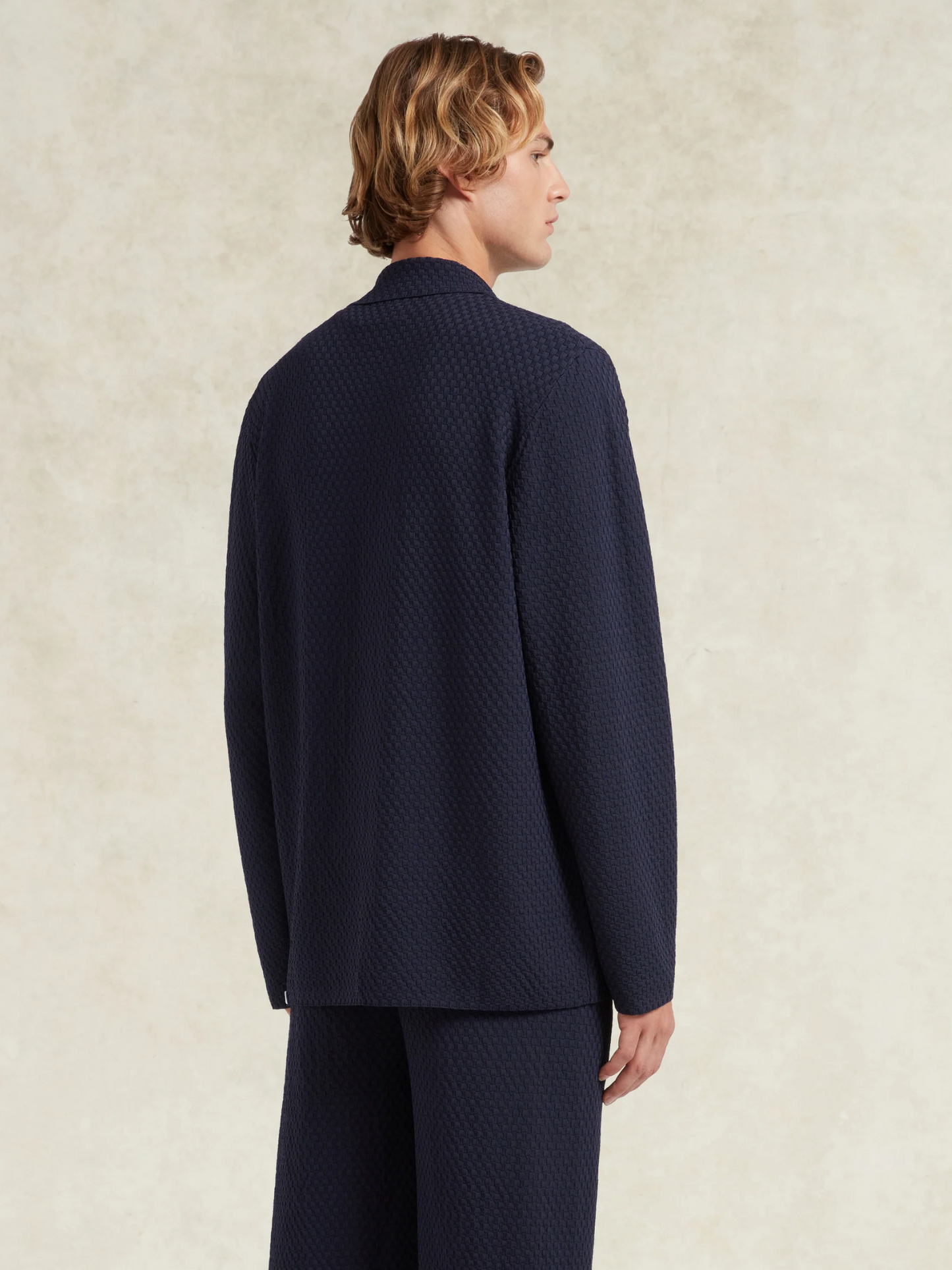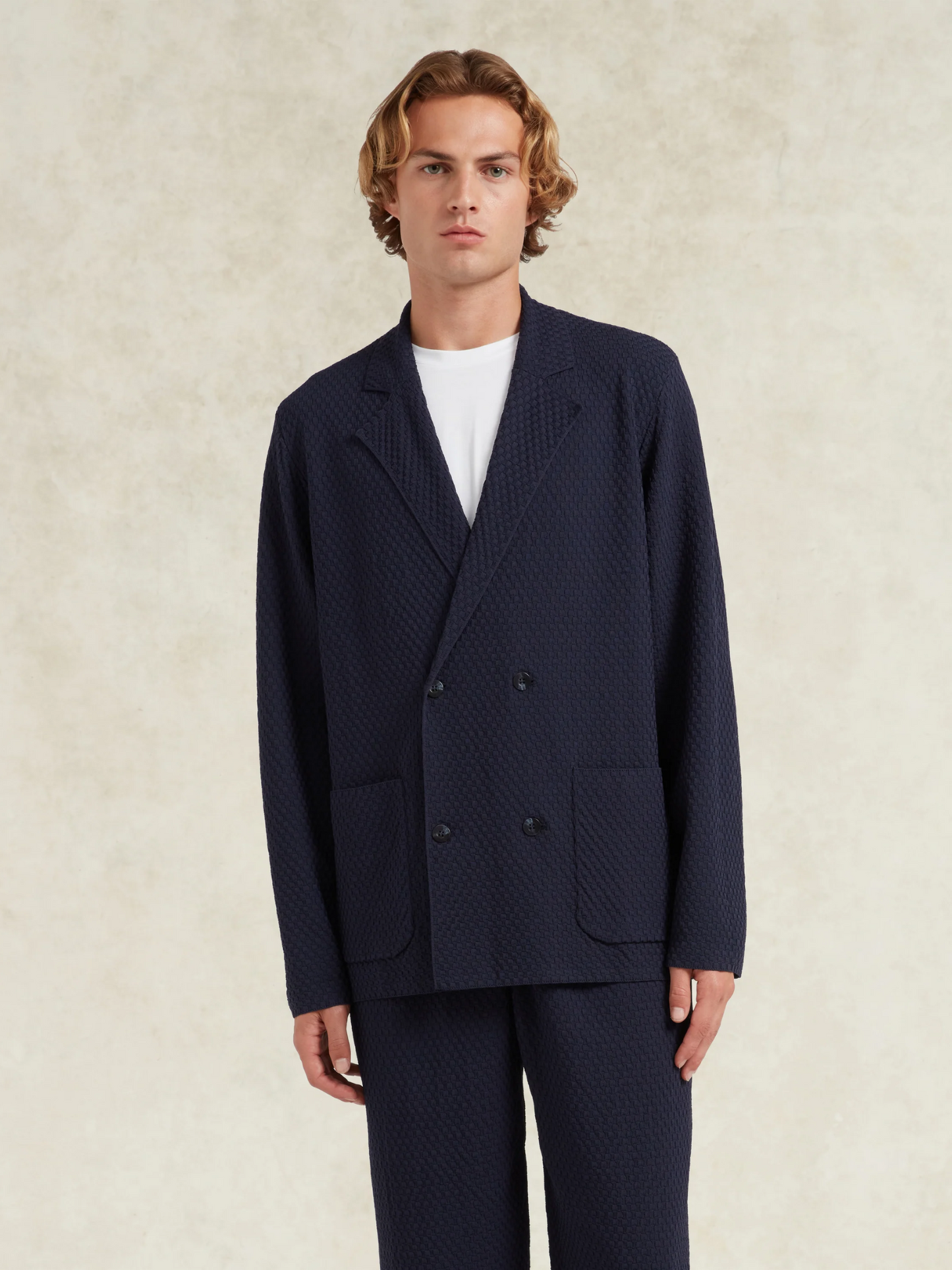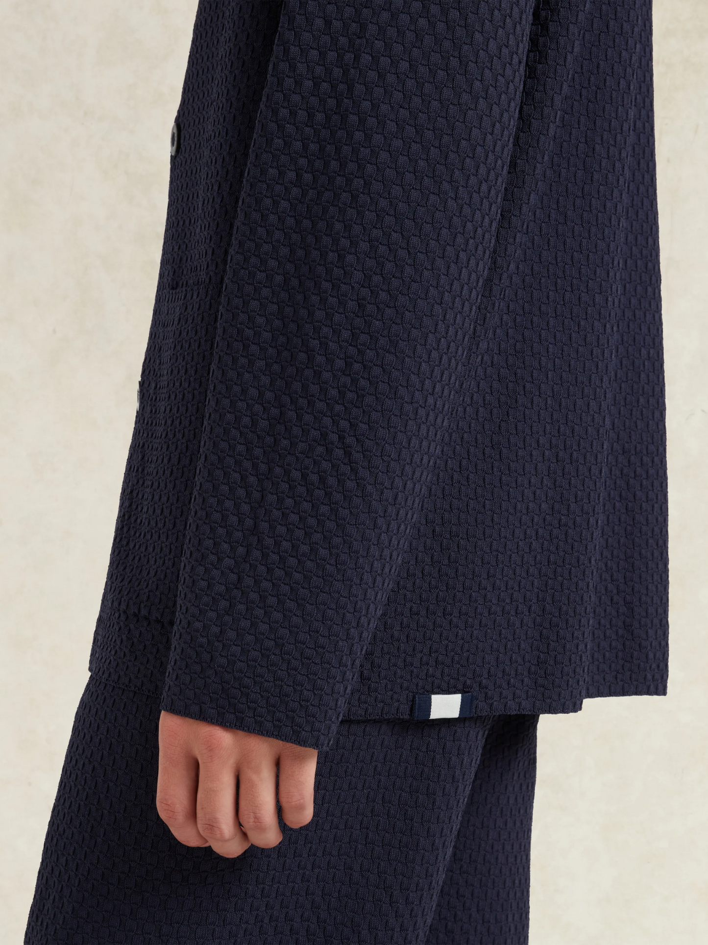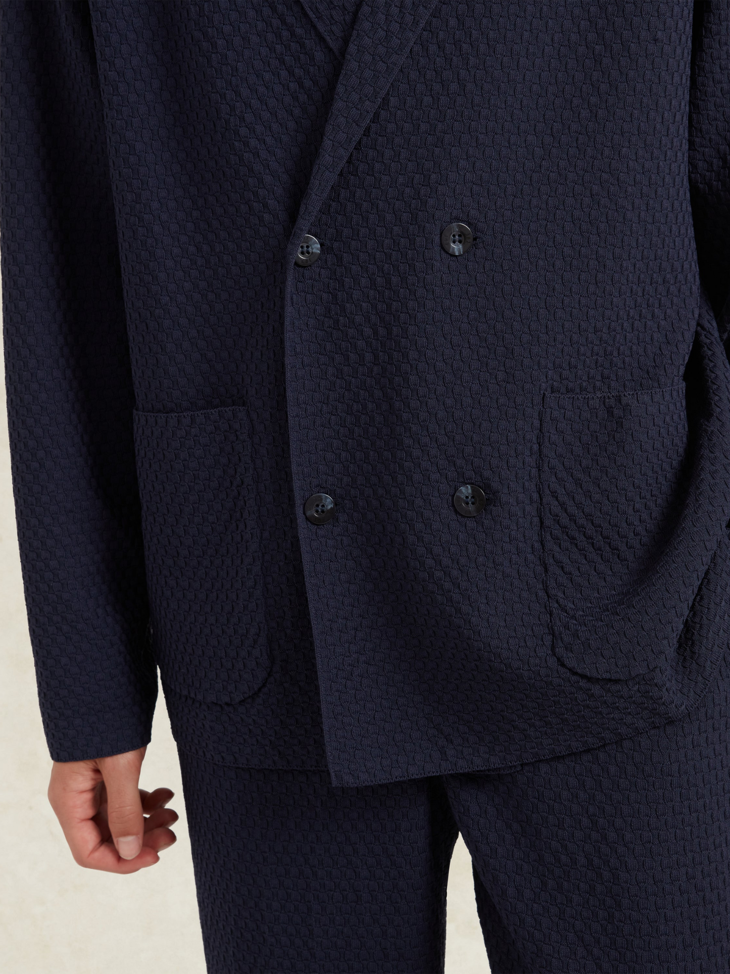 Knitted with a lustrous viscose blend yarn, the fabric drapes beautifully with a subtle sheen, adding a relaxed fit to the double breasted shape. Model is 188cm tall and wears a size M.