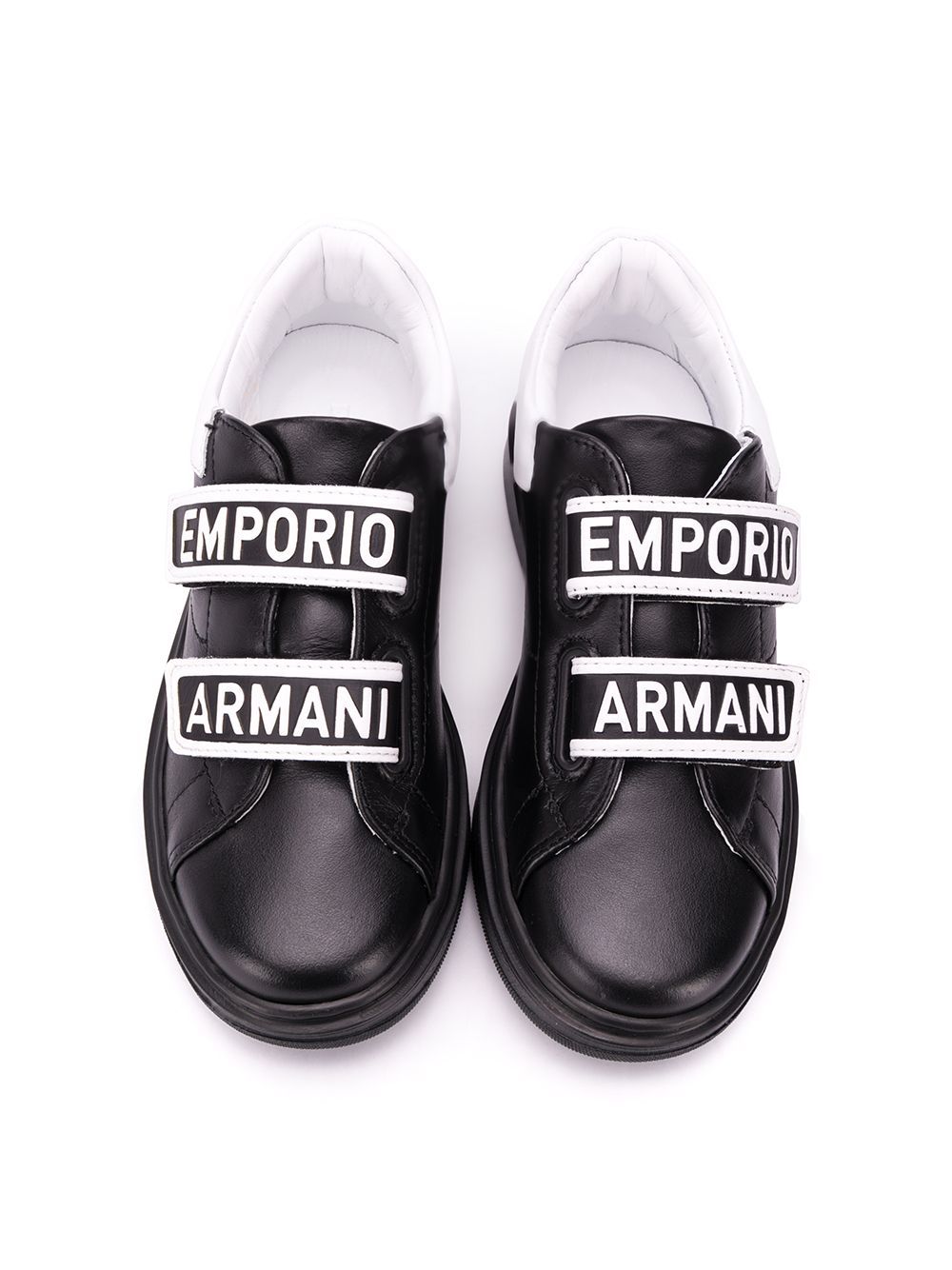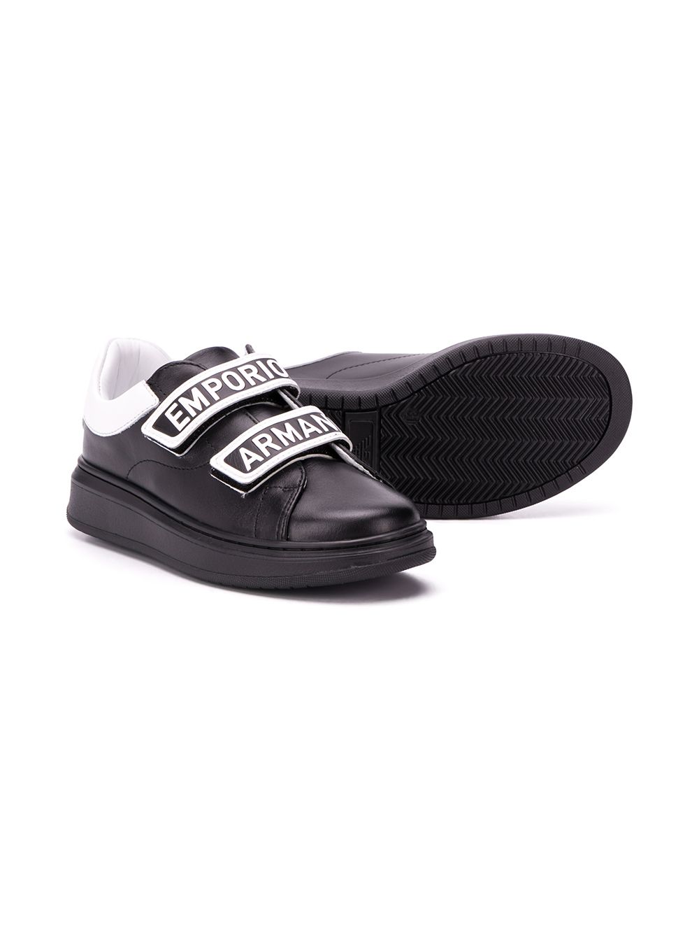 حذاء رياضي من جلد العجل باللونين الأسود والأبيض مع حزام لمس بشعار من الجلد من Emporio Armani Kids يتميز بمقدمة مستديرة وحزام على شكل حرف T ونعل مطاطي مسطح.