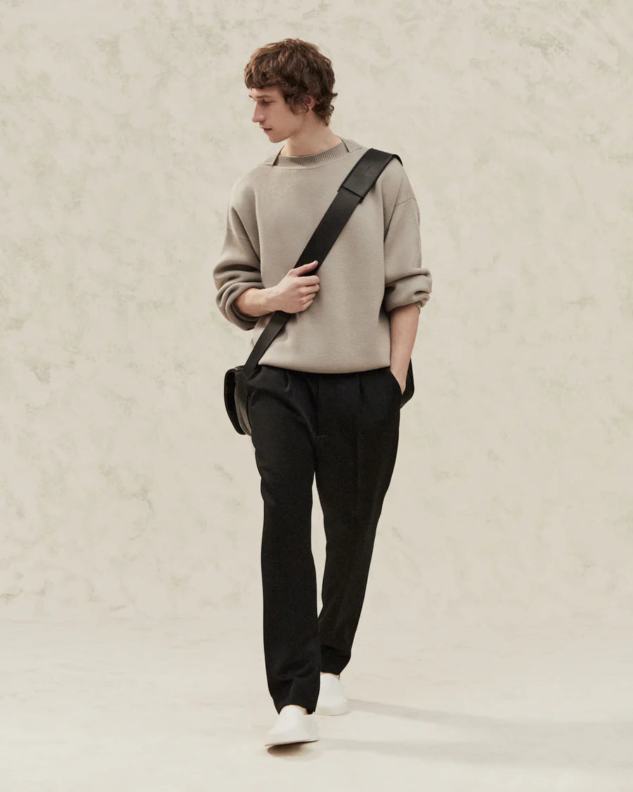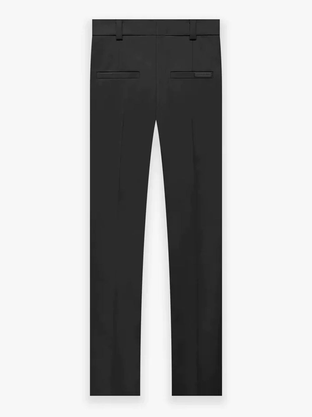 بنطال "إترنال" مصنوع من نسيج صوف الفرسان الإنجليزي المائل، ليعكس أناقة خالدة من خلال بنيته وملمسه ومتانته. يتميز بقصة ضيقة (سليم فيت) وساق مستقيمة وخصر متوسط ودرزة داخلية منخفضة قليلاً. تشمل التفاصيل الإضافية جيوبًا أمامية مائلة، وجيوبًا خلفية، وقفلًا داخليًا أنيقًا بخطاف. ملصق جلدي يحمل شعار "خوف من الله" مطرز على الجيب الخلفي.