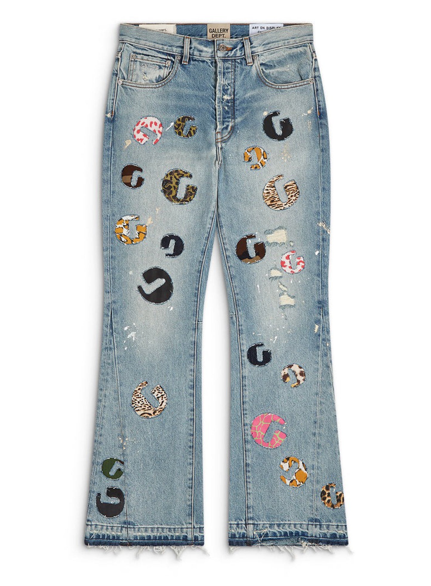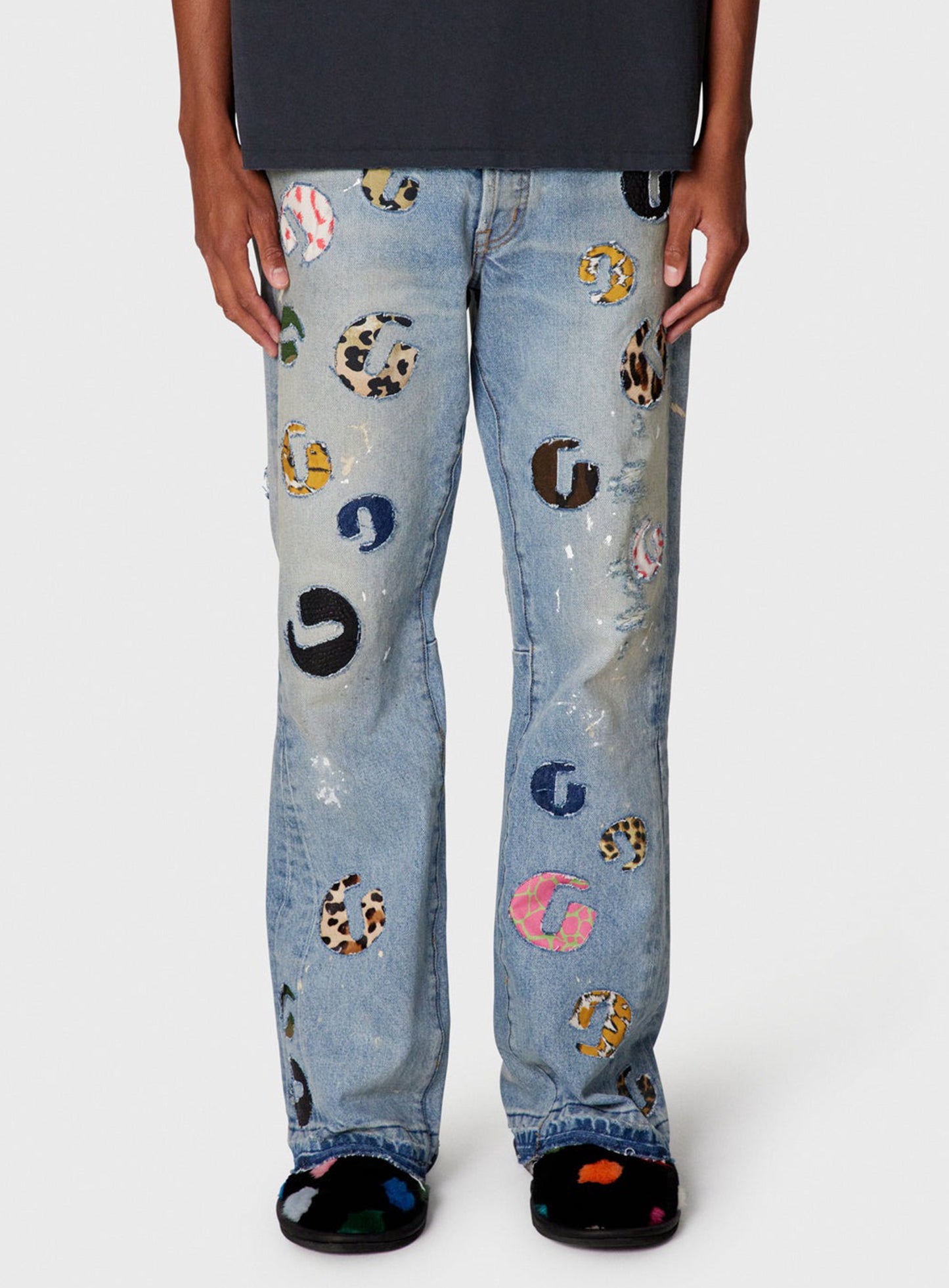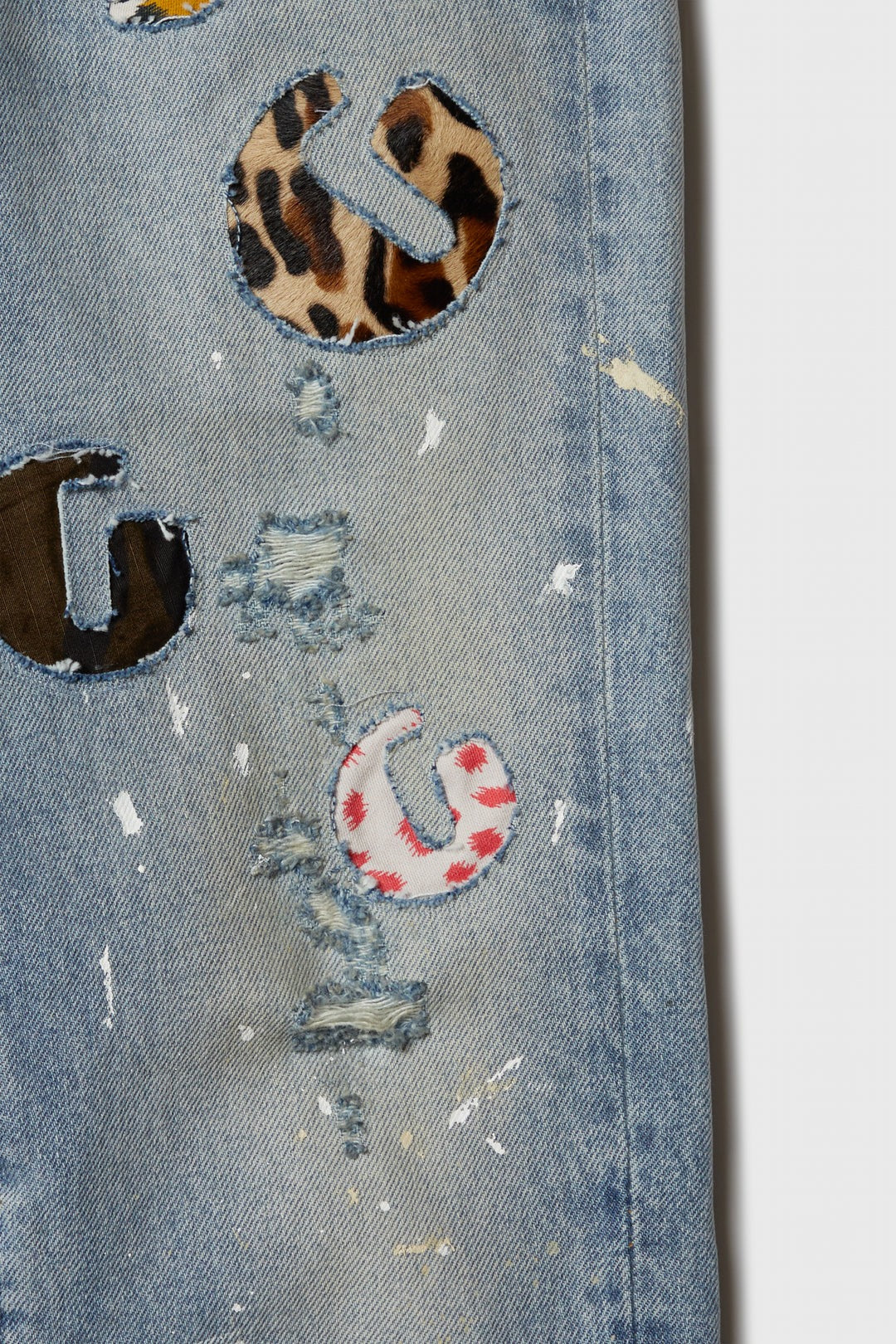 - قصة متوسطة الارتفاع، قصة ساق واسعة، حلقات للحزام، خمسة جيوب، ممزقات مع حشوات مرقعة، تأثير تناثر الطلاء، تطريز الشعار على الجيب الأمامي، لوحة مصممة في الخلف، تصميم متين، لمسة نهائية باهتة ومغسولة