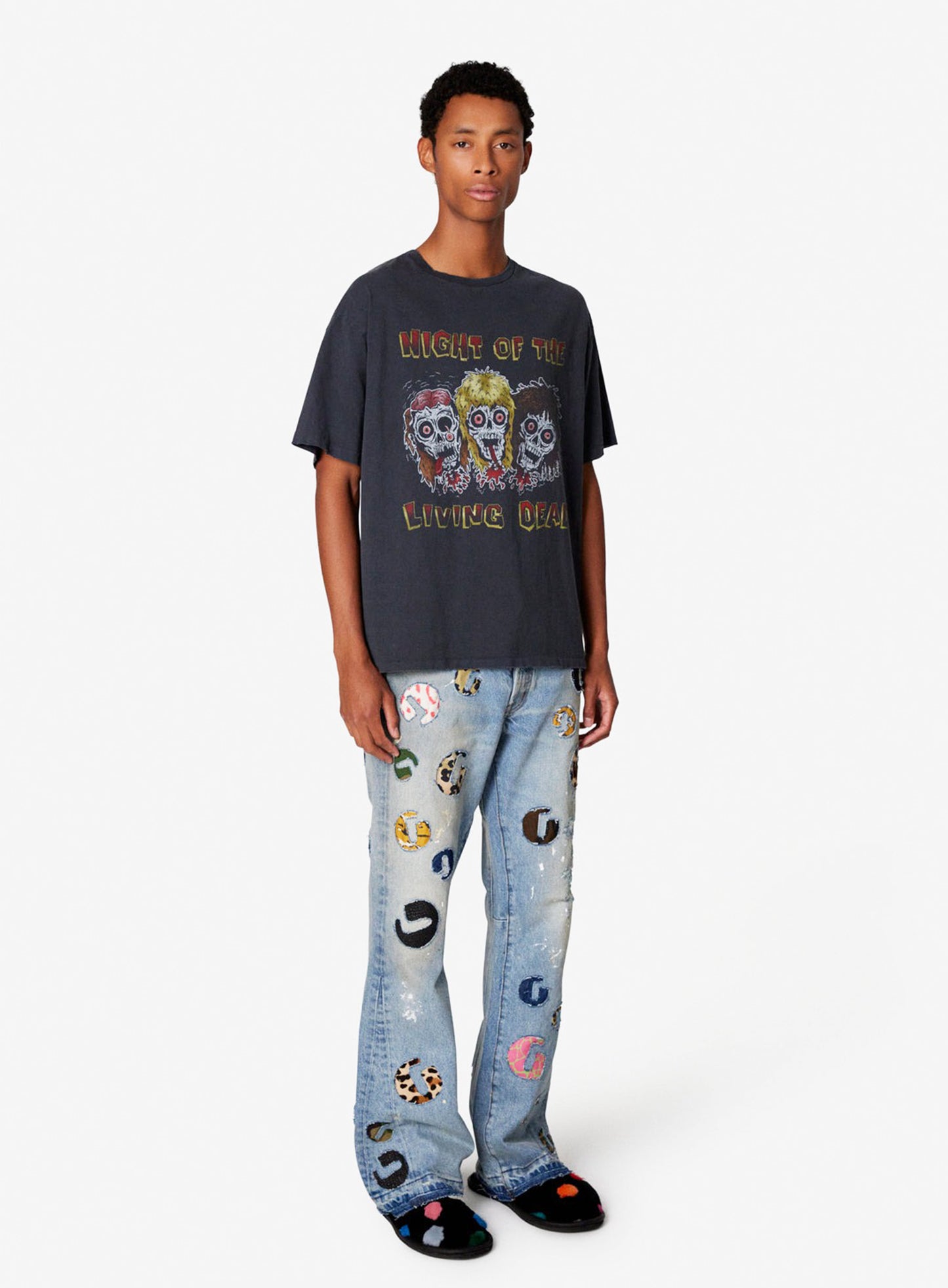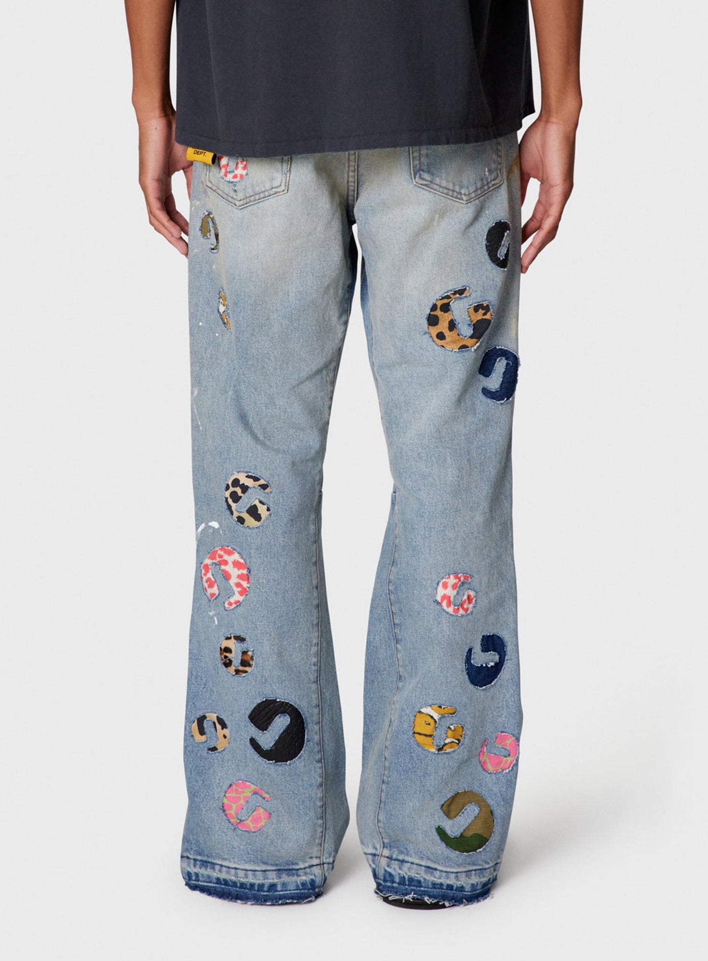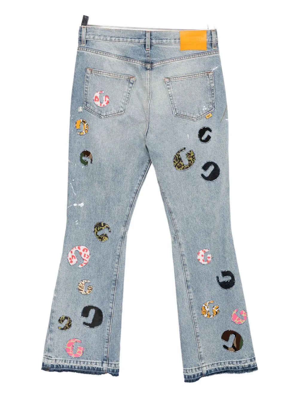 - قصة متوسطة الارتفاع، قصة ساق واسعة، حلقات للحزام، خمسة جيوب، ممزقات مع حشوات مرقعة، تأثير تناثر الطلاء، تطريز الشعار على الجيب الأمامي، لوحة مصممة في الخلف، تصميم متين، لمسة نهائية باهتة ومغسولة