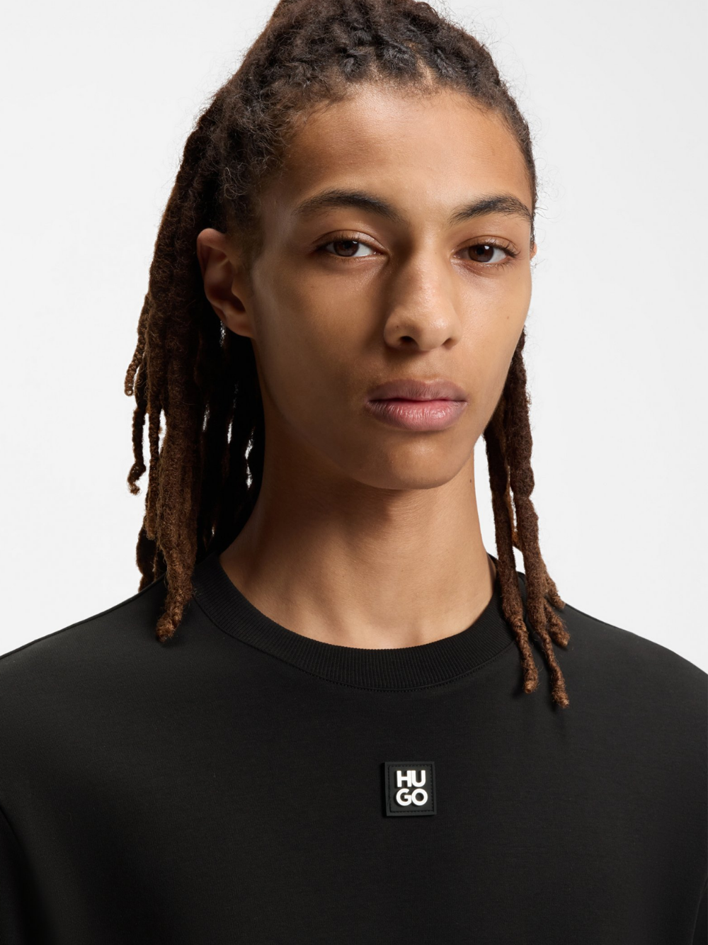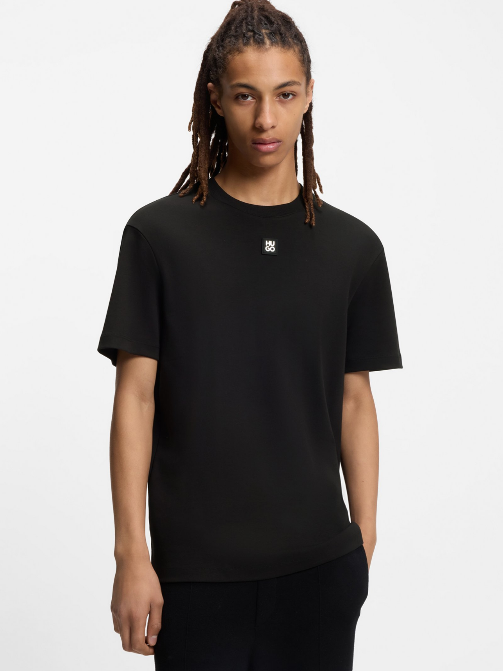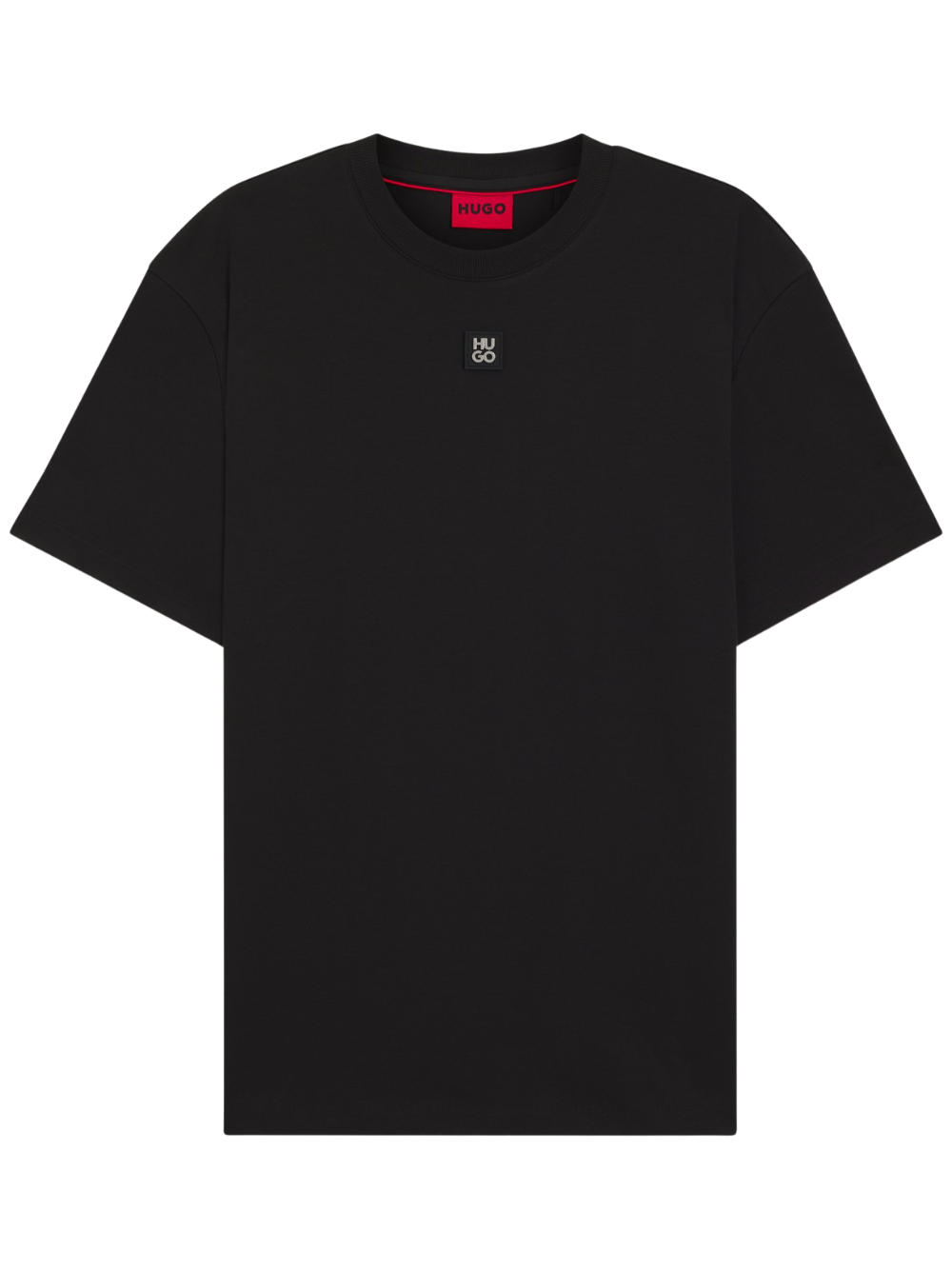 Featuring a metallic stacked-logo badge at the centre chest, this HUGO Menswear T-shirt is cut in luxuriously soft interlock cotton. Regular fit.