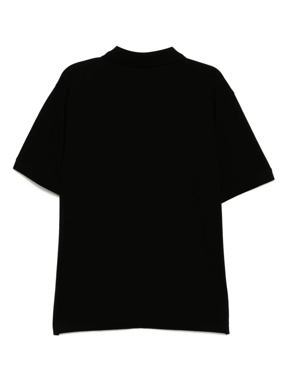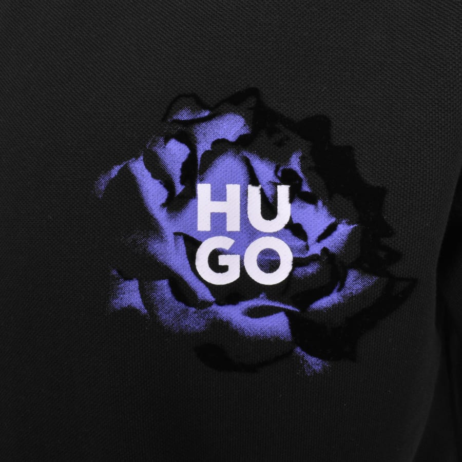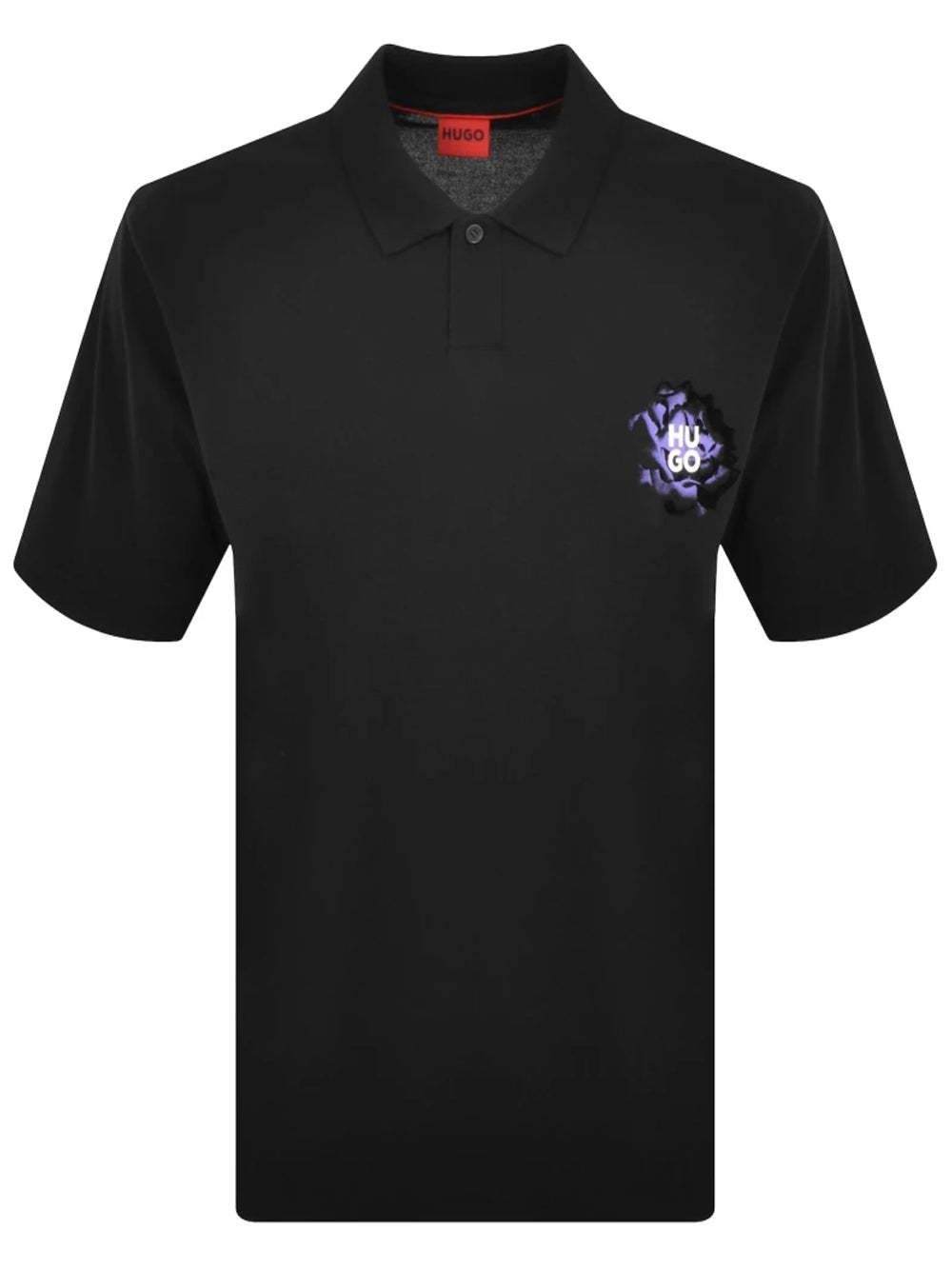 تيشيرت بولو هوغو دينيبولو أسود. يتميز بياقة مضلعة وأكمام قصيرة مضلعة بزر واحد. شعار هوغو المميز مطبوع على يسار الصدر بلون بنفسجي فاتح، مع طباعة جرافيكية أسفله بتصميم منفوش باللونين الأسود والأرجواني. قطن ١٠٠٪.