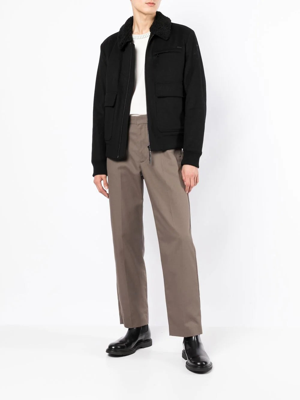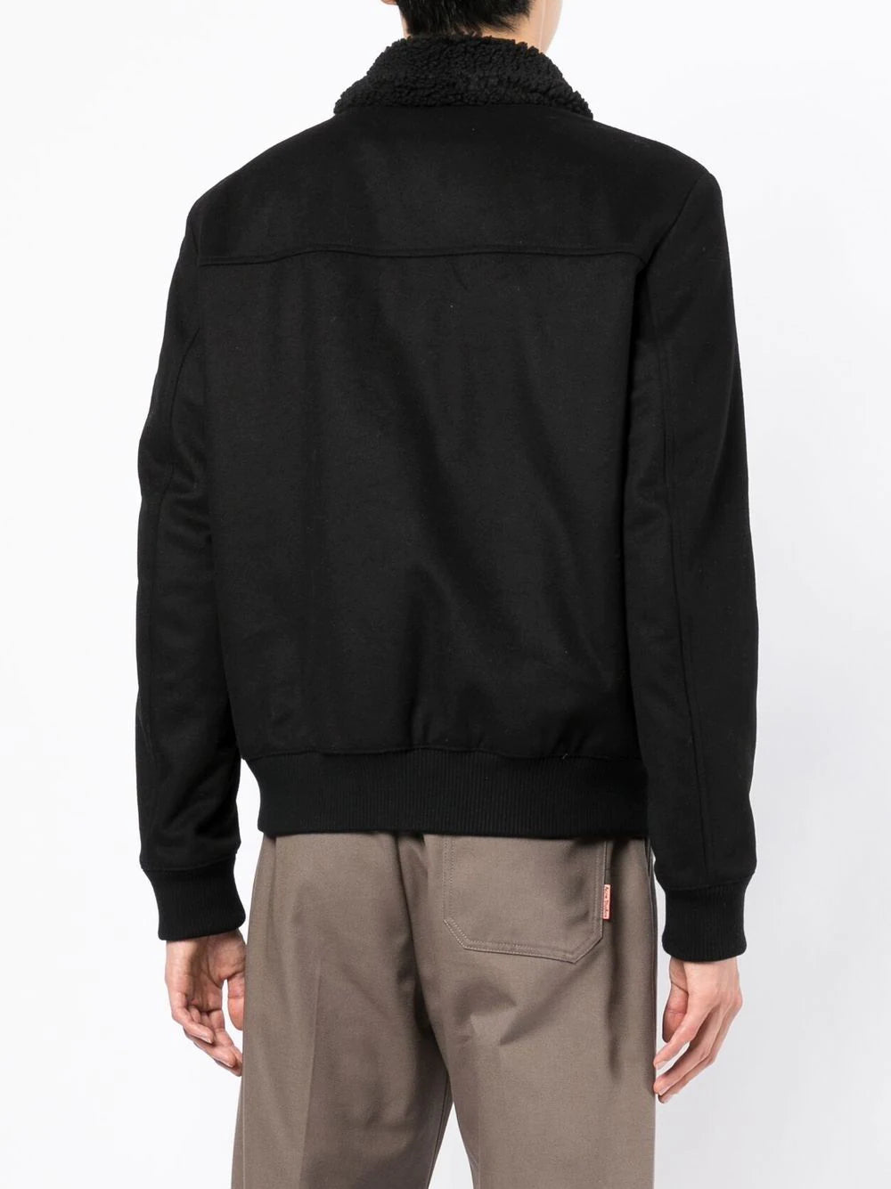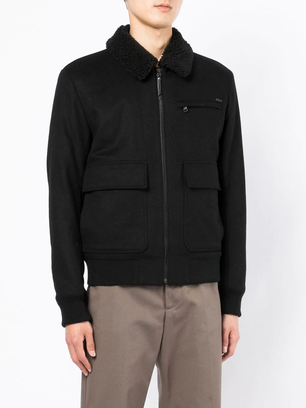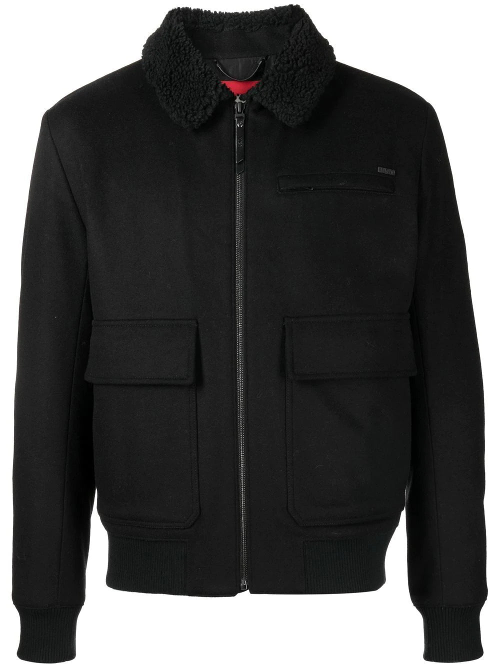 جاكيت من الصوف البكر بياقة من فرو الغنم من هوجو، يتميز باللون الأسود، مزيج من الصوف البكر والكشمير، وياقة من فرو الغنم، وطباعة الشعار على الصدر، وسحاب أمامي للغلق، وجيب على الصدر بسحاب، وجيبان أماميان، وأكمام طويلة وحاشية مستقيمة.