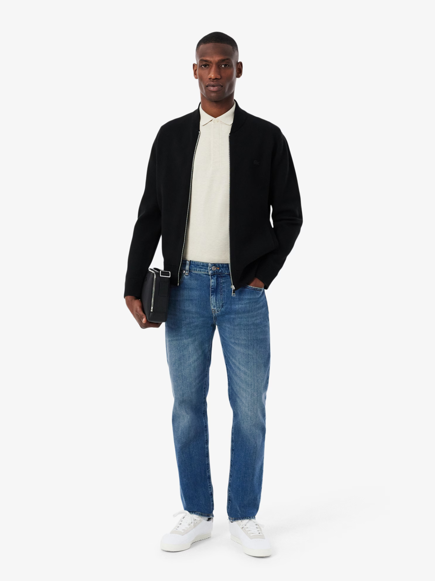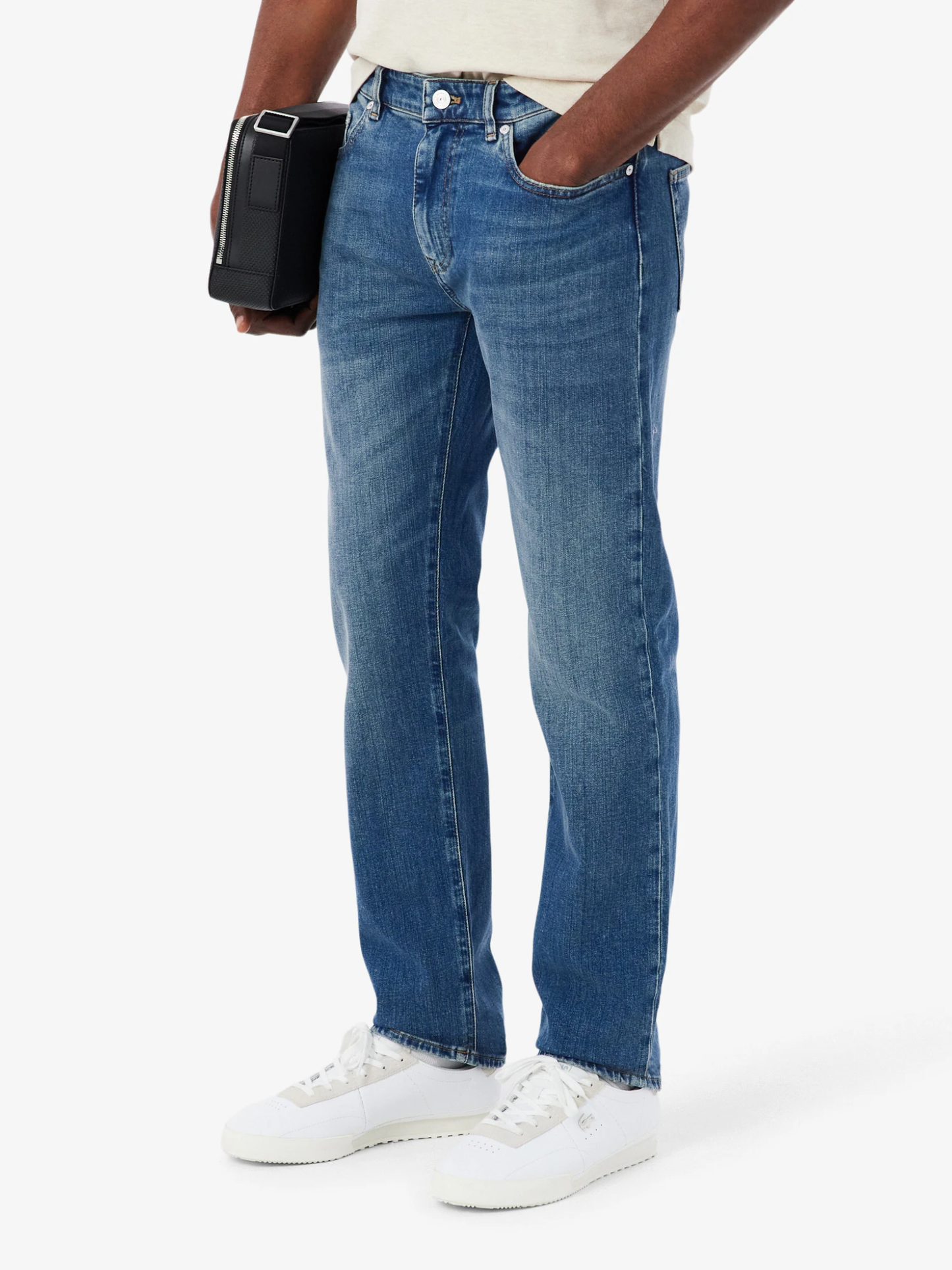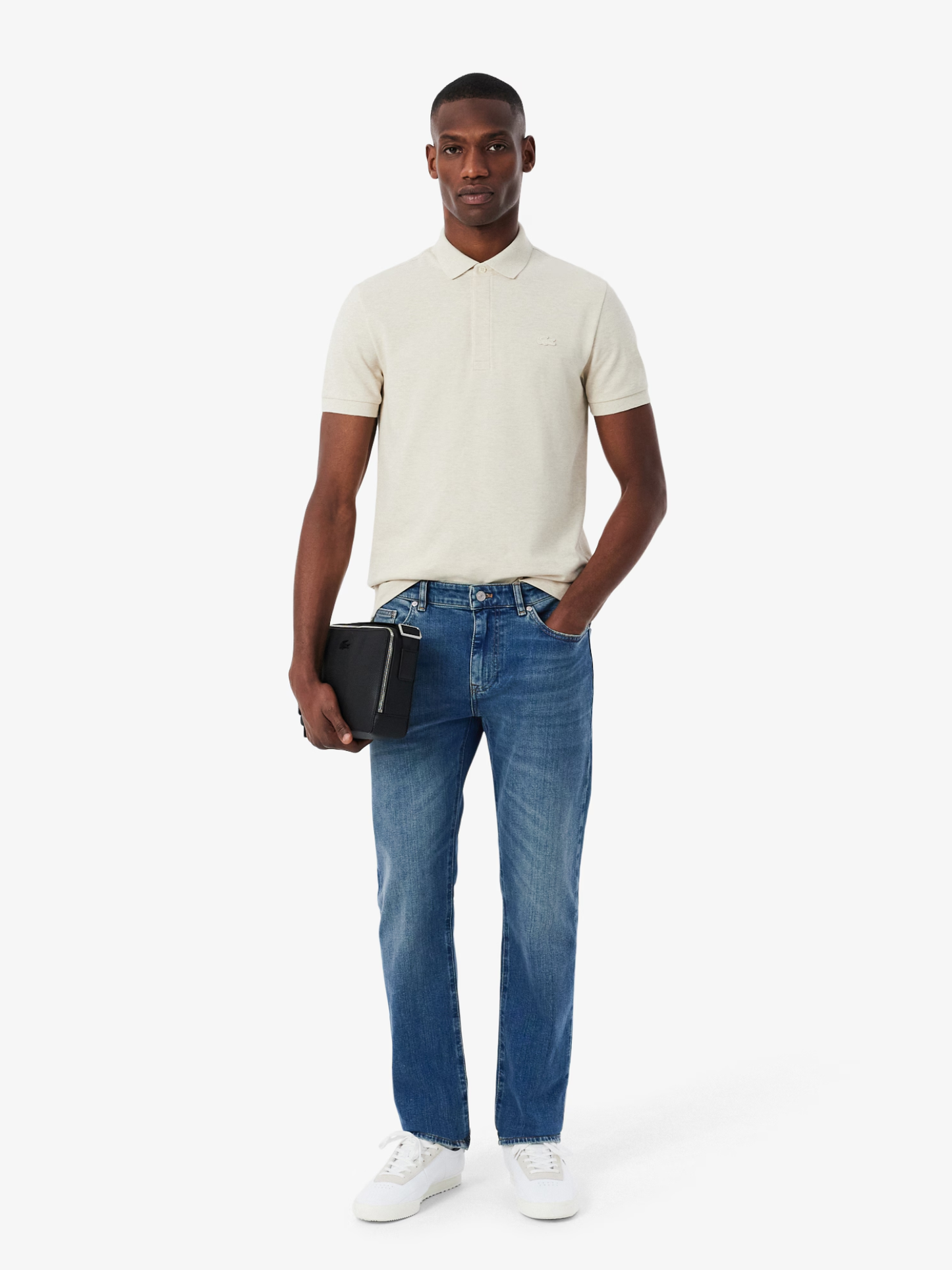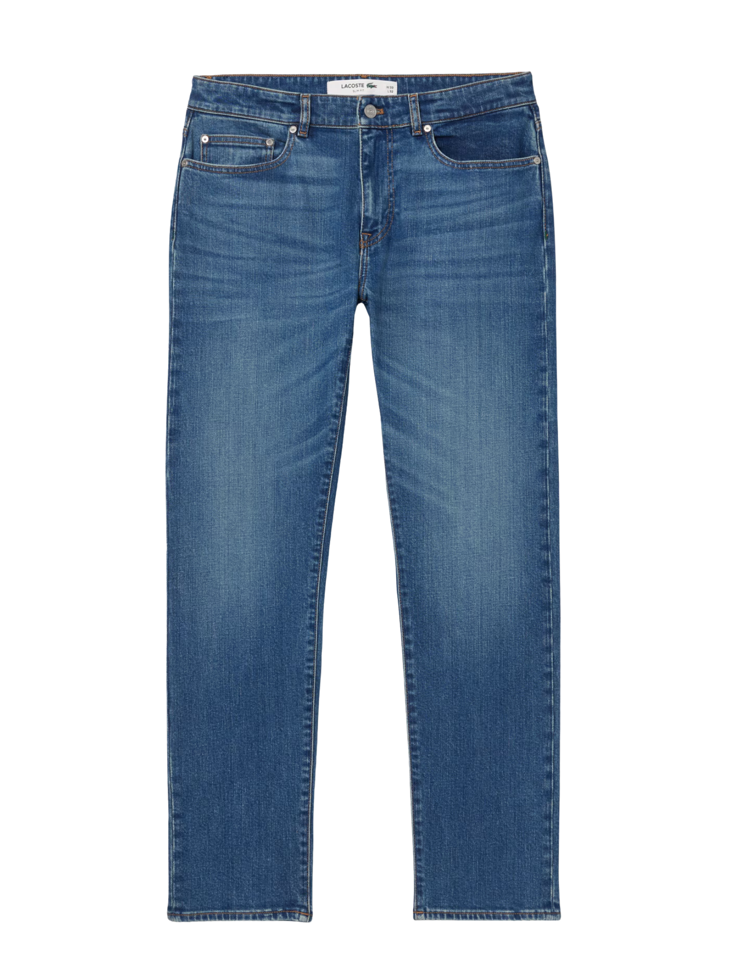 These jeans are a menswear essential, with a modern fitted cut and a comfortable stretch denim fabric. The classic five-pocket design is finished with classic Lacoste details: a rivet coated in our signature shade of green, topstitching features, and the print inside the pockets.