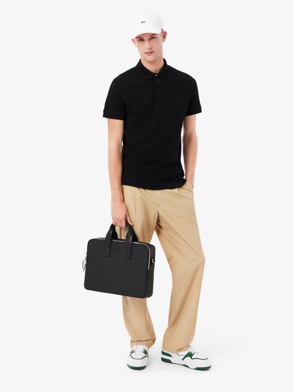 This elegant, roomy leather bag from Lacoste is designed to hold a 15” laptop. The practical design can be carried in the hand or cross-body using the adjustable strap. Made from iconic textured leather, made to resemble a golf ball. A timeless design, perfect for the office or for work trips.
