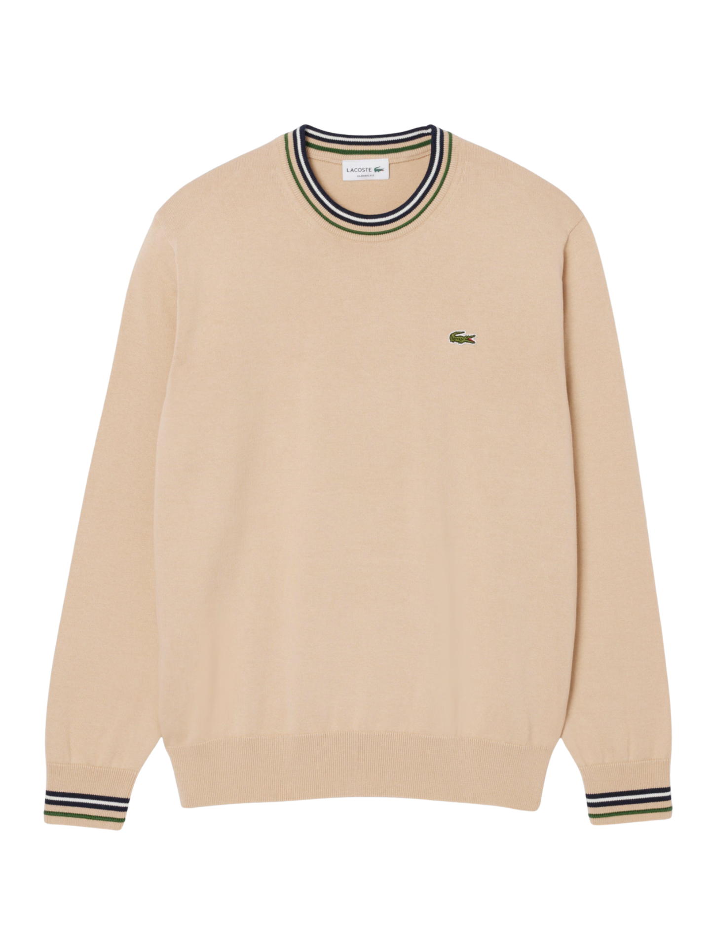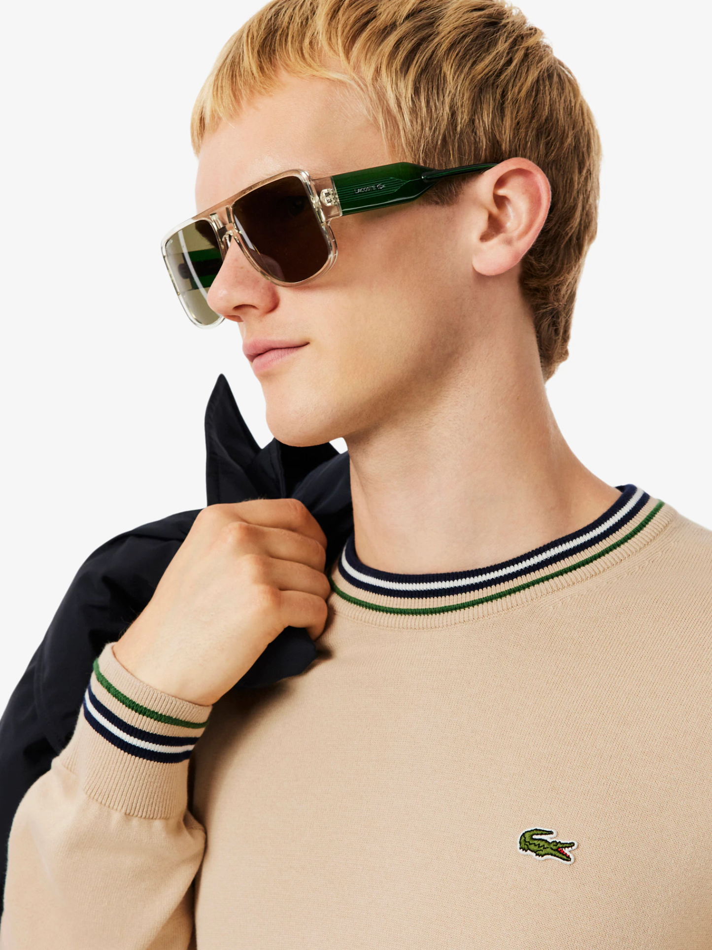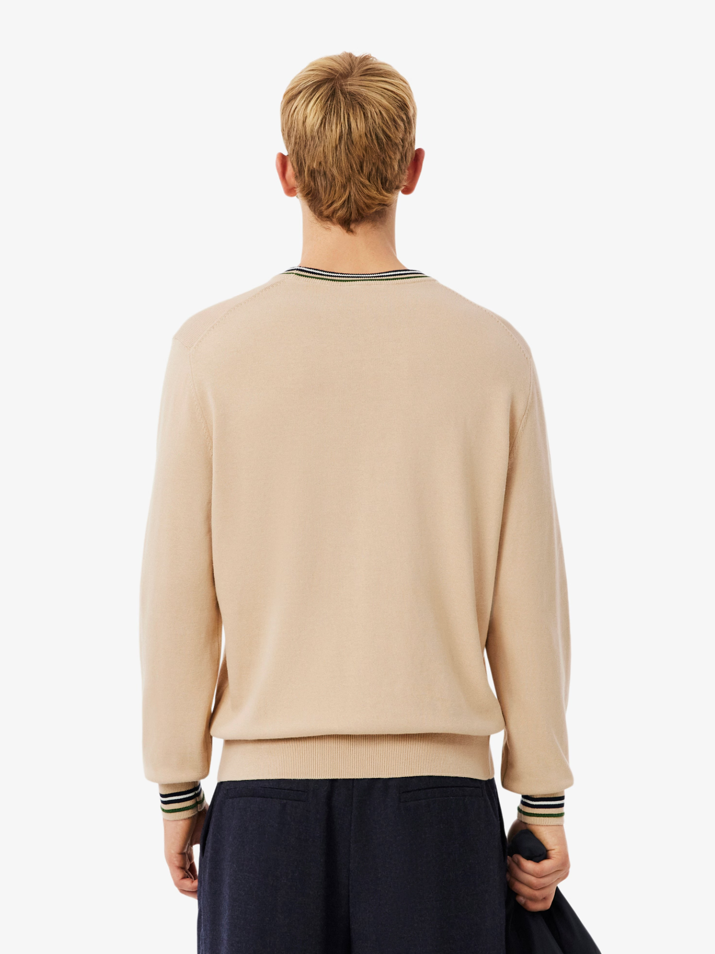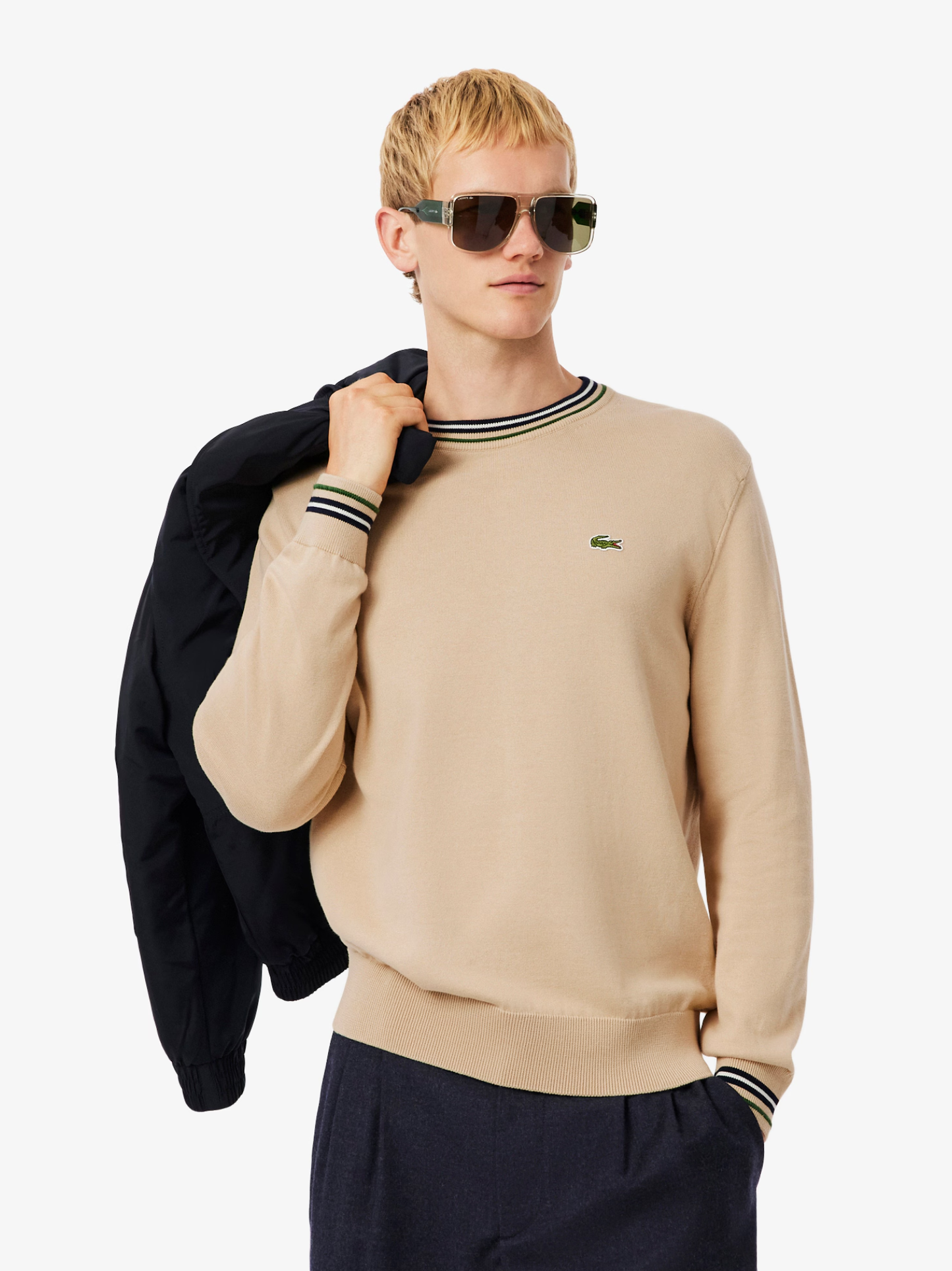This sweater is the result of 90 years of Lacoste elegance and knitwear expertise. Made from comfortable cotton jersey with contrast stripes, finished with subtle textured stitch details. A chic, timeless piece, finished with a signature embroidered crocodile.