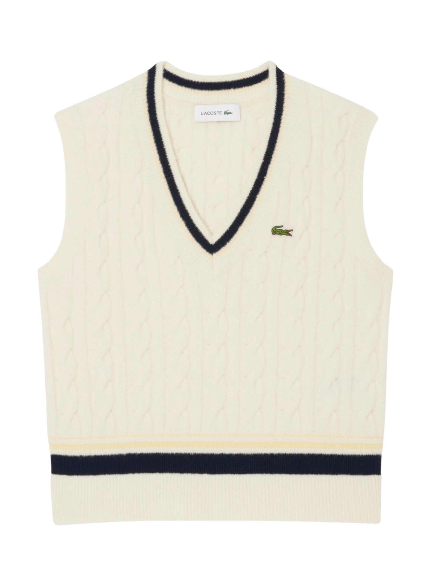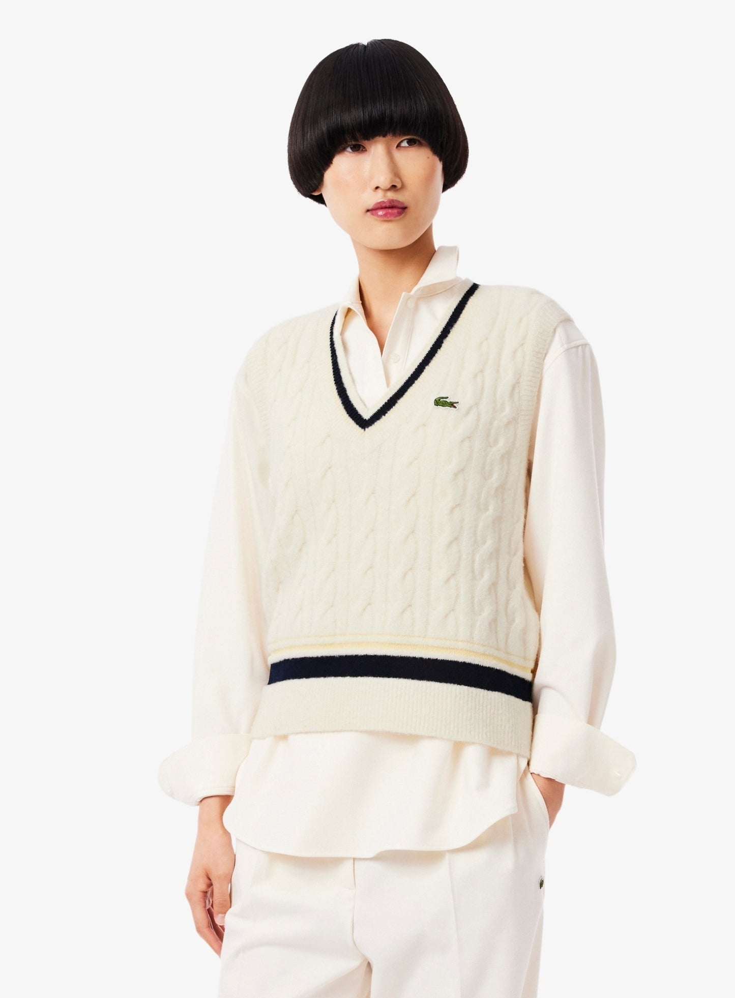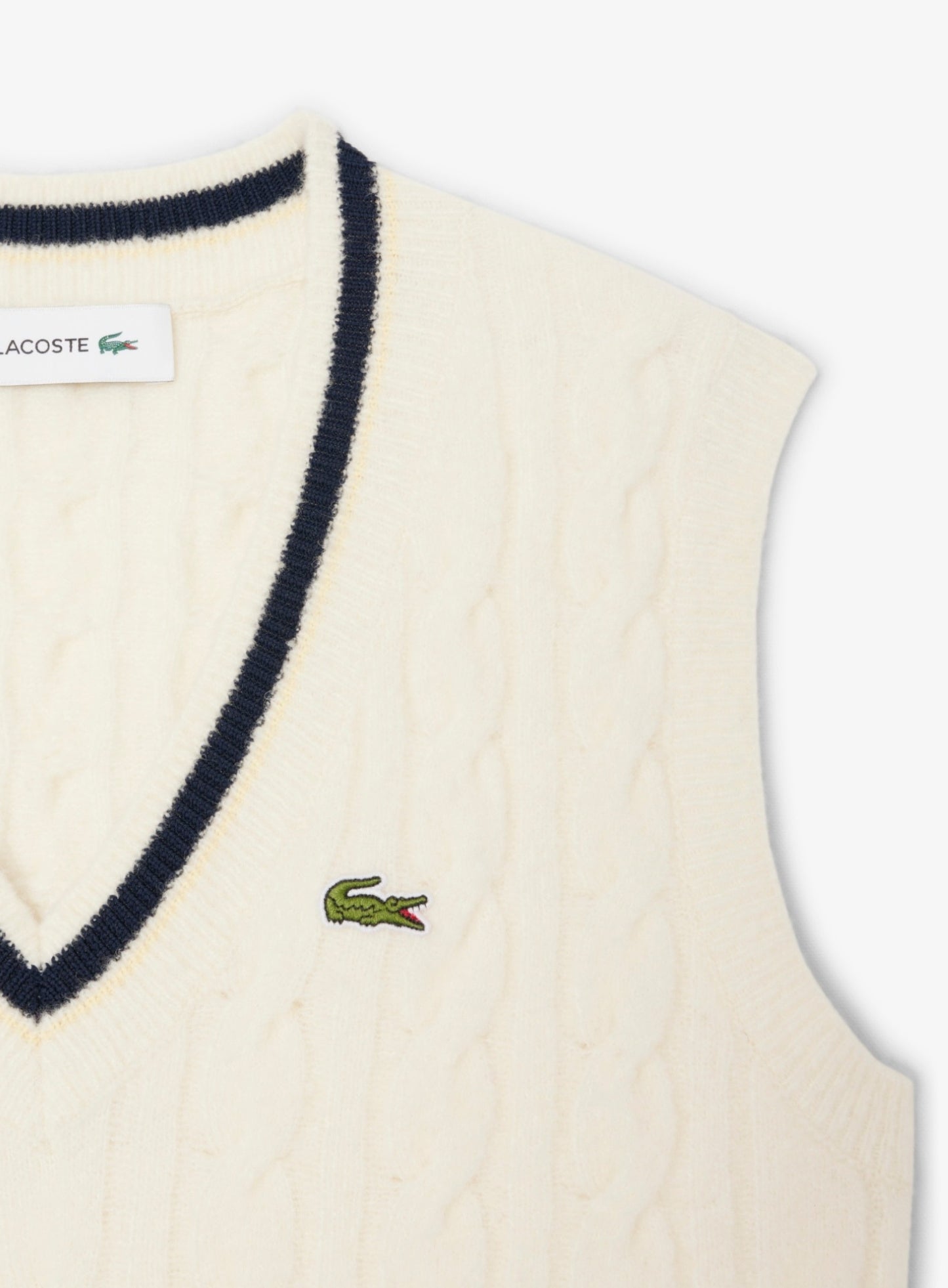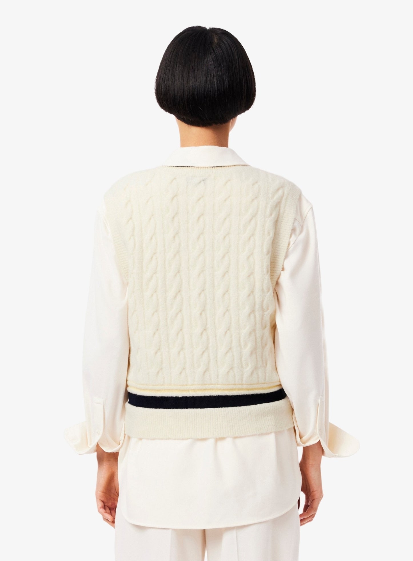 LACOSTE WOMEN Cable Knit Wool Sweater Vest Ecru White