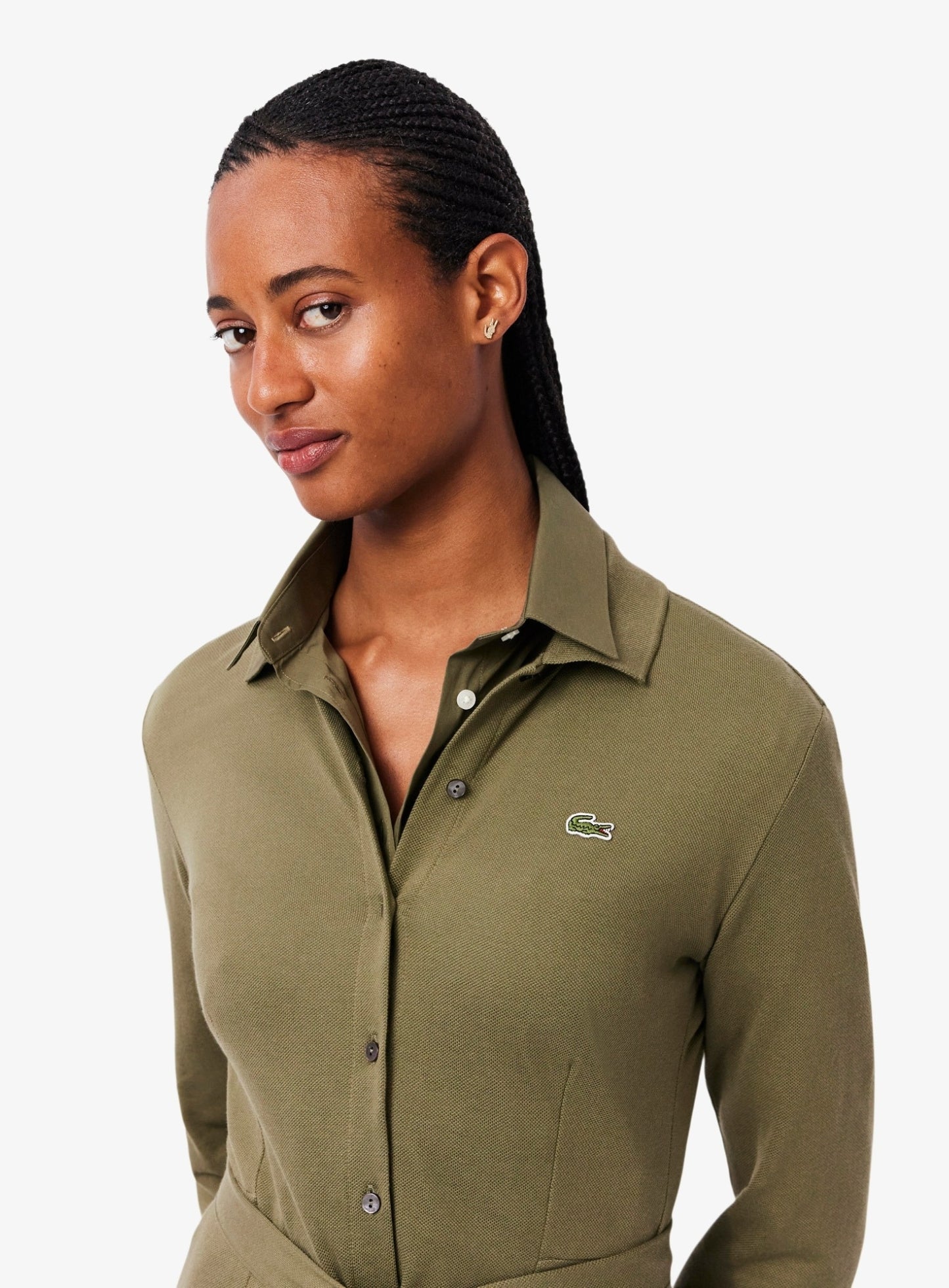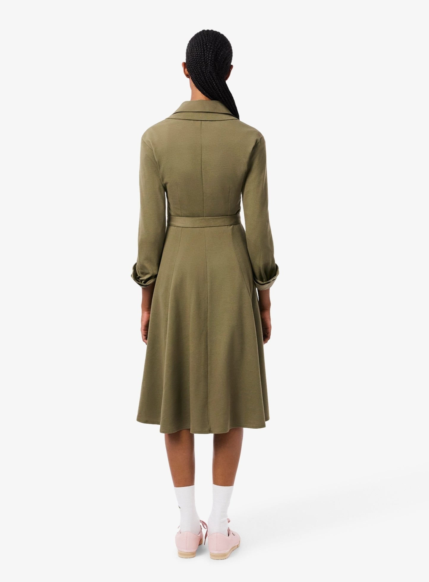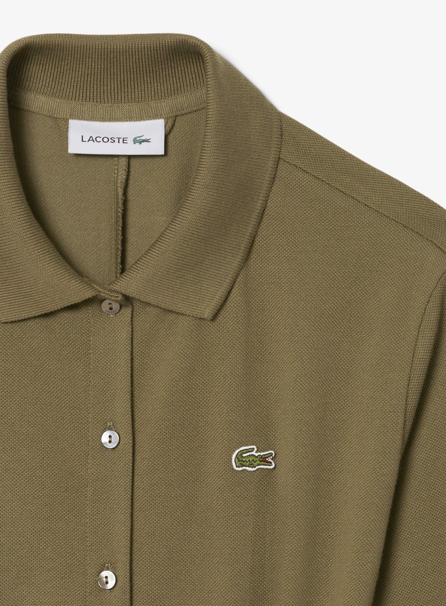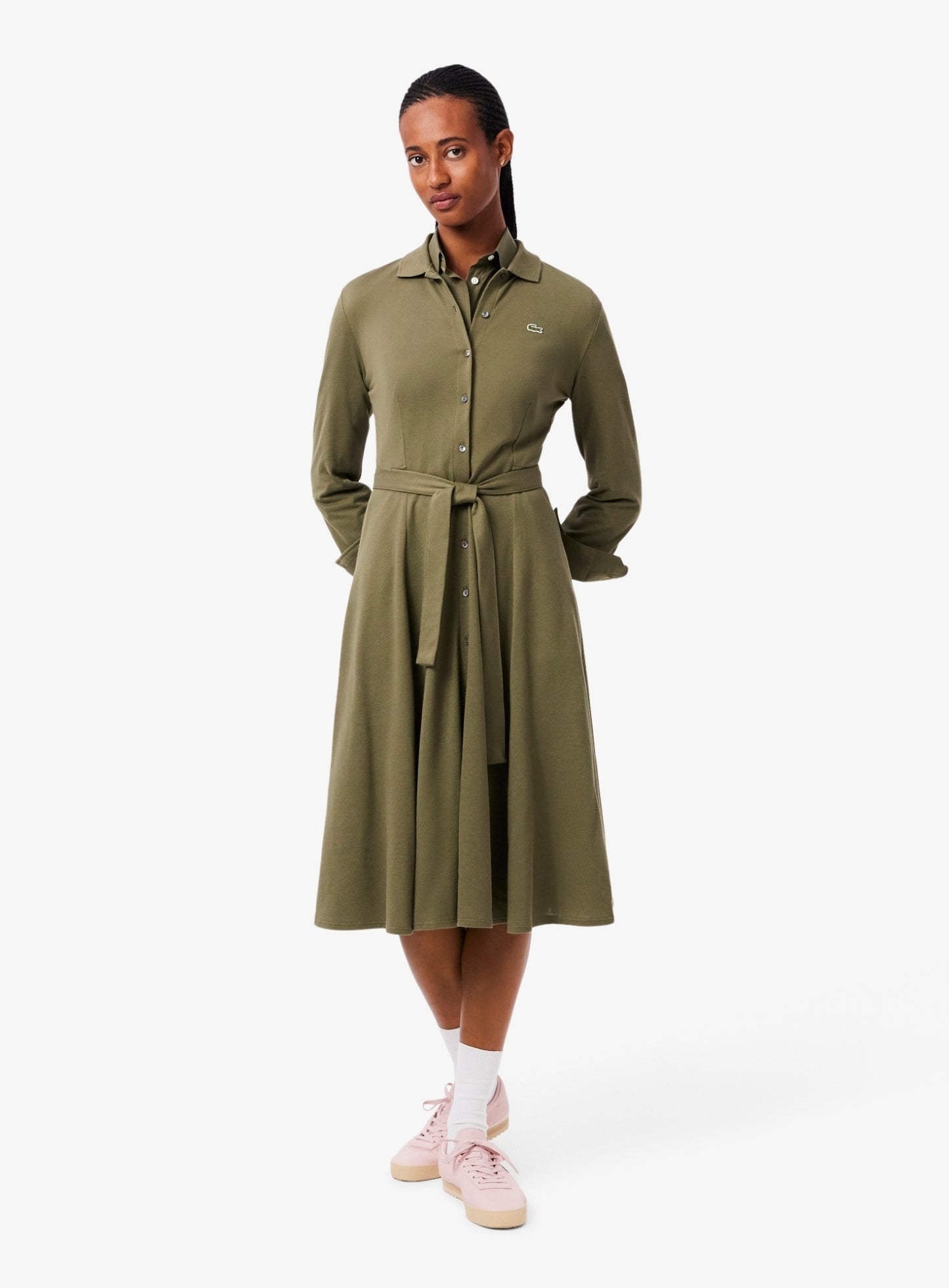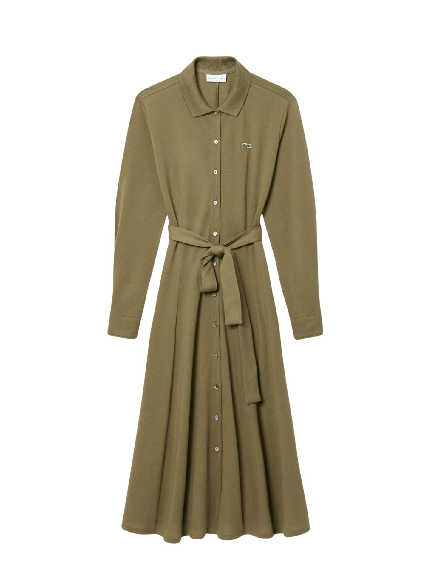 السعر العادي Dhs. 569.00 AEDLACOSTE WOMEN Polo Collar Belted Petit Piqué Dress Khaki Green