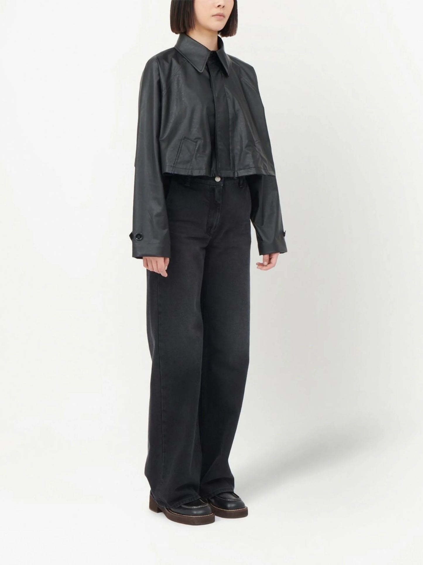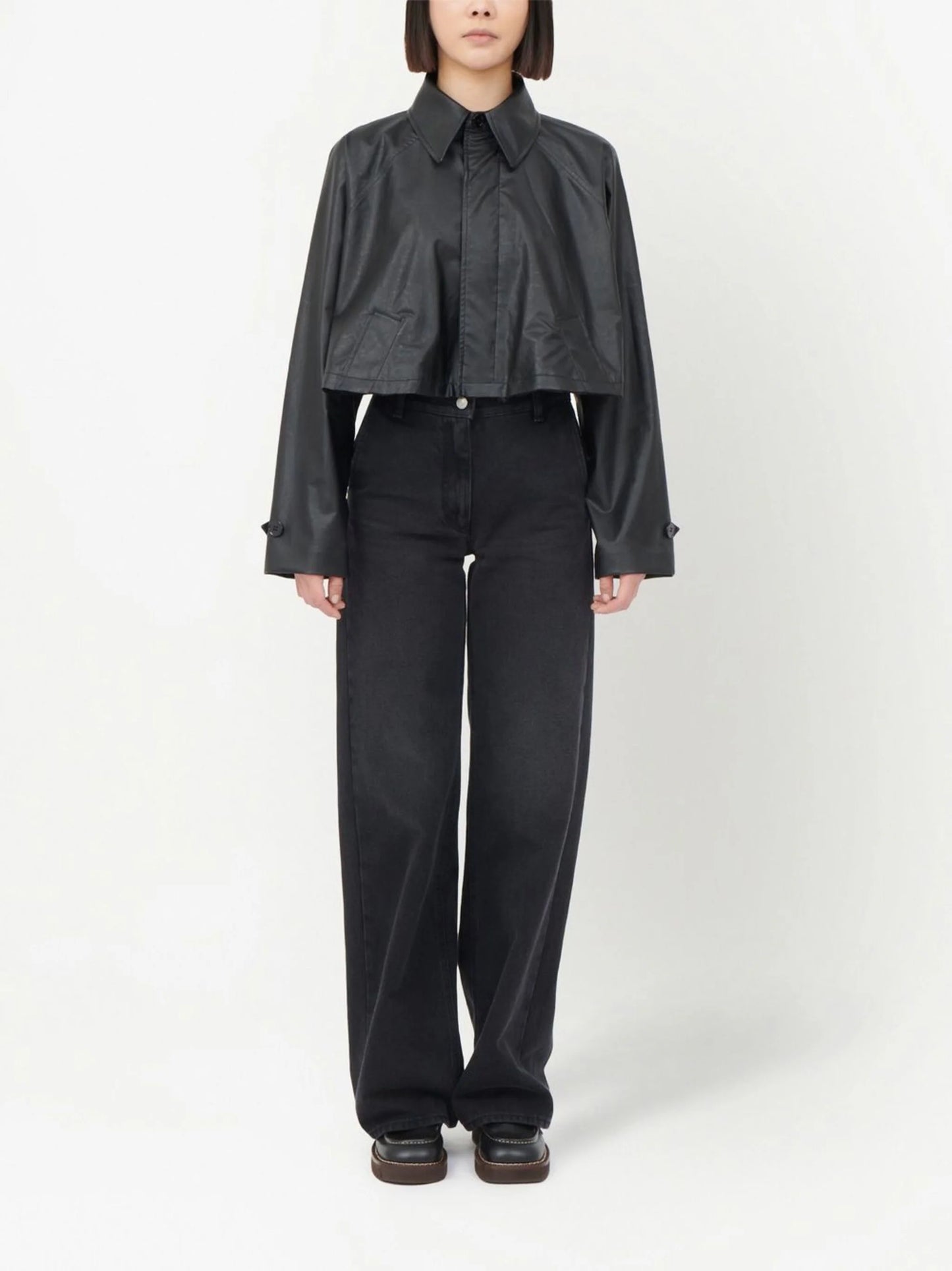 جاكيت قصير من الجلد الصناعي من MM6 Maison Margiela يتميز باللون الأسود والجلد الصناعي وياقة كلاسيكية وأزرار أمامية مخفية وتصميم قصير وواسع وأكمام طويلة وأساور بأزرار وحاشية مستقيمة.