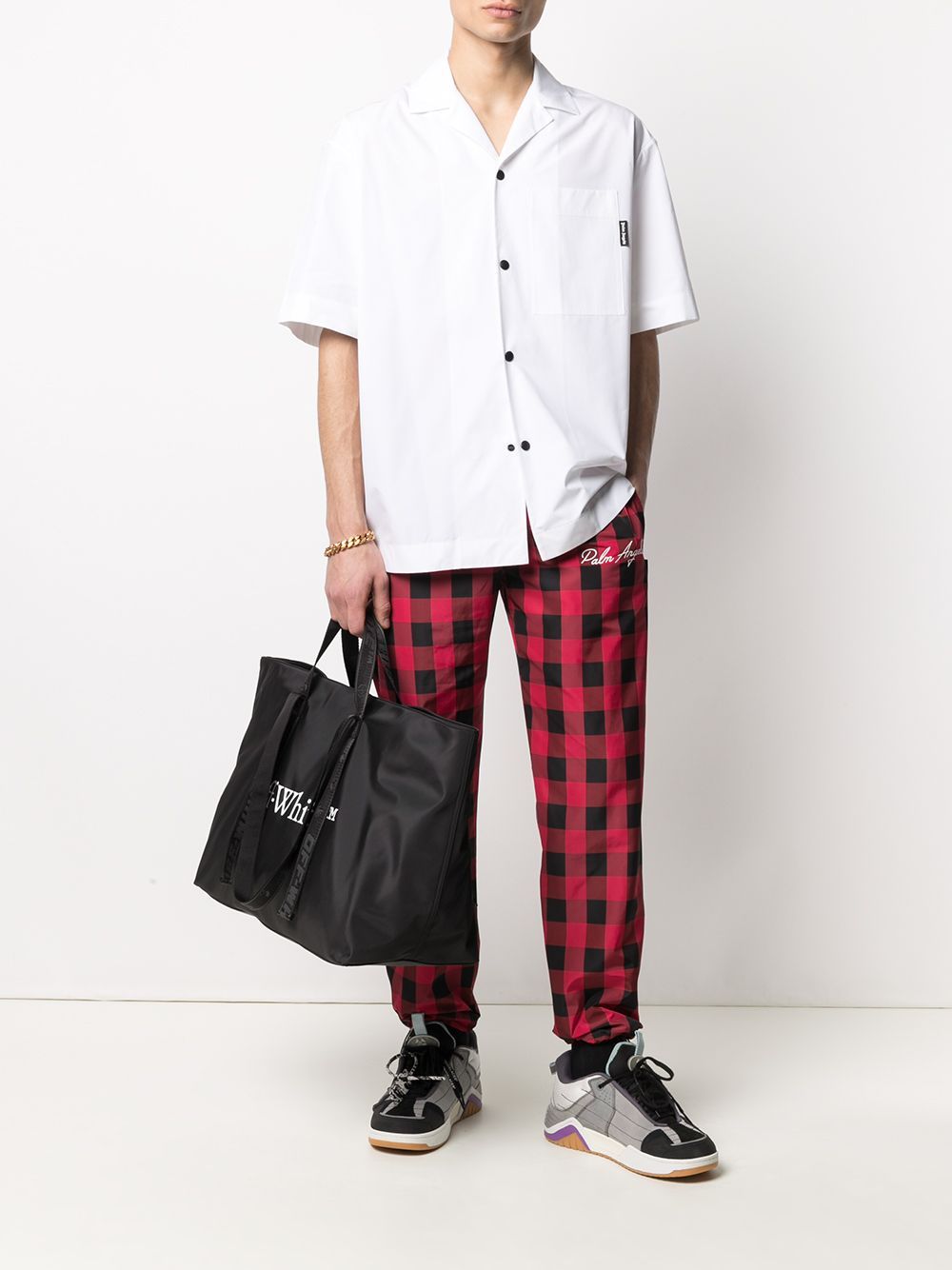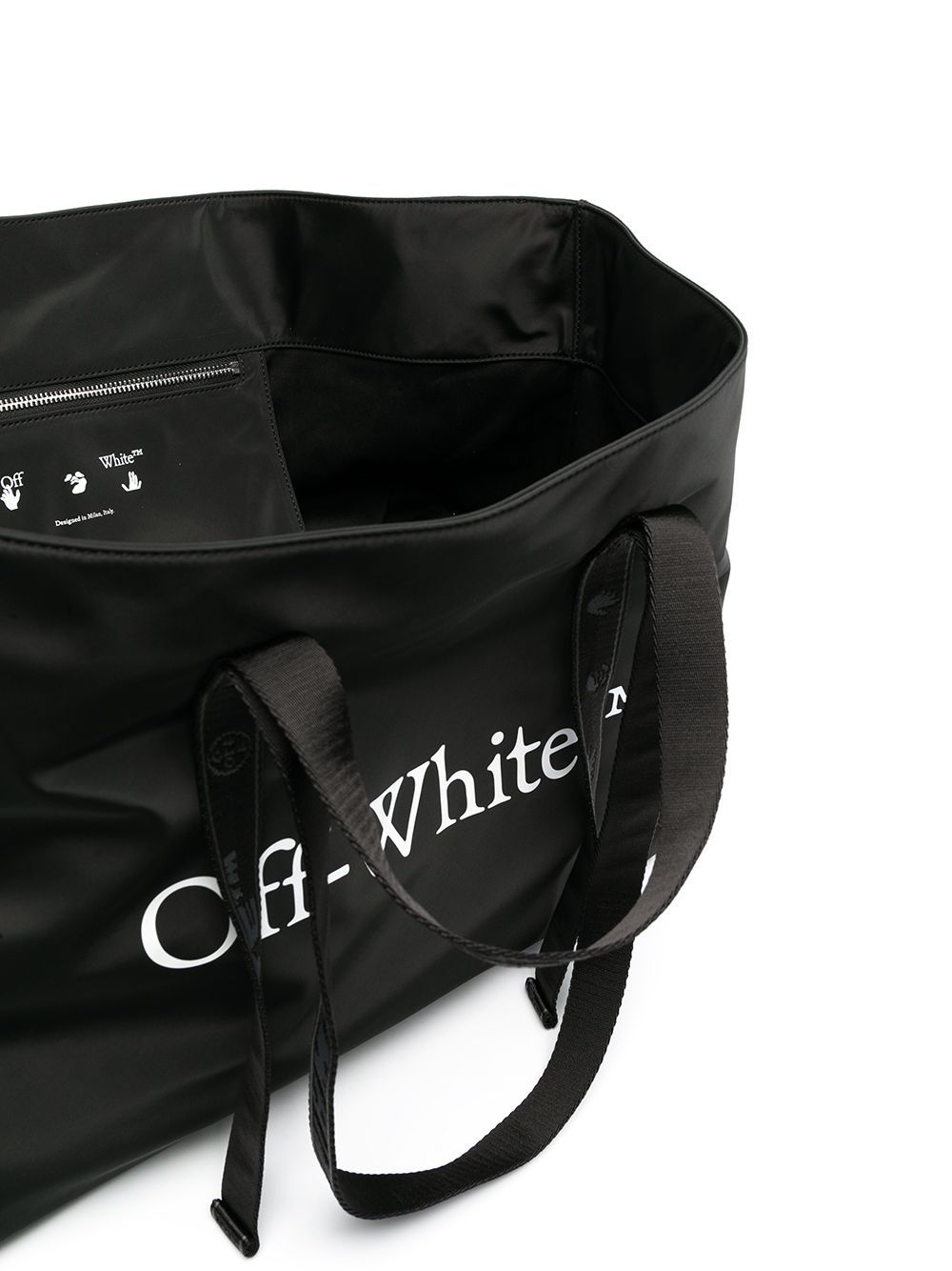 حقيبة تسوق كبيرة أو حقيبة سفر. مصنوعة من القطن ومزينة بشعار مطبوع على الجهة الأمامية، تتميز حقيبة التسوق هذه باللونين الأبيض والأسود من أوف-وايت بمساحة كافية تتسع لجميع أغراضك الأساسية (وكل شيء آخر). احملي أمتعة ثقيلة ولكن أنيقة. تتميز بمقبضين علويين، وحزامين للكتف، وشعار مطبوع على الجهة الأمامية، وتصميم مفتوح من الأعلى، وجيب داخلي رئيسي، وجيب داخلي بسحاب، وإكسسوارات فضية اللون.