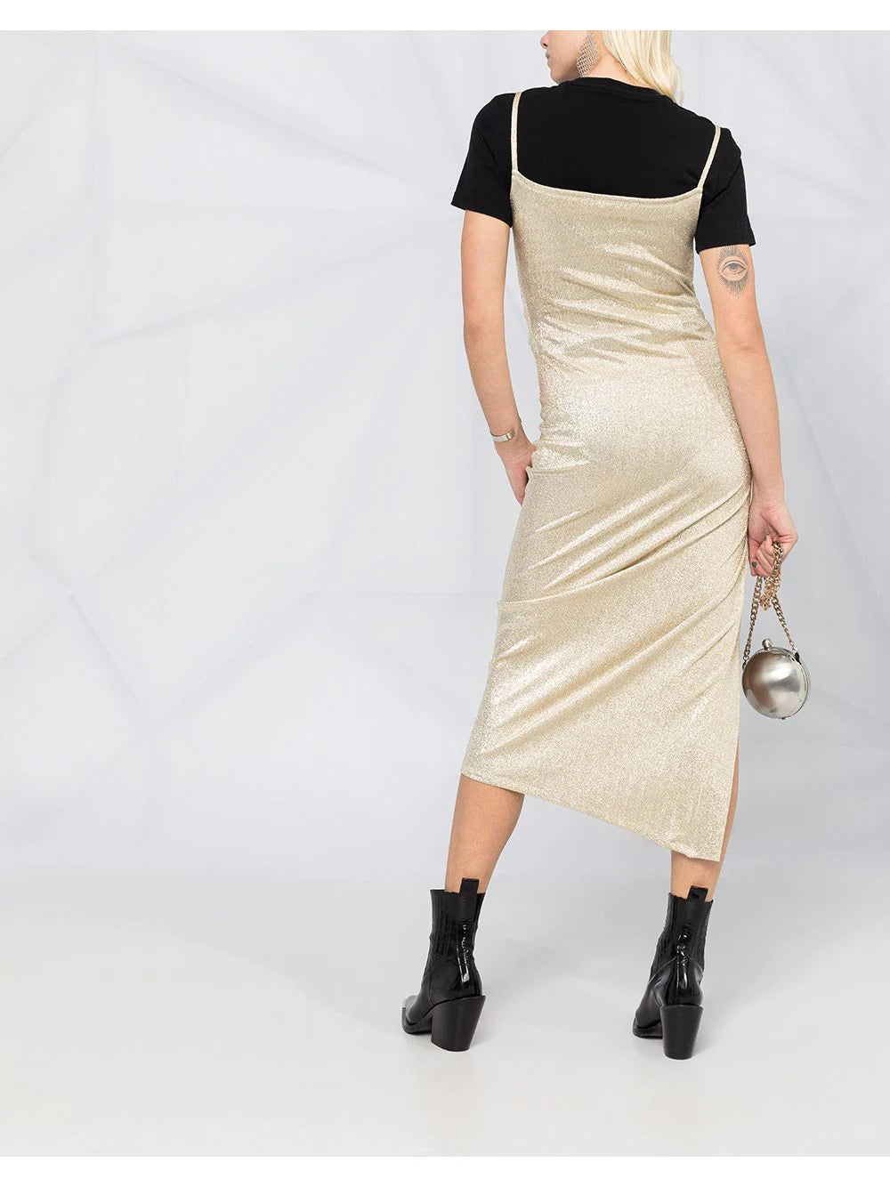 فستان معدني مطوي مع تفاصيل كشكشة بأزرار جانبية