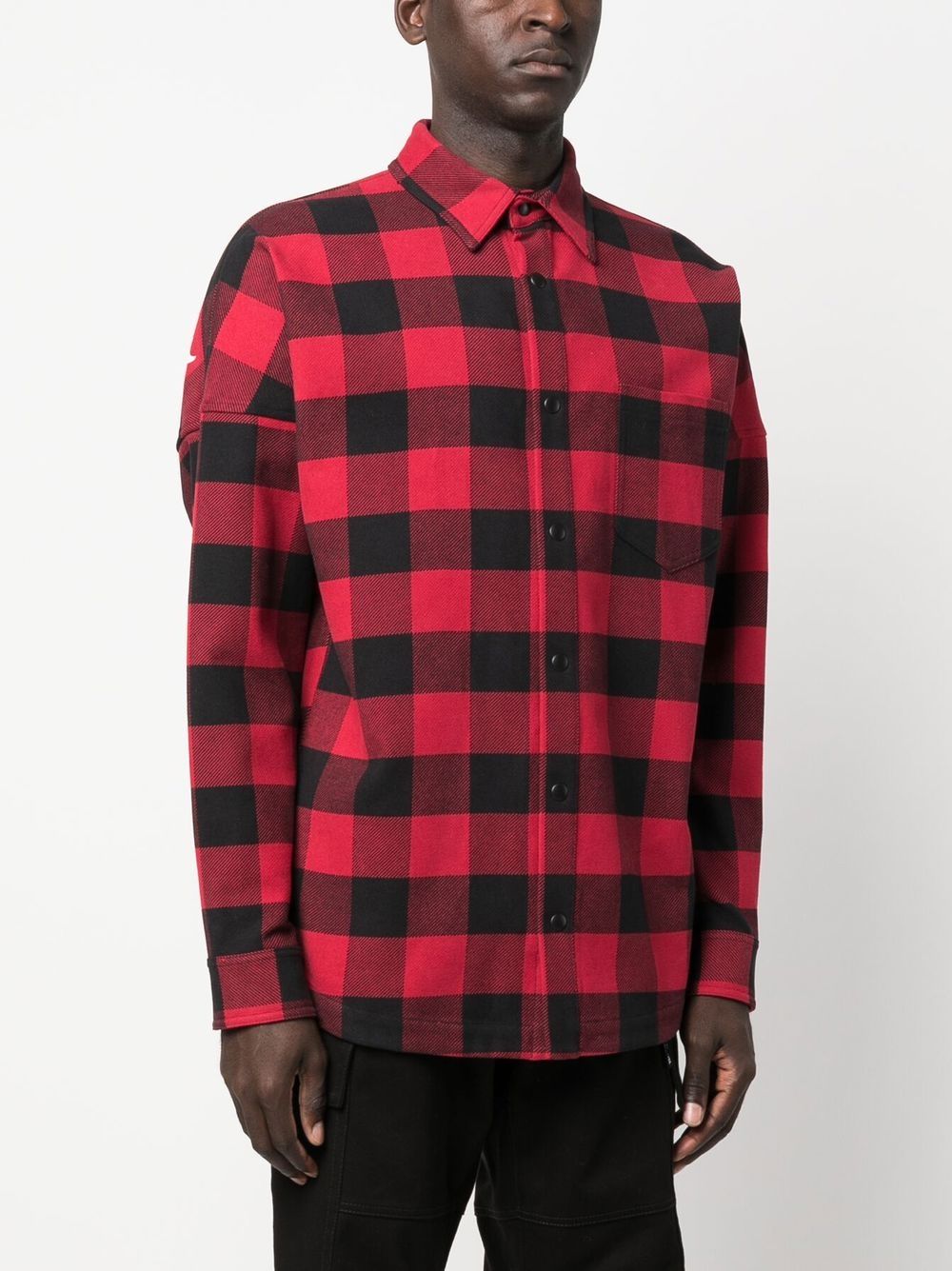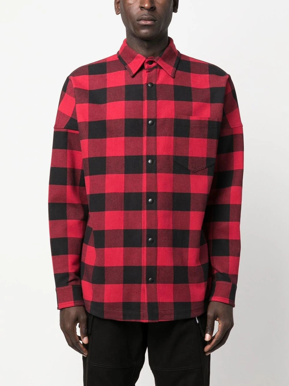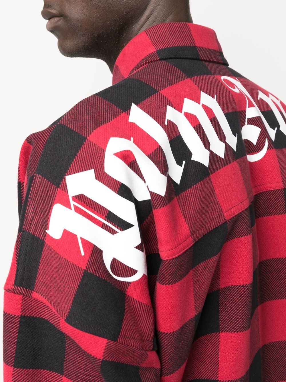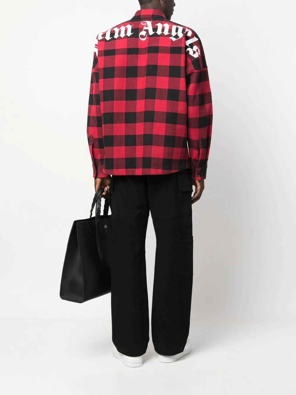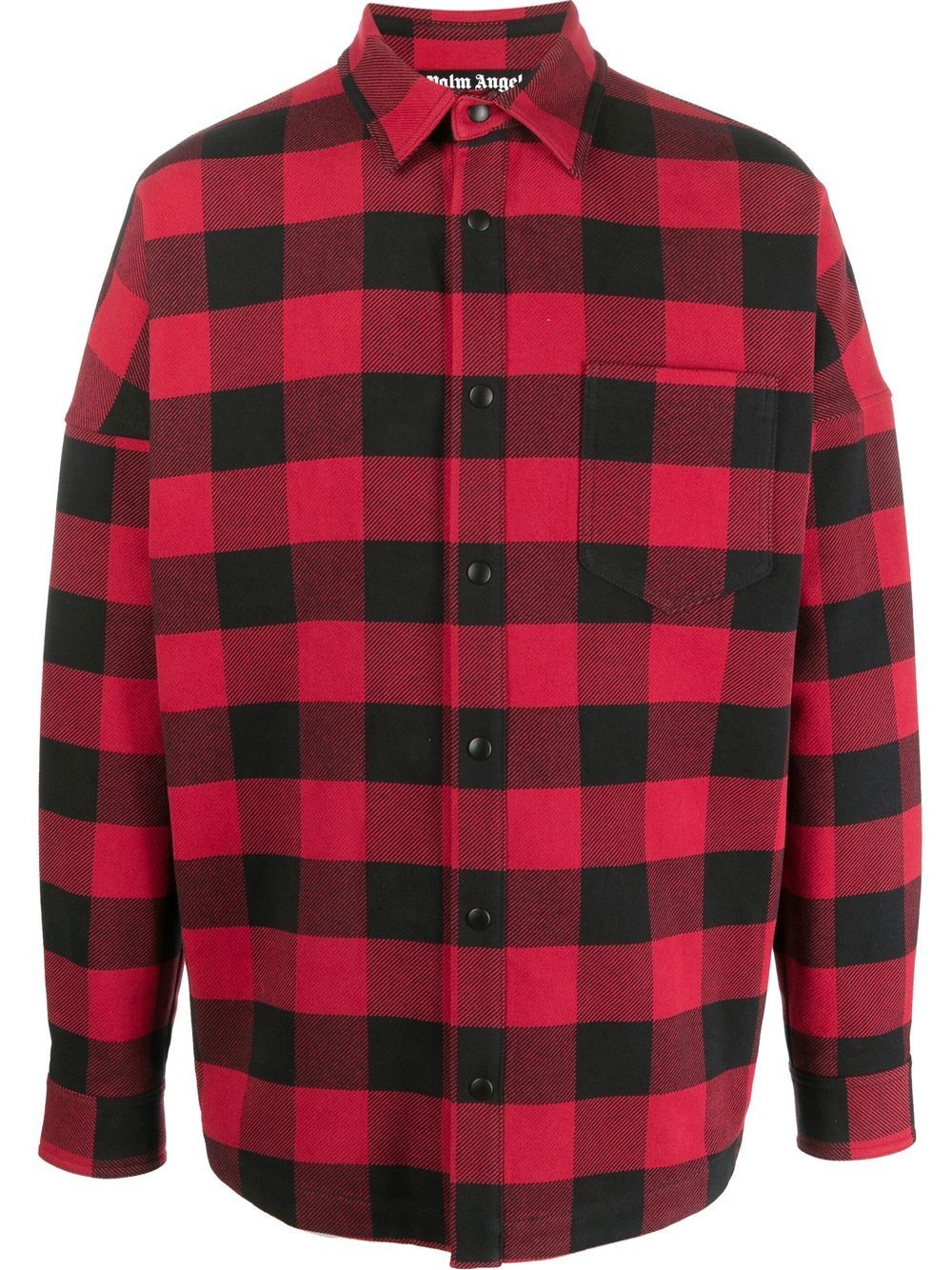 قميص منقوش بشعار من PALM ANGELS، يتميز باللون الأسود/الأحمر، مصنوع من القطن، بنقشة مربعات منقوش، وياقة كلاسيكية، وجيب على الصدر، وإغلاق بزر أمامي، وشعار مطبوع في الخلف، وحاشية منحنية وأكمام طويلة.