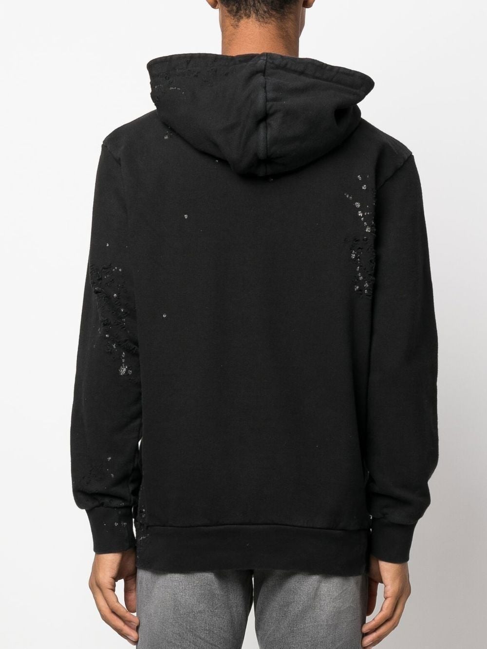قطن أسود بلمسة نهائية متهالكة، طباعة شعار على الصدر، تفاصيل لامعة، غطاء رأس كلاسيكي، كتف منسدل، أكمام طويلة، أساور مضلعة، جيب أمامي، حاشية مضلعة