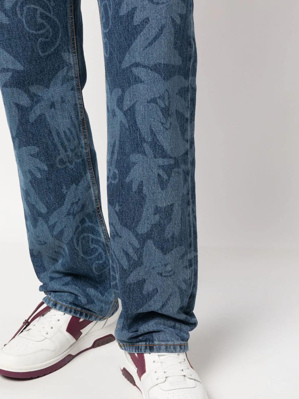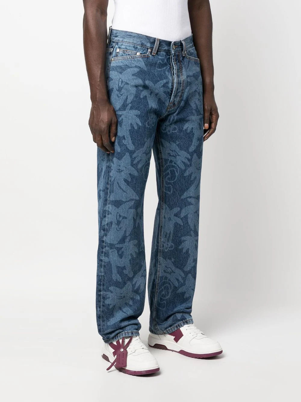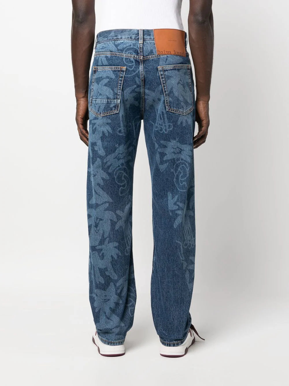 هذا الجينز، المزين بأشجار النخيل، يُبرز شغف بالم أنجلز بتصاميم لوس أنجلوس. مصنوع من قماش الدنيم الأزرق المتوسط بتفاصيل كلاسيكية - لاحظ تصميم الجيوب الخمسة ورقعة شعار العلامة التجارية.