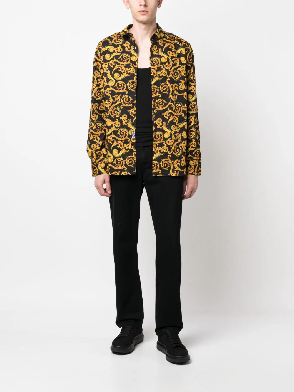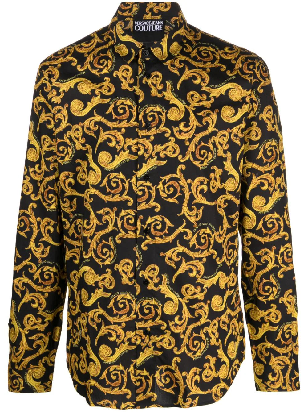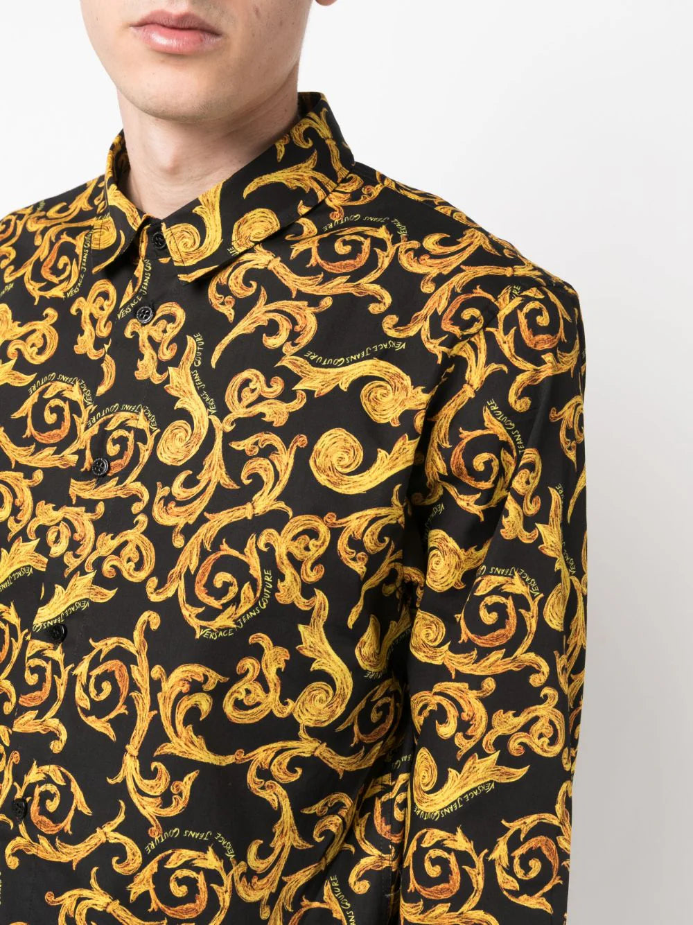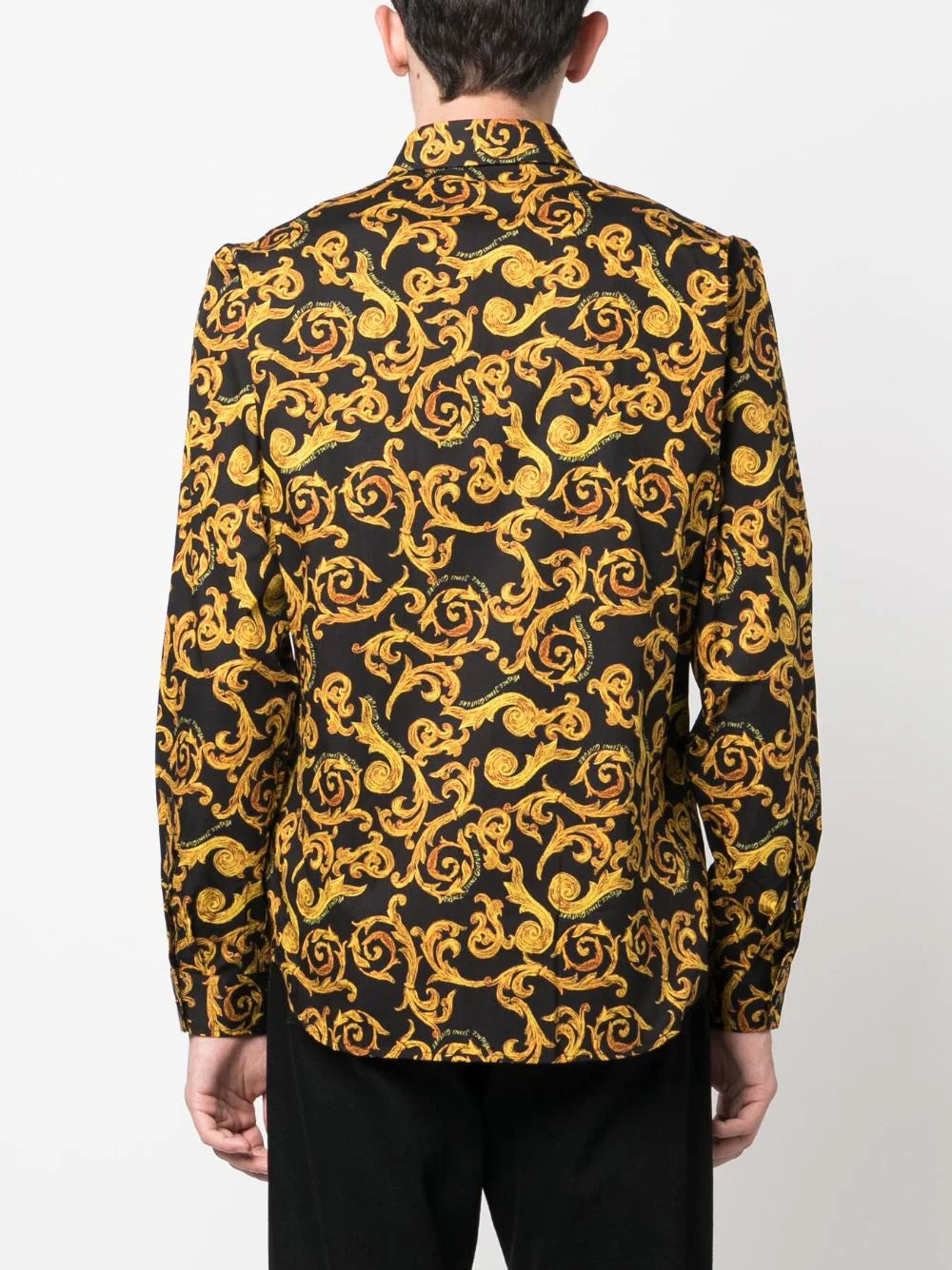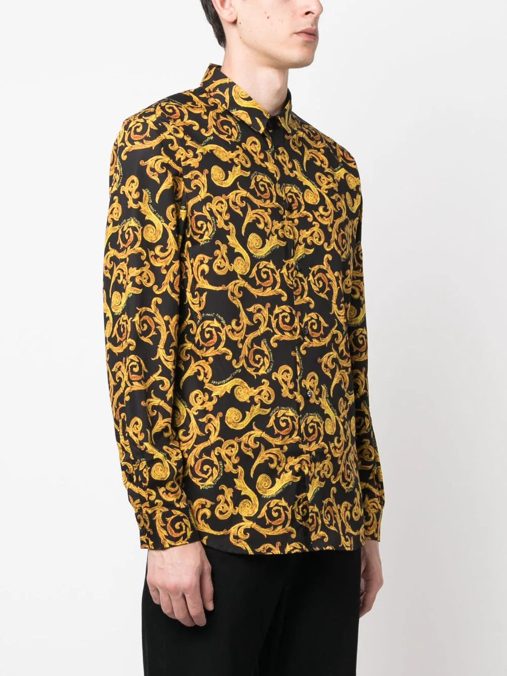 قميص فيرساتشي قطني بأكمام طويلة بطبعة باروكية، أسود/ذهبي