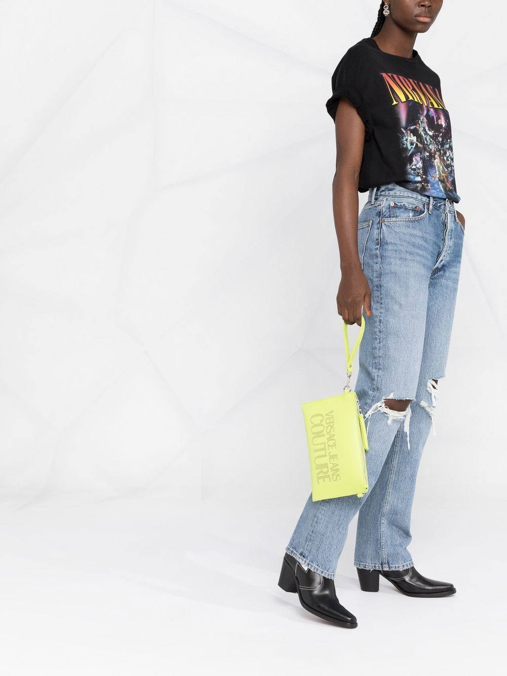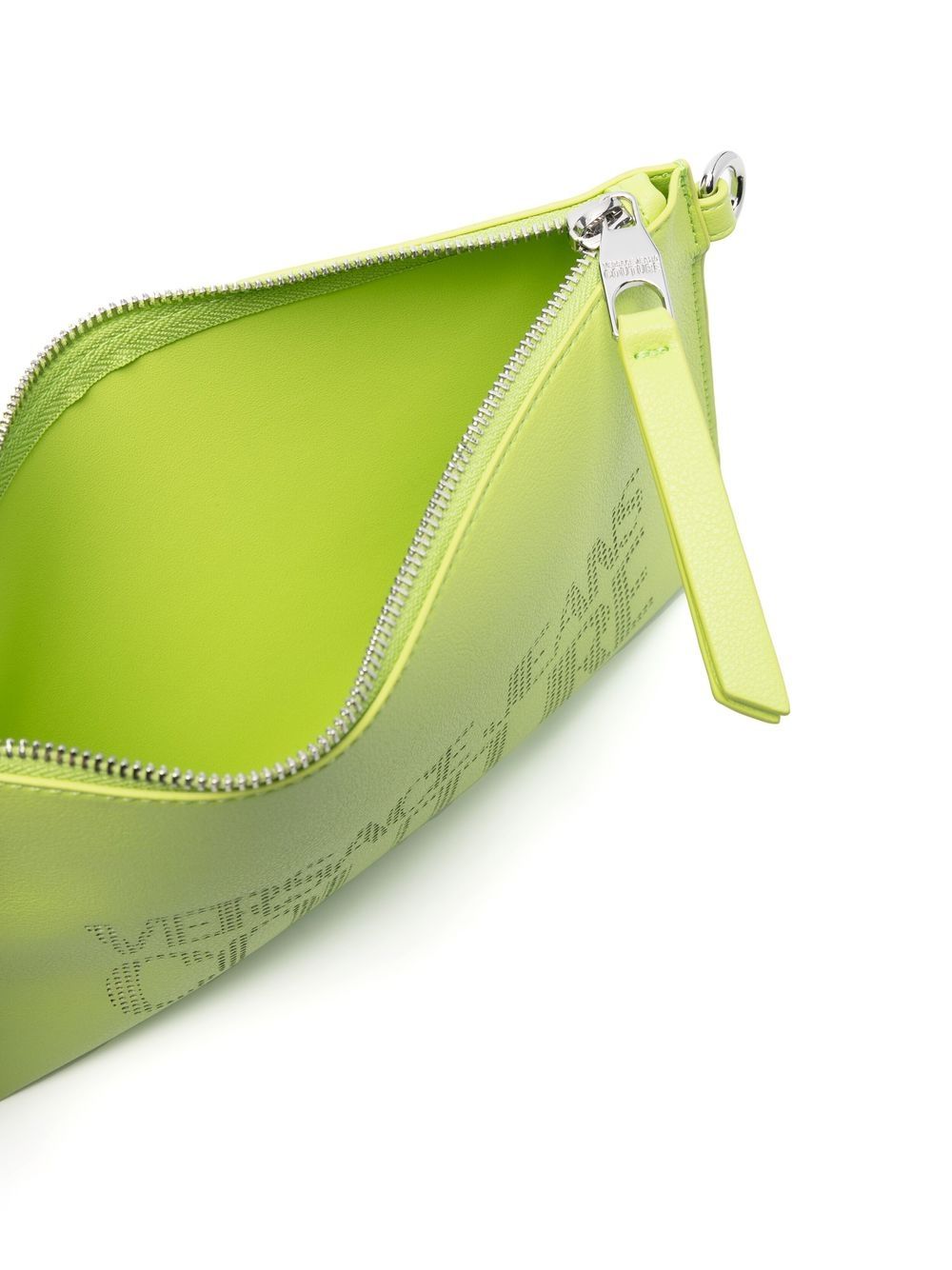 لموسم ربيع وصيف 2022، تُزيّن فيرساتشي جينز كوتور هذه الحقيبة الصغيرة المتقاطعة بشعارها المثقب. تُقدّم بلون أخضر حامض، وتُضفي الحروف المميزة لمسةً مميزةً تُجسّد هوية العلامة التجارية.
