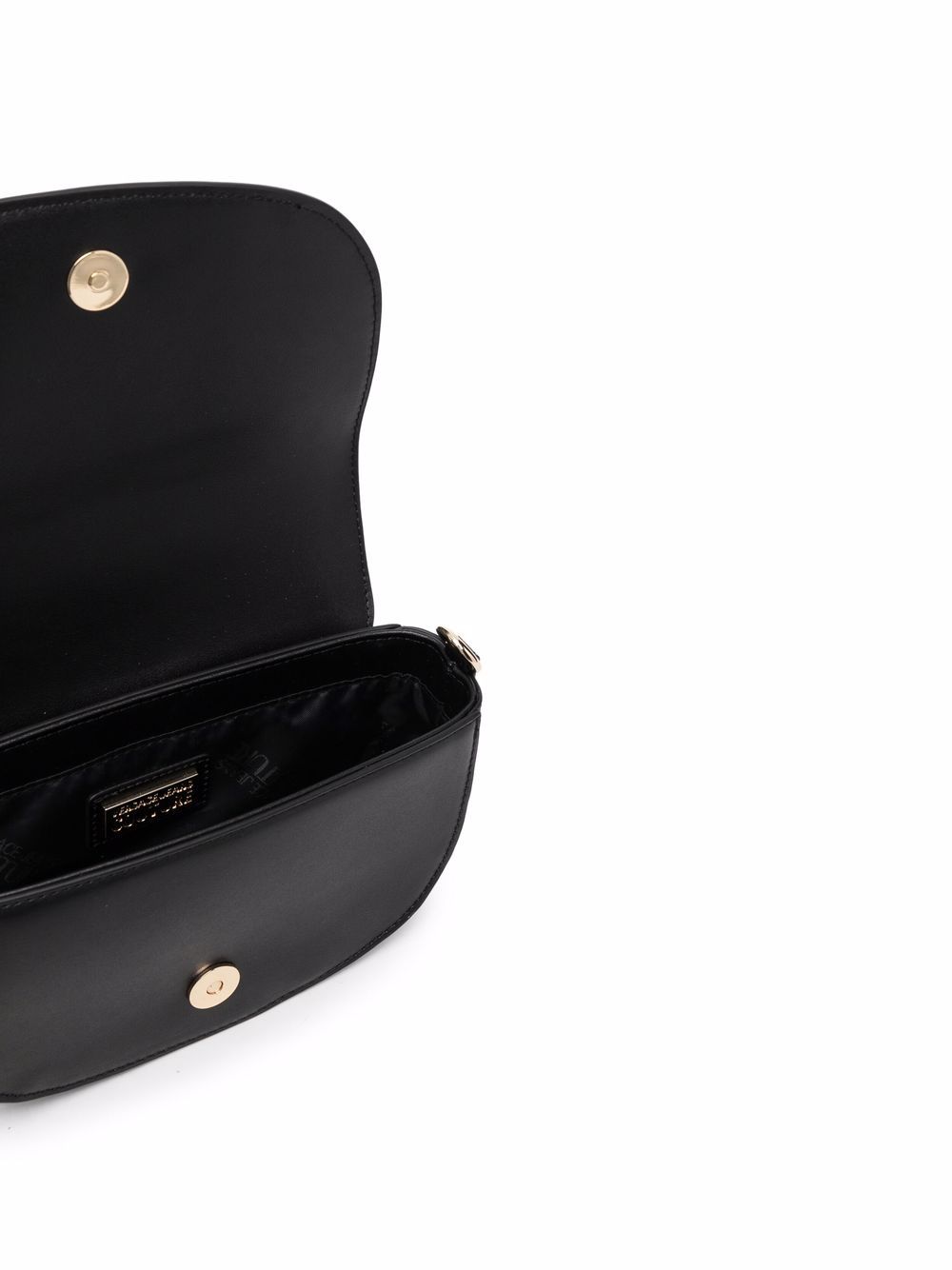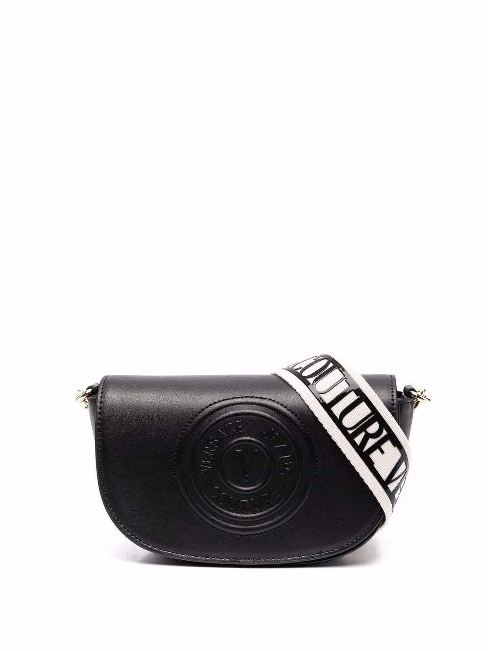 حقيبة كروس بودي من فيرساتشي جينز كوتور للنساء، سوداء اللون، مزينة بشعار منقوش
