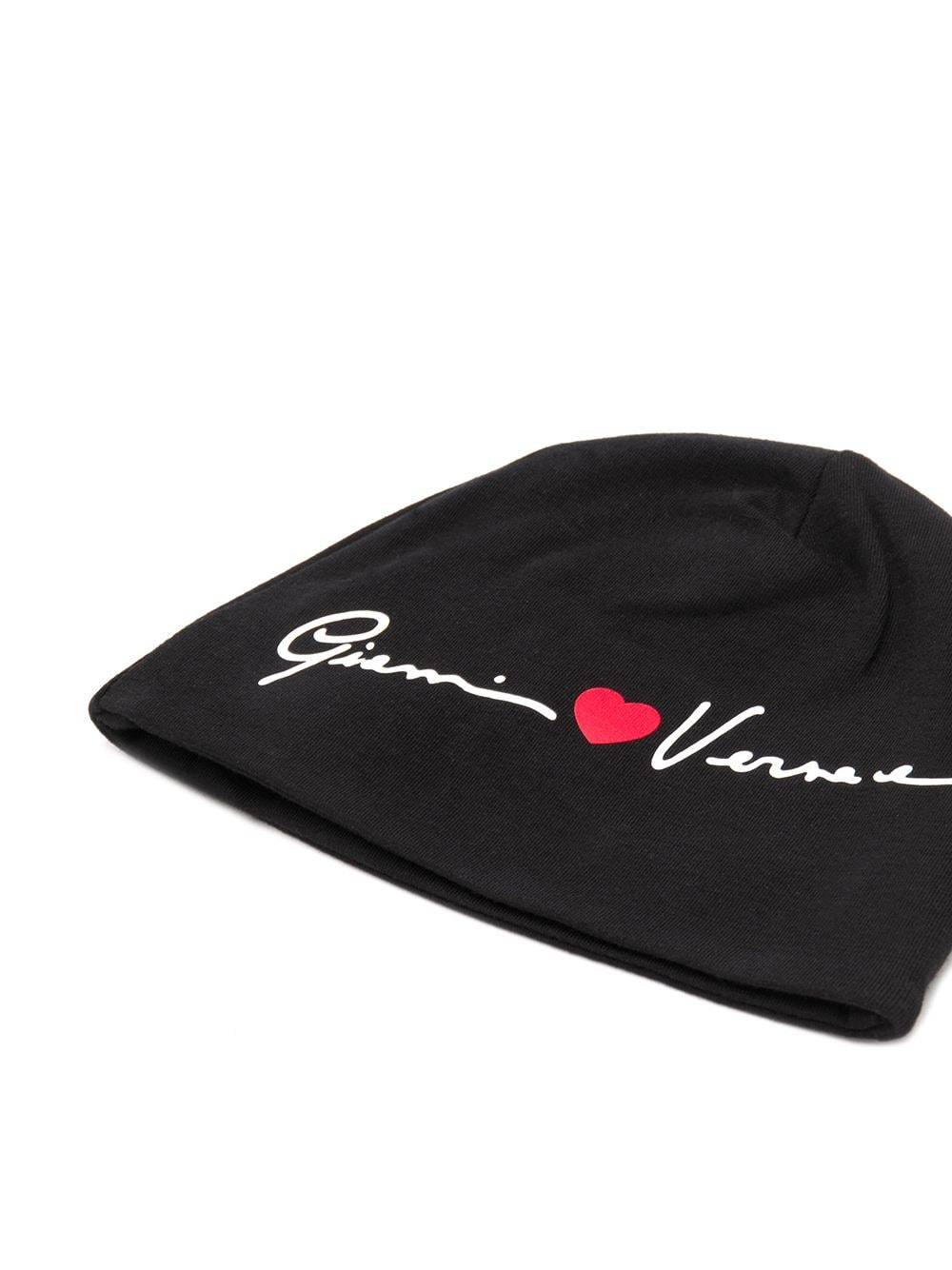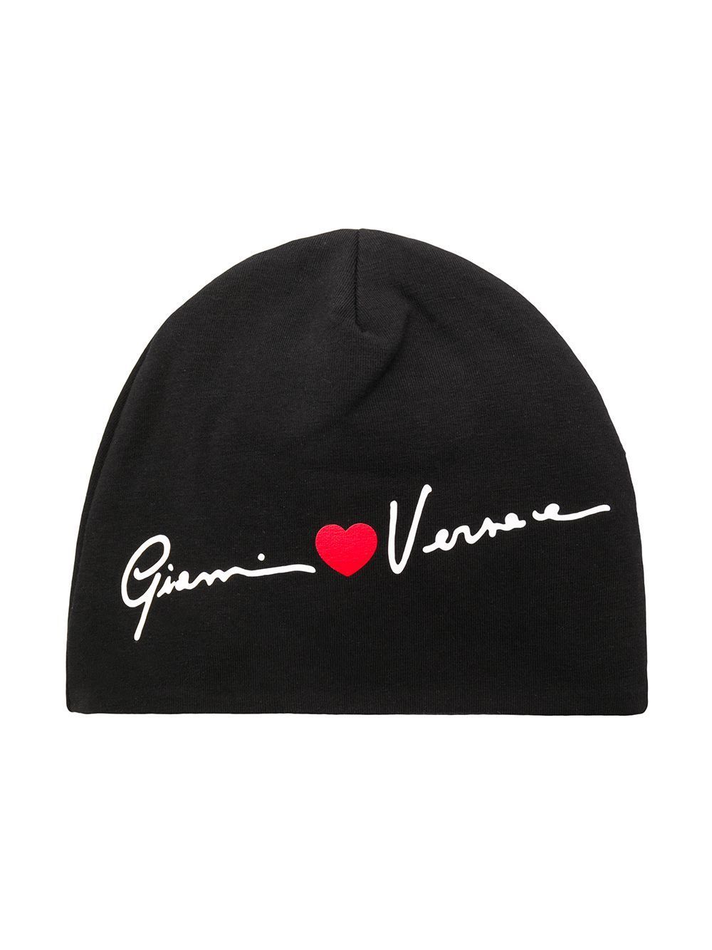 قبعة مطبوعة بقلب من مزيج القطن باللونين الأسود والأبيض والأحمر من YOUNG VERSACE تتميز بحياكة دقيقة وشعار مطبوع وتصميم سهل الارتداء.