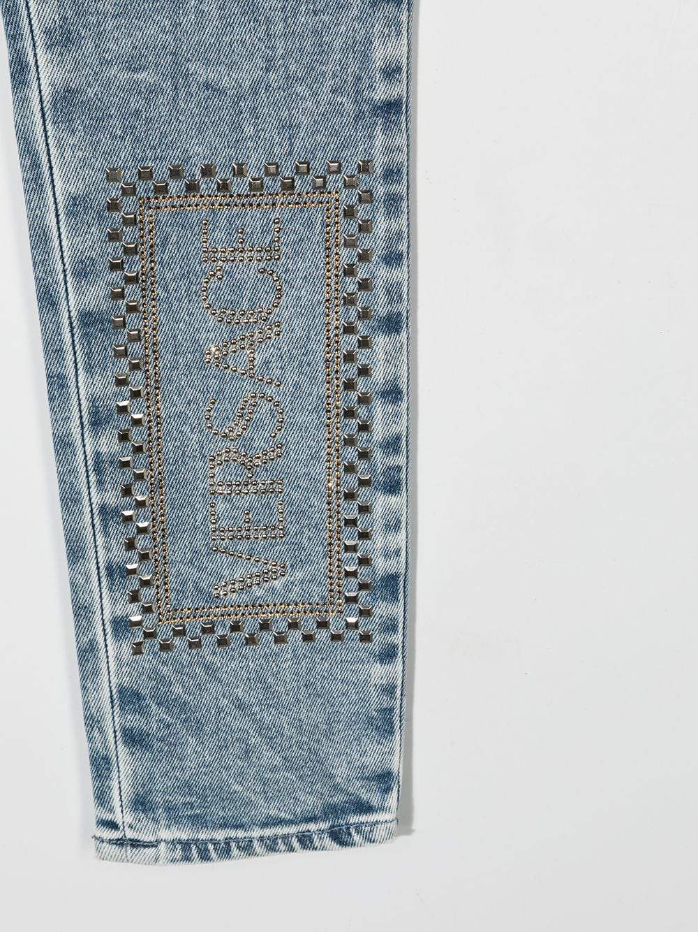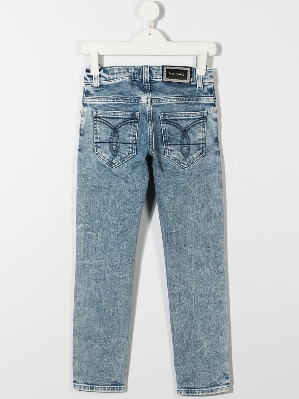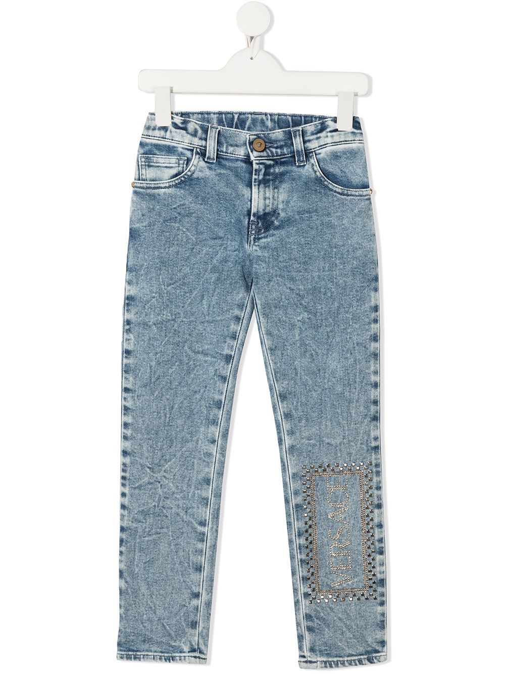 بنطلون جينز فيرساتشي كيدز بشعار مرصع بأحجار الراين باللون الأزرق