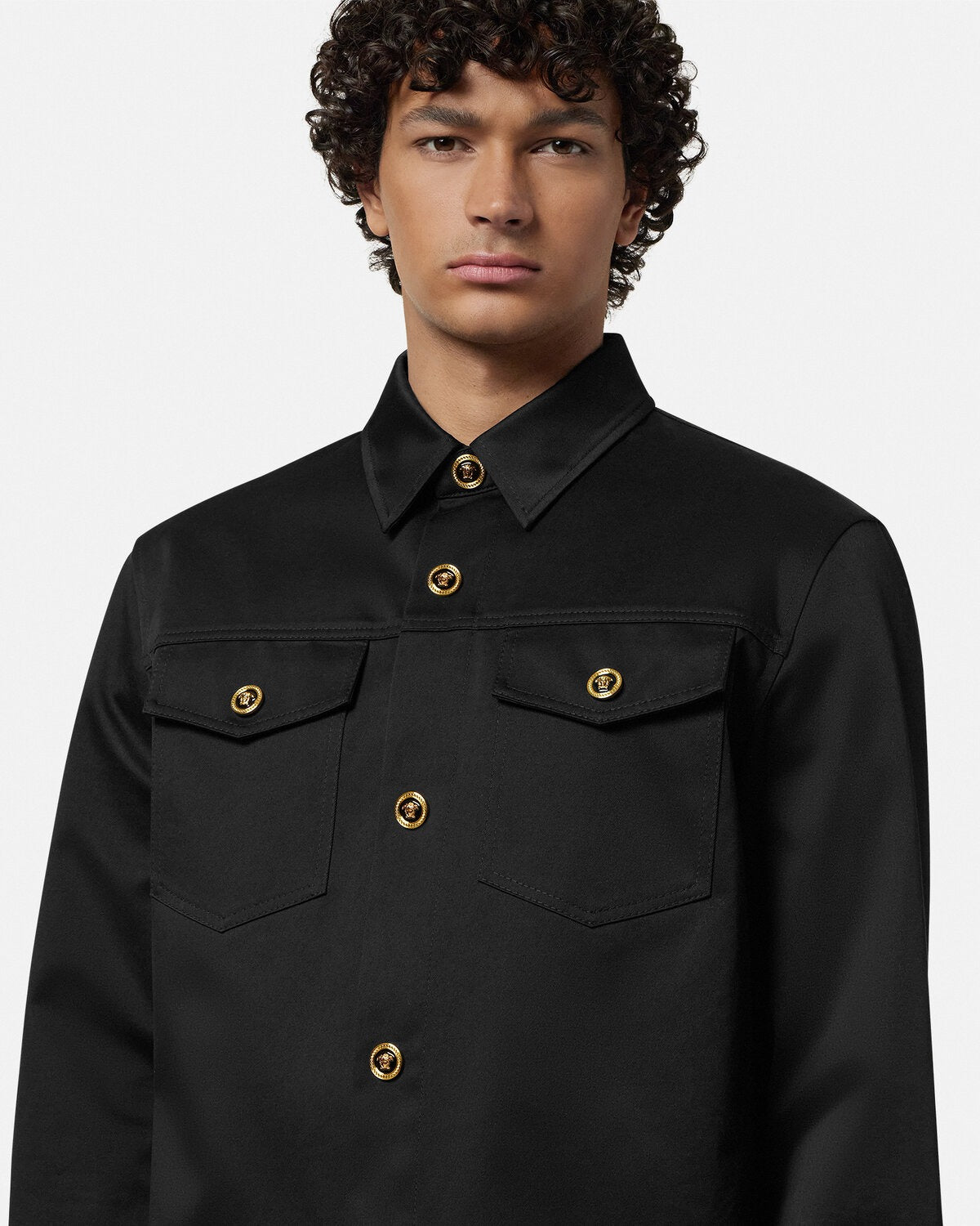 يتميز هذا القميص الخارجي المصنوع من قماش الغبردين القطني بأزرار ميدوسا المطلية بالمينا ويتميز بجيوب أمامية ذات غطاء.