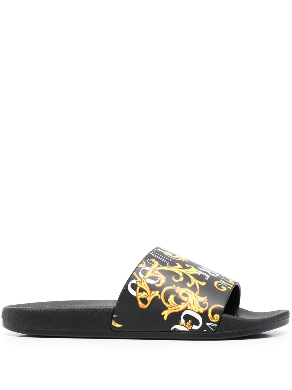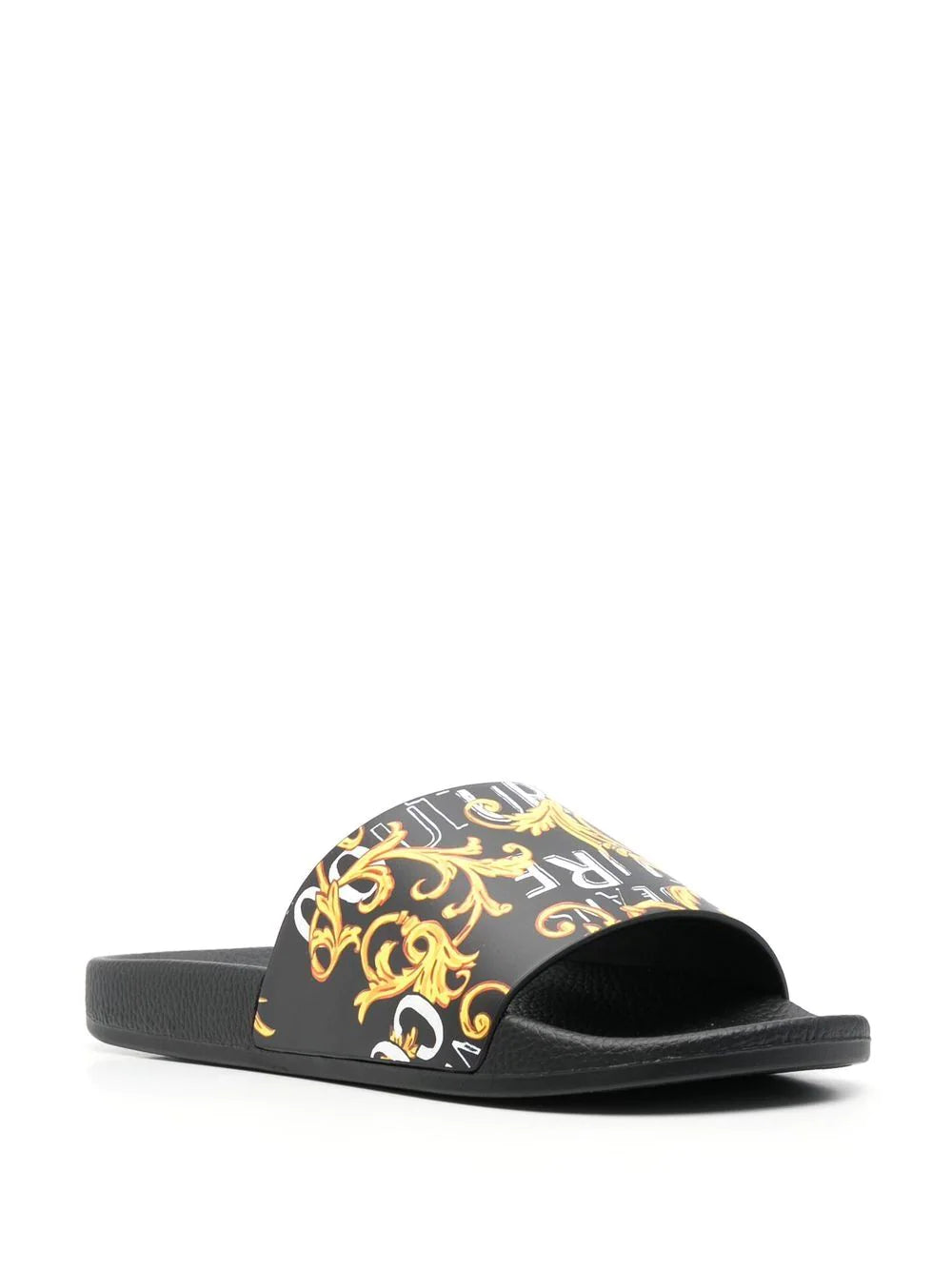 شبشب بطبعة "Barocco" من VERSACE JEANS COUTURE يتميز باللون الأبيض الحليبي واللون الذهبي وطبعة Barocco المميزة وطباعة الشعار على الجهة الأمامية والنعل الداخلي الذي يحمل العلامة التجارية والنعل المطاطي المسطح.