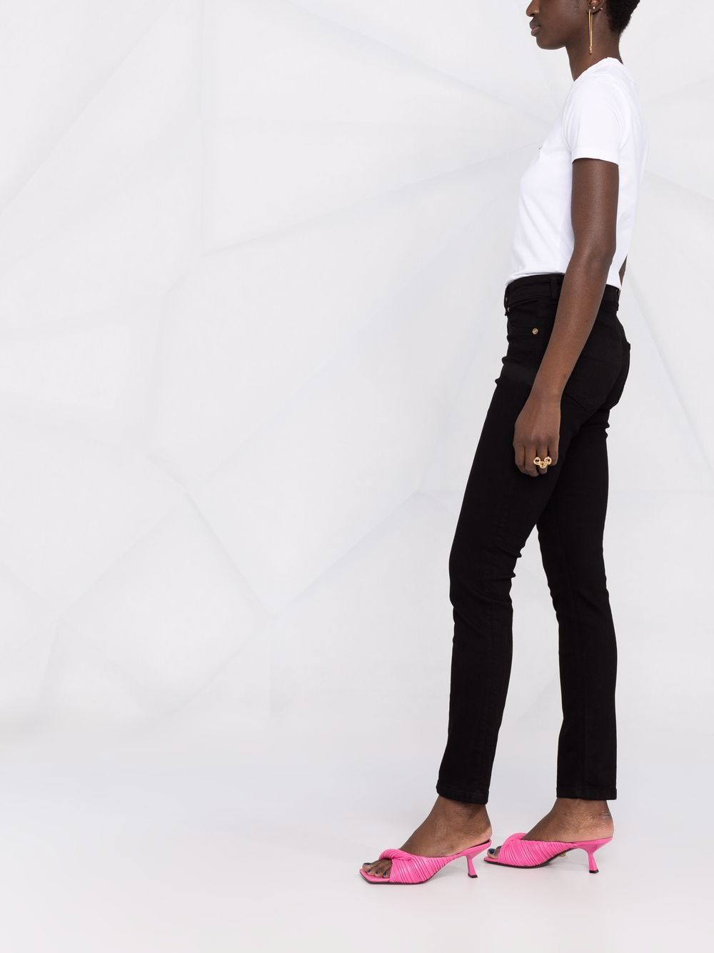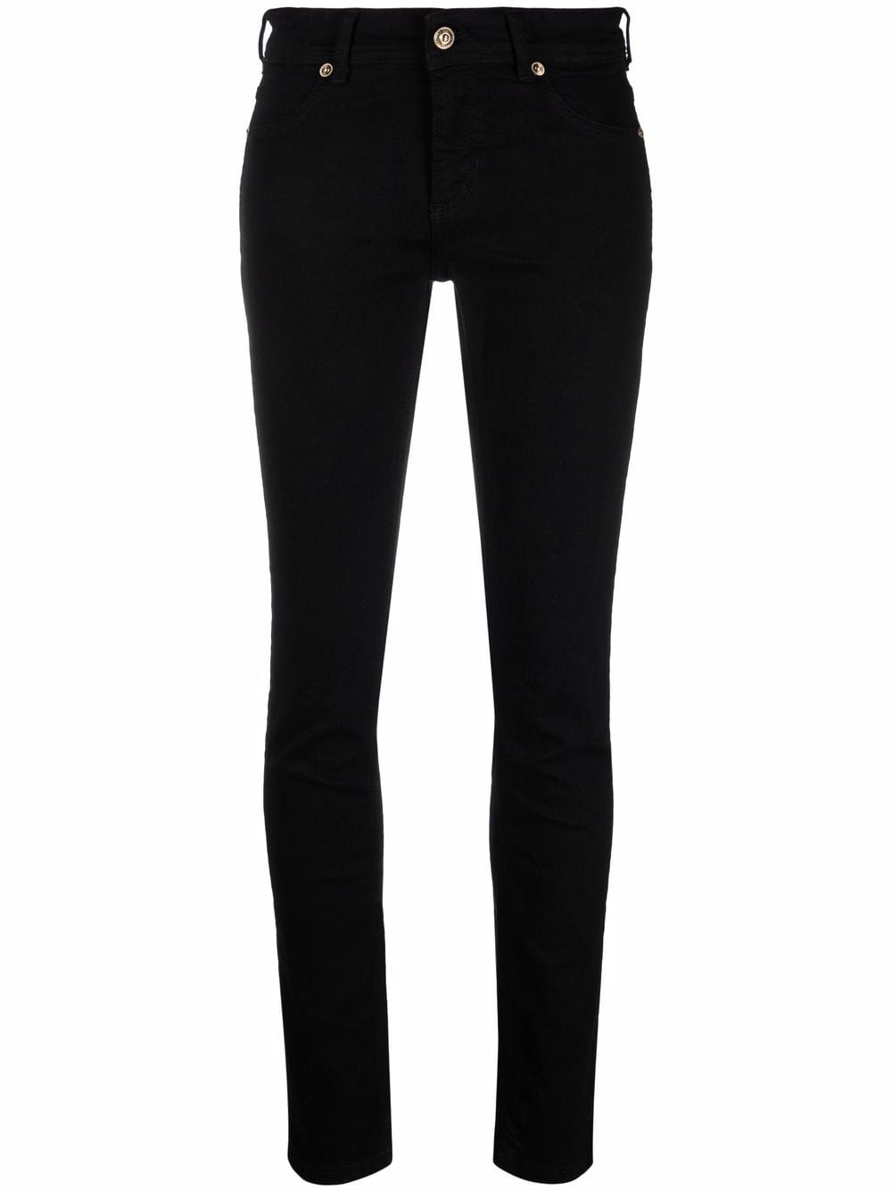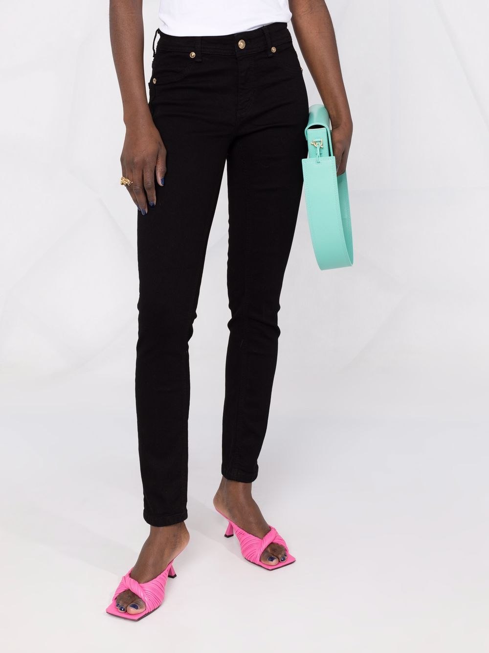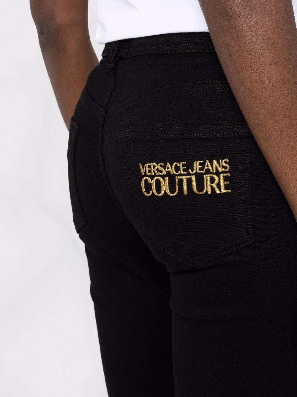 مصنوع من قماش الدنيم الأسود، يتميز هذا الجينز من Versace Jeans Couture بارتفاع متوسط وقصة ضيقة بينما يزين شعار مطرز الجيب الخلفي.