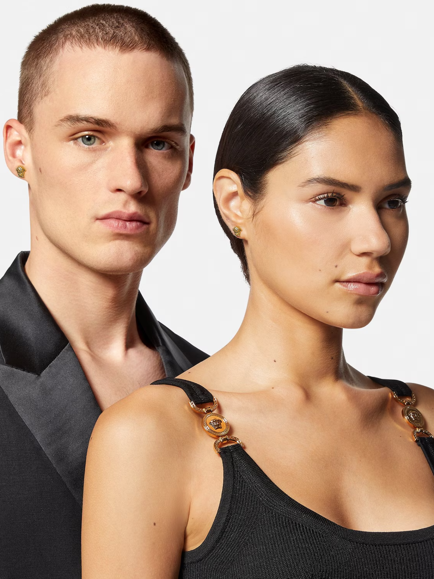 VERSACE WOMEN Medusa Stud Logo Engraved Earrings Gold