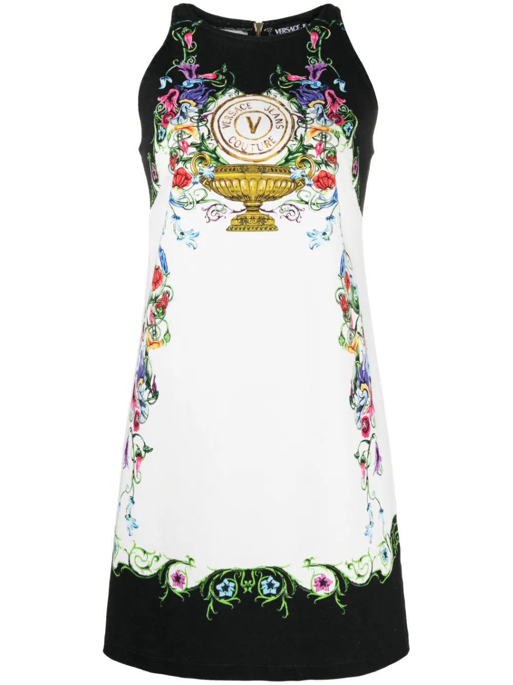 فستان فيرساتشي ميني بطبعة شعار الحديقة للنساء - أبيض، أسود، متعدد الألوان