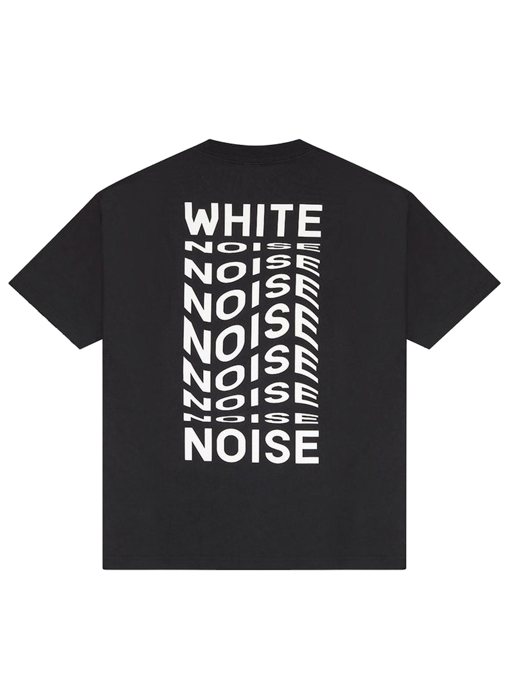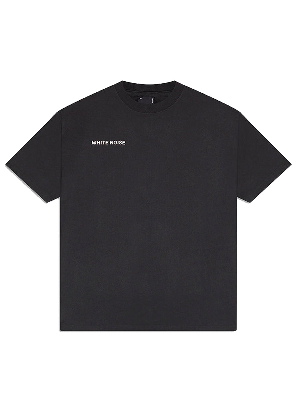 تيشيرت "BRANDED GRAPHIC T-SHIRT" باللون الأسود، مصنوع من قماش جيرسي فاخر متوسط الوزن، بقصّة مريحة. يتميز بشعار WHITE NOISE™ على الصدر وشعار مشوّه على الظهر.
